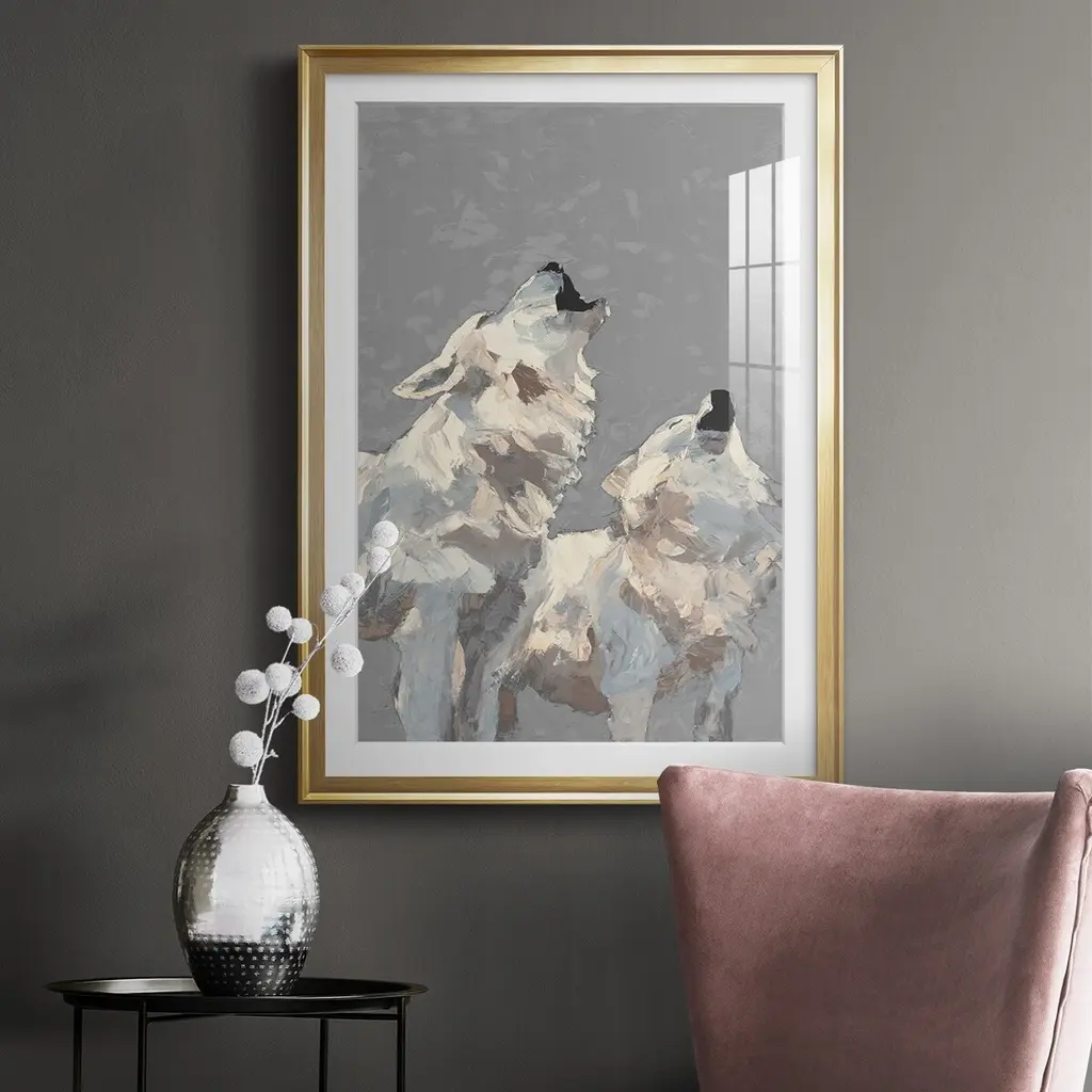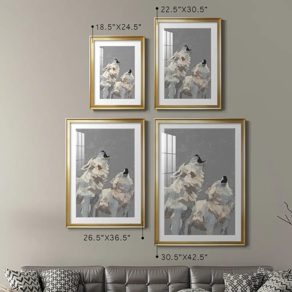 Midnight Wolves Premium Framed Print - Ready to Hang A Premium Framed Print created to last. Framed in distressed wood and available in an array of sizes and colors Featuring a beveled a solid wood stretcher bar, each piece comes ready to hand 4 SIZES AVAILABLE 30.5''X42.5'' - Overall Size 26.5'X36.5'' - Overall Size 22.5''x30.5'' - Overall Size 18.5''x24.5'' - Overall Size Each piece is made to order. Each piece comes with hanging hardware. Made in the USA Ready to Hang Giclee Paper Print Acrylic Glass Beveled Matt Board