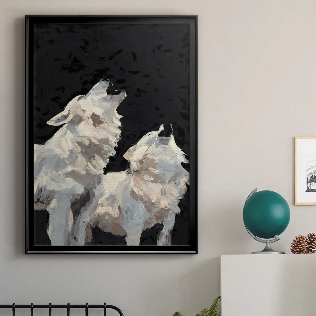Midnight Wolves Premium Framed Print - Ready to Hang A Premium Framed Print created to last. Framed in distressed wood and available in an array of sizes and colors Featuring a beveled a solid wood stretcher bar, each piece comes ready to hand 4 SIZES AVAILABLE 30.5''X42.5'' - Overall Size 26.5'X36.5'' - Overall Size 22.5''x30.5'' - Overall Size 18.5''x24.5'' - Overall Size Each piece is made to order. Each piece comes with hanging hardware. Made in the USA Ready to Hang