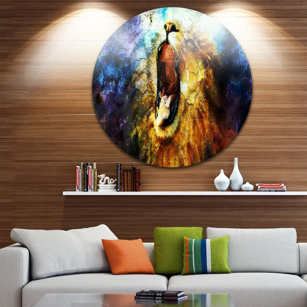 Bring Contemporary Abstraction to your home with this large Circle Metal wall art. This Mighty Lion Emerging Metal Artwork makes it the focal point of any room or office. - White Gloss Coating ensures colors are extra vibrant with light reflection.- Aluminum grade Sheet Metal with 1 inch mounting frame on the back giving the illusion that the artwork is floating on the wall..- Mounting Brackets are included along with instructions.- High Quality Digital images are created directly into a glossy aluminum panel producing a stunning and captivating print into the glossy finish of the metal.- Water, Fire and Scratch resistant HD Aluminum panels.- Looks better than any photo paper and guaranteed to last at least 20 years- Easy to clean with a microfiber cloth. Colors are far superior to regular Canvas Art. - Easy to Hang