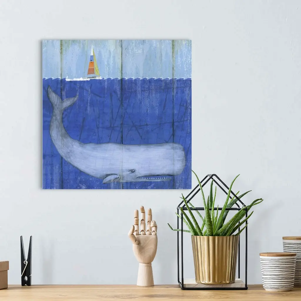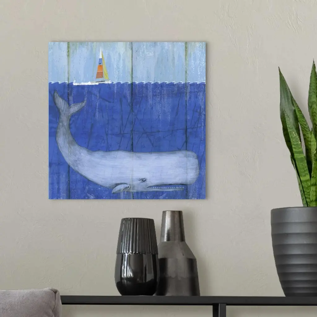 Contemporary nautical painting of a cross section of an ocean scene with a giant whale below the surface of the water.