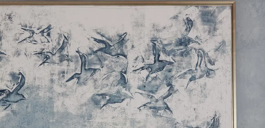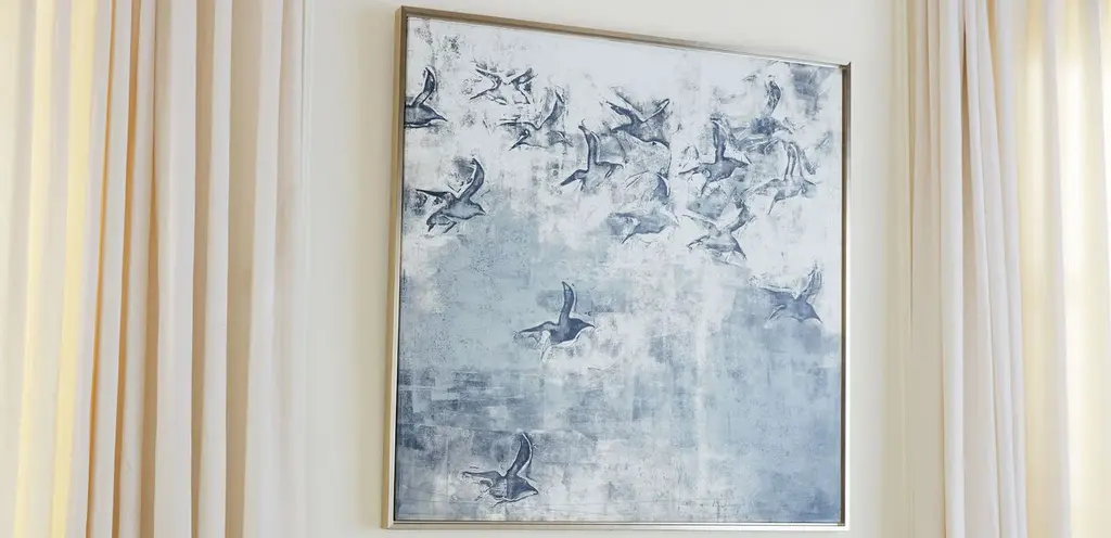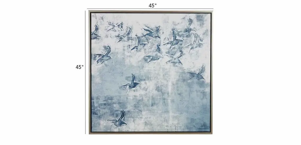 Inspired by a cloud of fluttering birds, this large-scale giclée captures the energy of birds in motion on a beautifully framed canvas. Simple silhouettes of migrating birds dance against an abstract sky of blue and ivory for an image rich in color and dimension. Set in a simple, pale gold frame, this bird artwork adds an elegant, nature-inspired vibe to modern or traditional settings.