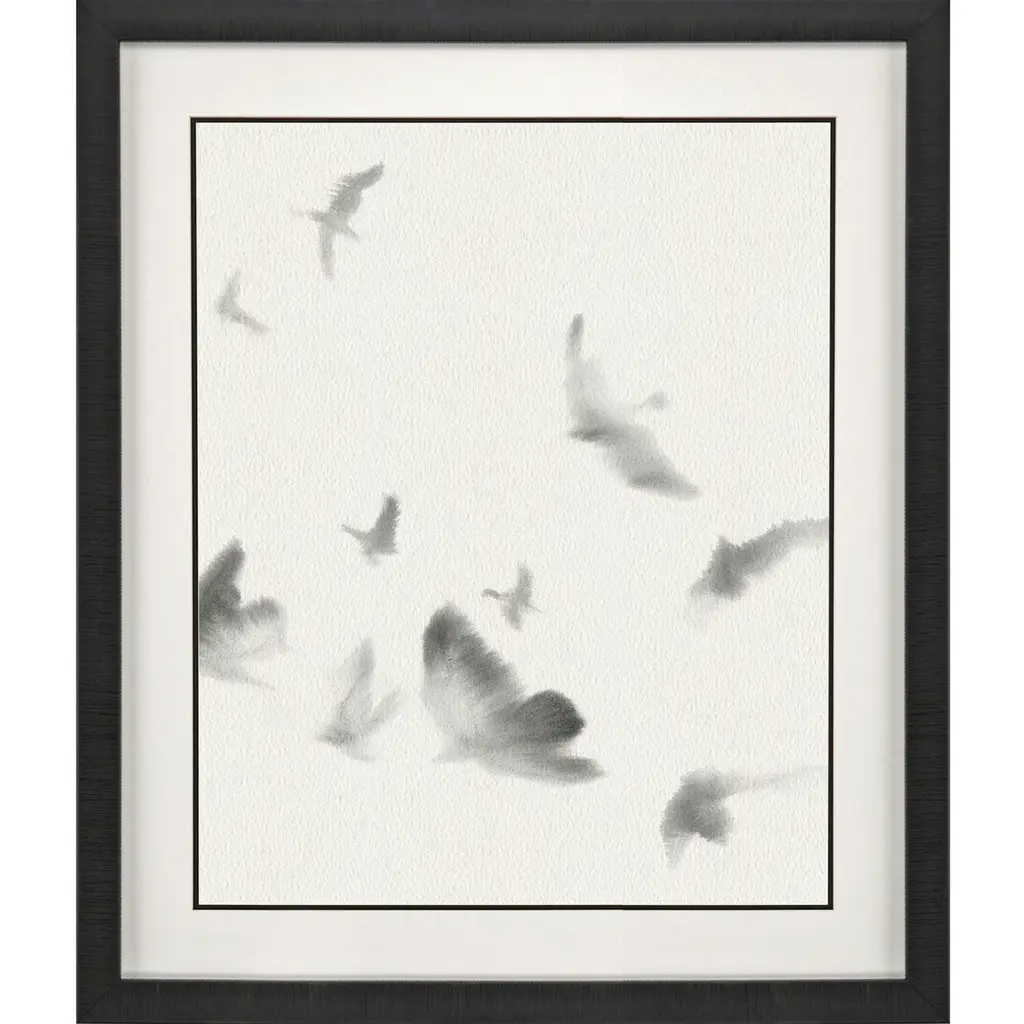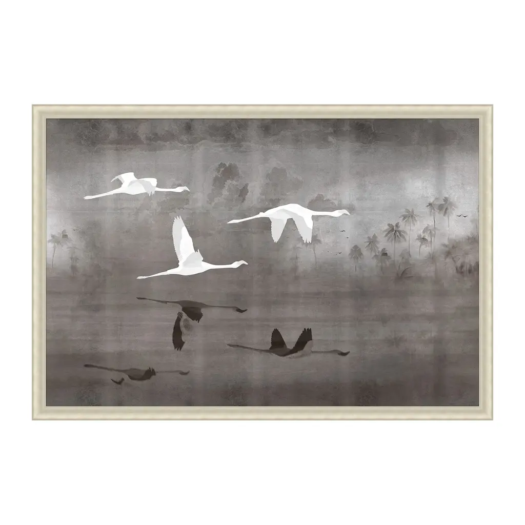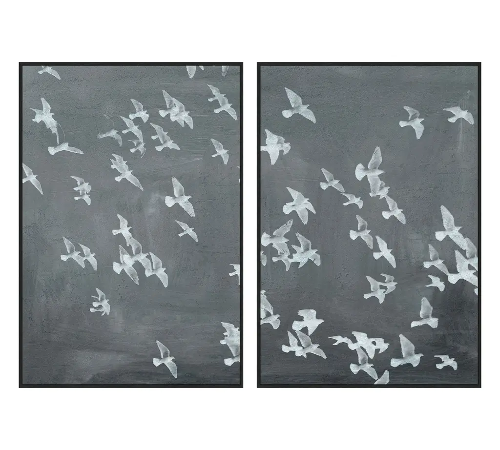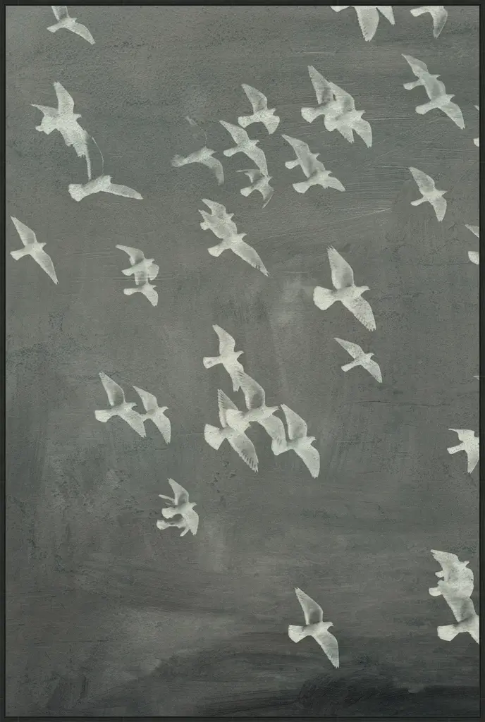 Birds in flight on a tonal field evoke a graceful lightness in this wall print. The minimalist palette makes this large-scale wall art the perfect feature for an edited space where grounded design inspires modern appeal. This print is reproduced on raw canvas for texture and depth on your wall.