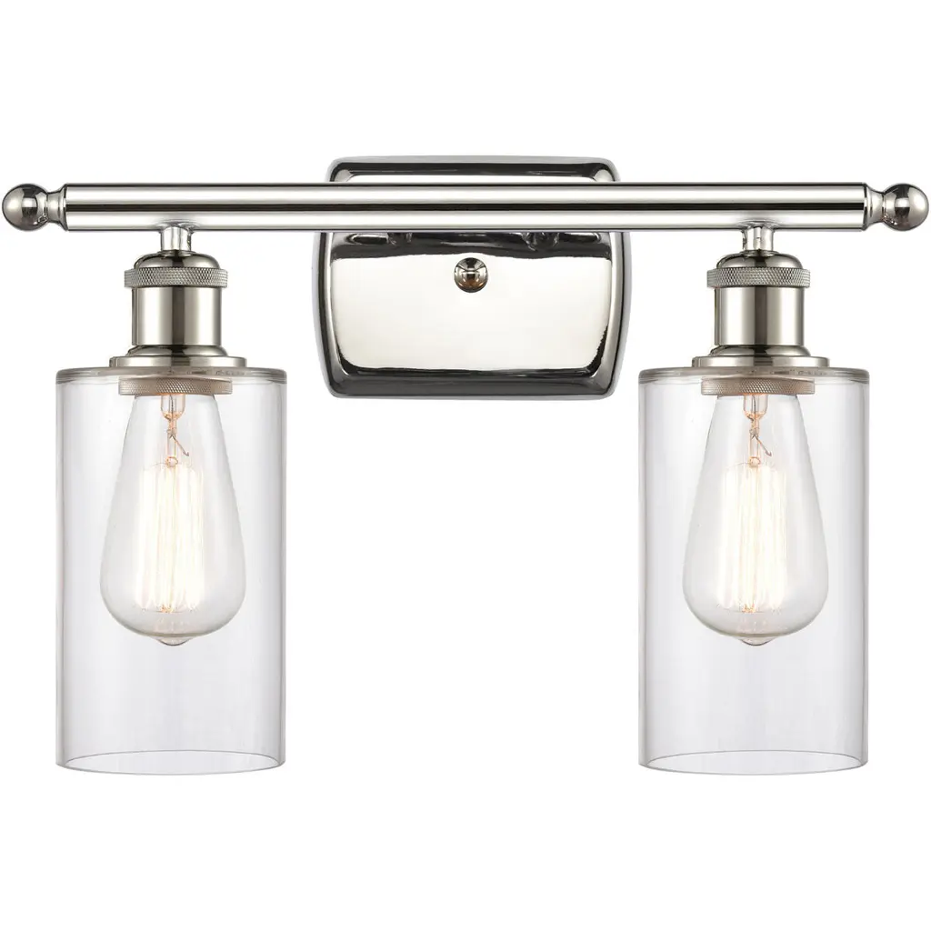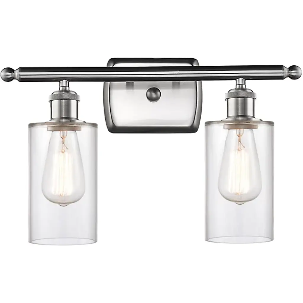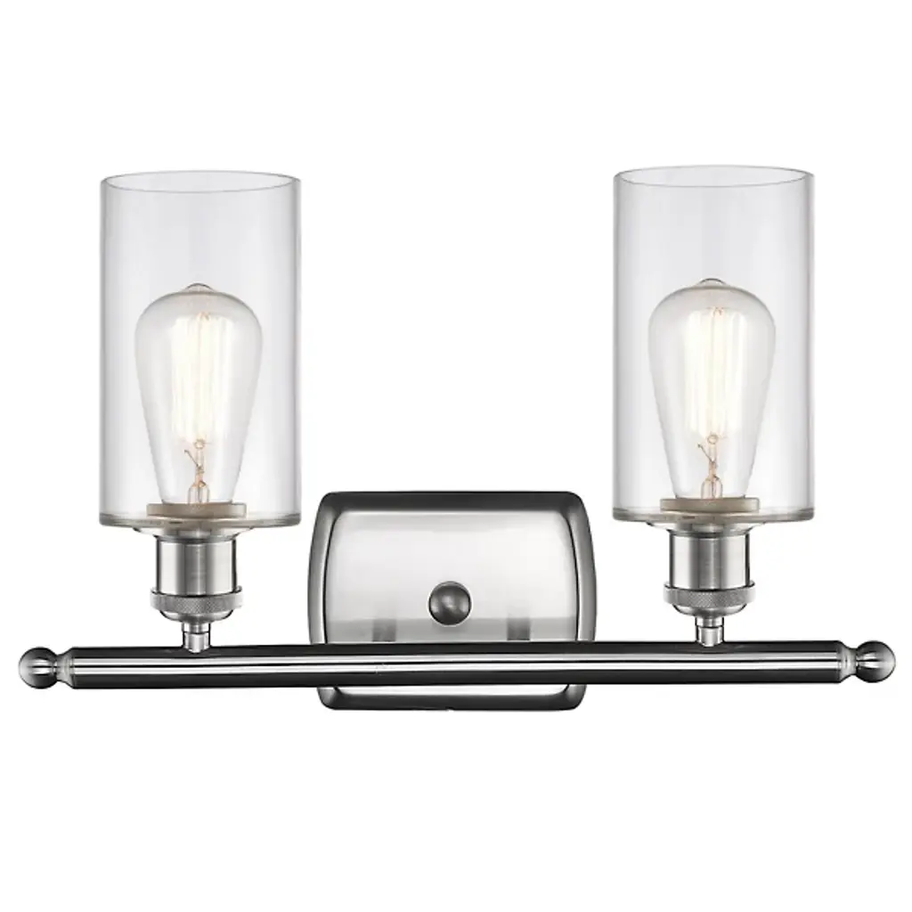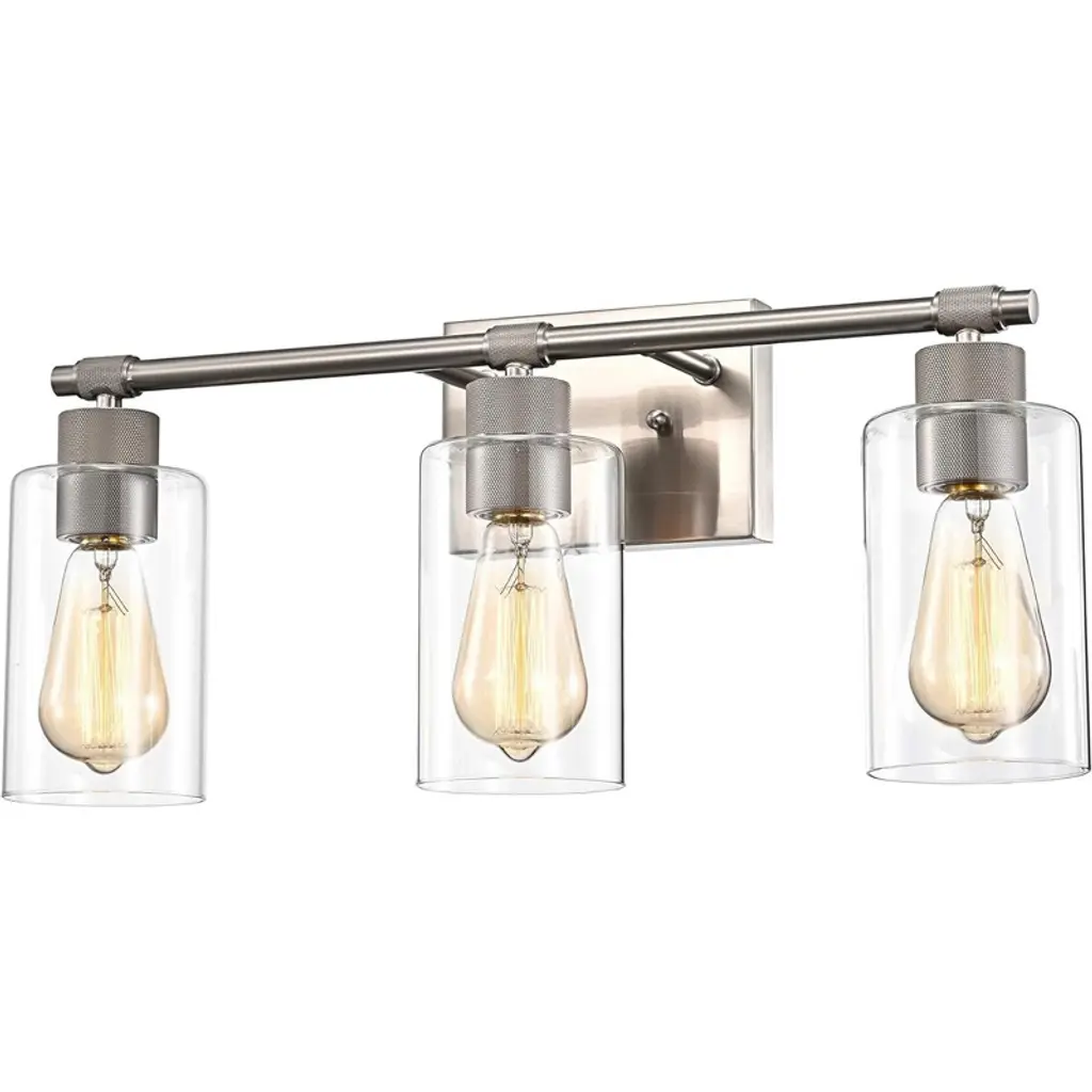 Lend a sleek, open appeal to walls with the Mikayla Vanity Light from Alder & Ore. A rectangular wall plate with rounded, beveled edges anchors the fixture, using two short stems to extend a slender crossbar capped by round accents at each end. Illumination is provided by a single socket housing accented by dual, knurled bands that extends damp-listed lamping downward from each end, ringed by a cylindrical shade of clear glass that dispenses a mix of focused task lighting and even ambiance around it.