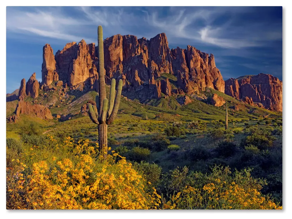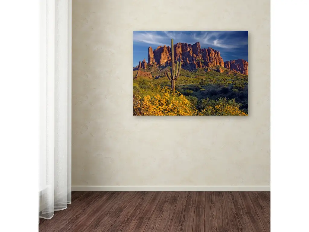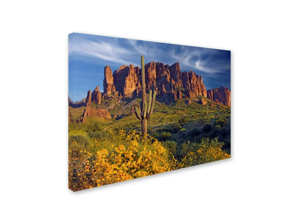 Artist: Mike Jones PhotoSubject: LandscapeStyle: Natural ModernProduct Type: Gallery-Wrapped Canvas ArtMade in USAThis ready to hang, gallery-wrapped art piece features a cactus in the center of the frame with a mountain in the distance.Mike's love of photography started at age 10 when his father taught him how to use his old Pentax SLR camera. By the time he graduated high school, he had also graduated from his 35mm Pentax, to an old 4x5 Graflex camera. From the beginning, landscapes were his true passion. During Summer vacations in Maine, Mike would choose to climb around the rocky shore with a camera and tripod instead of shopping with his family in downtown Bar Harbor. He soon landed a job shooting photos for a local newspaper where he continued to work while studying photography in college.Giclee (jee-clay) is an advanced printmaking process for creating high quality fine art reproductions. The attainable excellence that Giclee printmaking affords makes the reproduction virtually indistinguishable from the original piece. The result is wide acceptance of Giclee by galleries, museums, and private collectors. Gallery wrap is a method of stretching an artist's canvas so that the canvas wraps around the sides and is secured a hidden, wooden frame. This method of stretching and preparing a canvas allows for a frameless presentation of the finished painting.