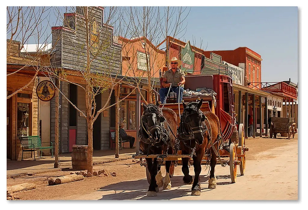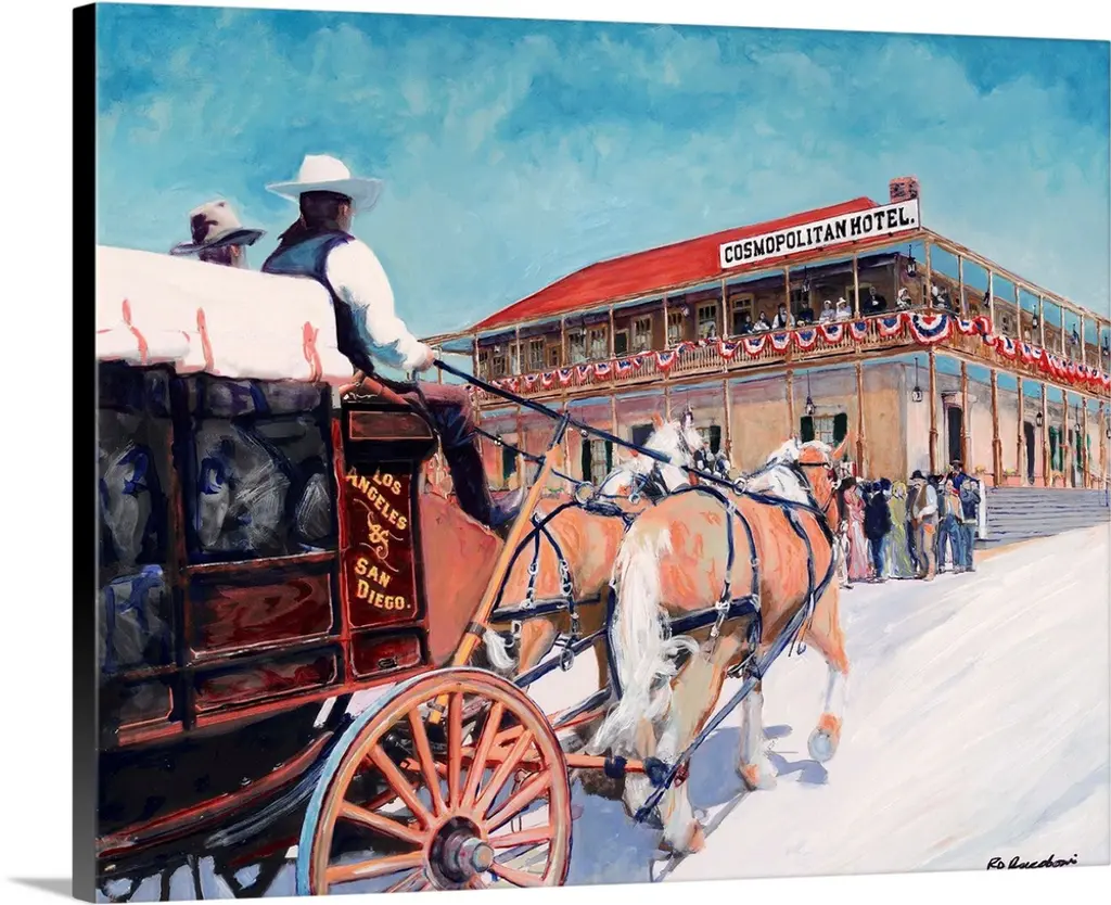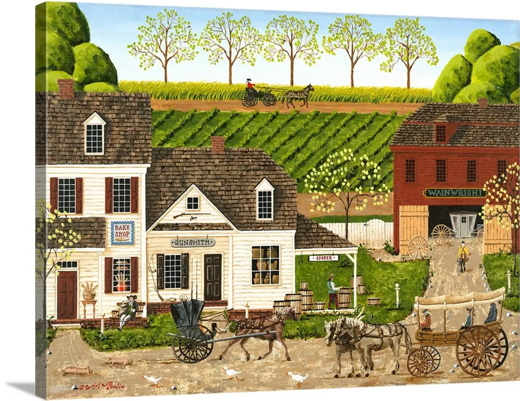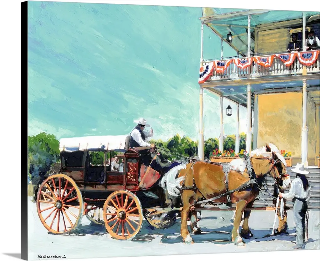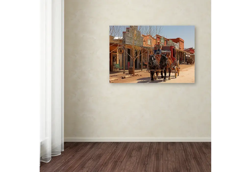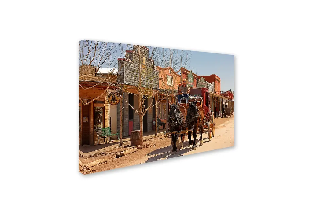 Artist: Mike Jones PhotoSubject: AnimalsStyle: TraditionalProduct Type: Gallery-Wrapped Canvas ArtMade in USAThis ready to hang, gallery-wrapped art piece features two horses pulling a buggy through a dirt road.Mike's love of photography started at age 10 when his father taught him how to use his old Pentax SLR camera. By the time he graduated high school, he had also graduated from his 35mm Pentax, to an old 4x5 Graflex camera. From the beginning, landscapes were his true passion. During Summer vacations in Maine, Mike would choose to climb around the rocky shore with a camera and tripod instead of shopping with his family in downtown Bar Harbor. He soon landed a job shooting photos for a local newspaper where he continued to work while studying photography in college.Giclee (jee-clay) is an advanced printmaking process for creating high quality fine art reproductions. The attainable excellence that Giclee printmaking affords makes the reproduction virtually indistinguishable from the original piece. The result is wide acceptance of Giclee by galleries, museums, and private collectors. Gallery wrap is a method of stretching an artist's canvas so that the canvas wraps around the sides and is secured a hidden, wooden frame. This method of stretching and preparing a canvas allows for a frameless presentation of the finished painting.