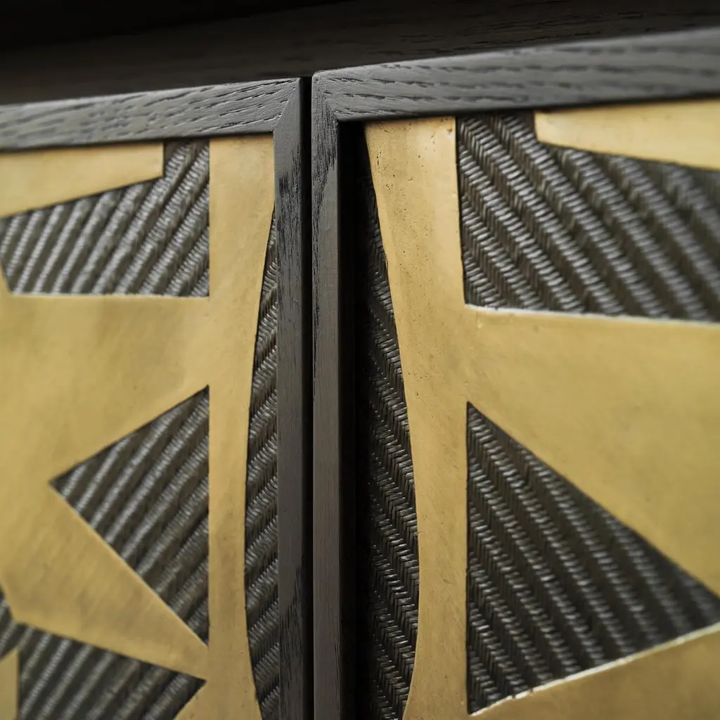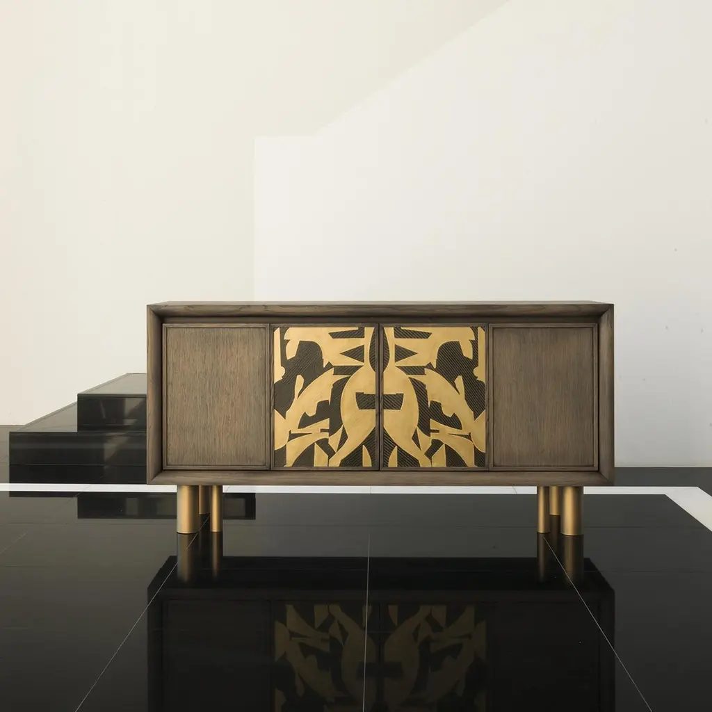 A stunning piece from Chiara Provasi's Couture Collection, the Mila Abstract Painting Sideboard is the fruit of research into the intersection of fashion, art and furniture. Handcrafted in oak with a gray finish, the sideboard features two cabinet faces in gold gypsum in a symmetrical abstract design and rests on six chic bronze feet.