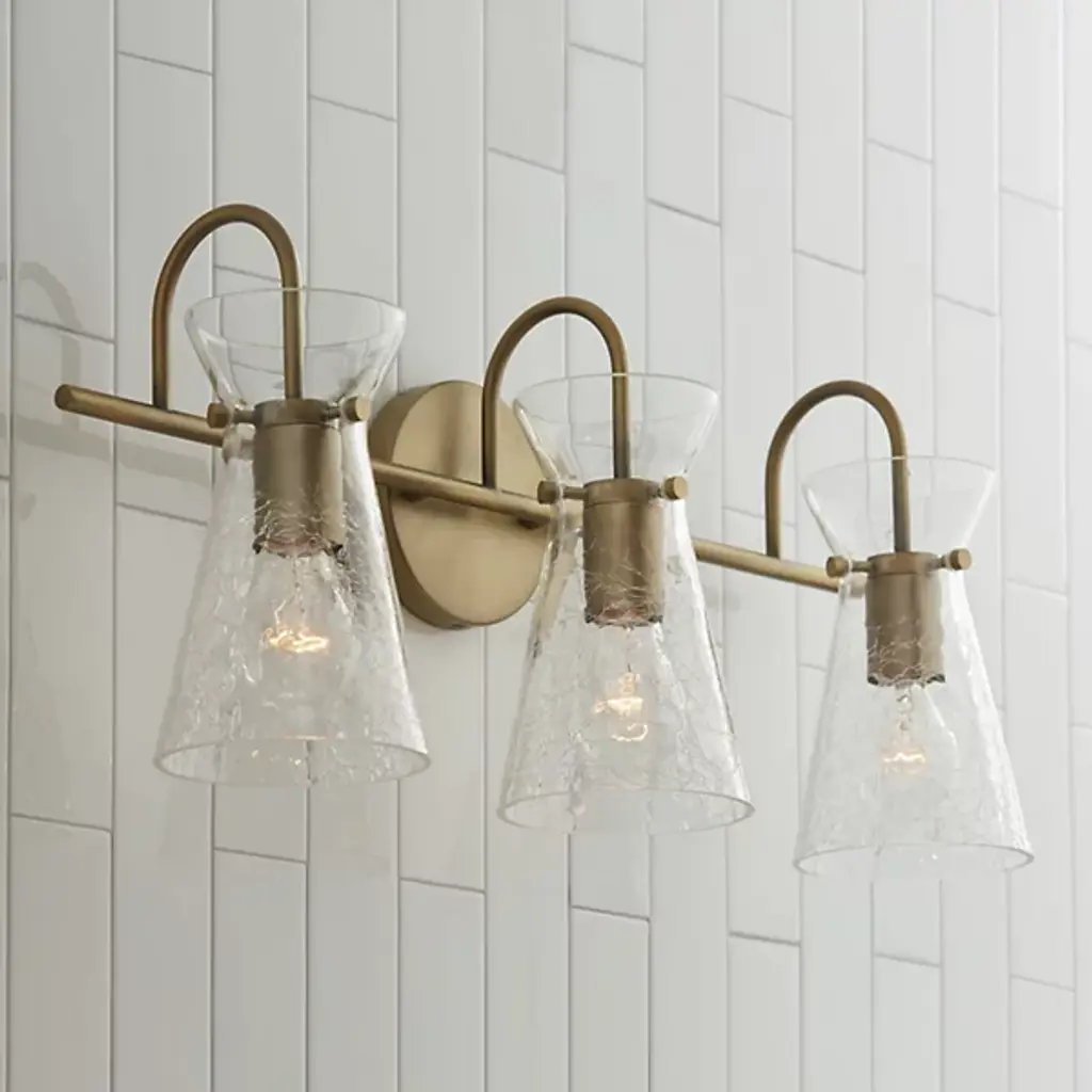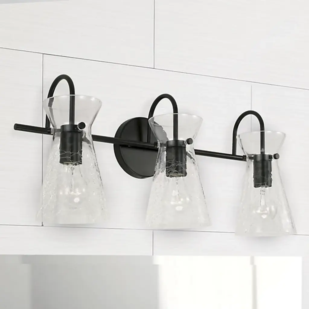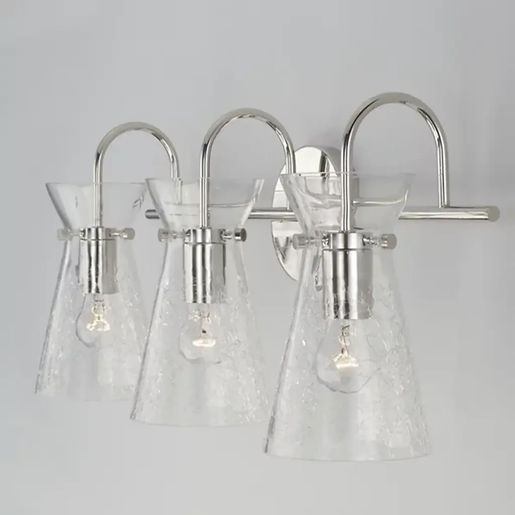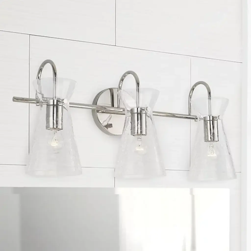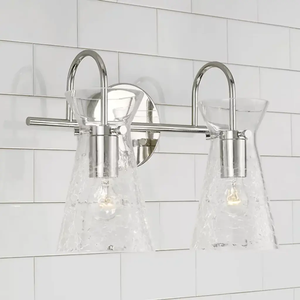 Make a stylish and elegant addition to your bathroom spaces with the Mila Vanity Light from Capital Lighting. Secured to its mounting surface by a steel disc mount, it extends a single crossbar across its horizontal centerline, using a series of U-shaped arms that swoop over and down to suspend a series of damp-listed lamps along its length. Each lamp comes accompanied by a half-crackled glass shade that adds an appealing natural warmth to its surroundings.
