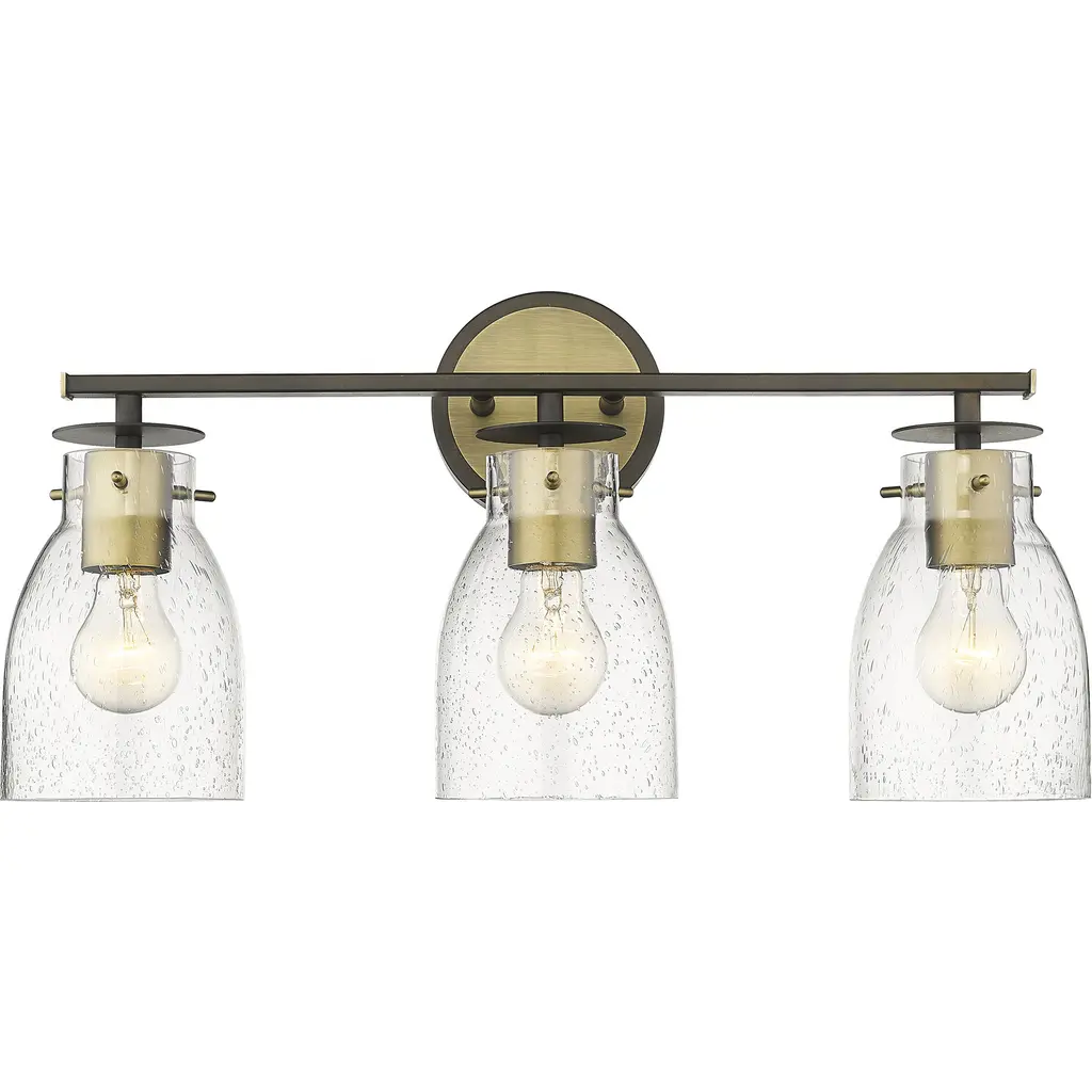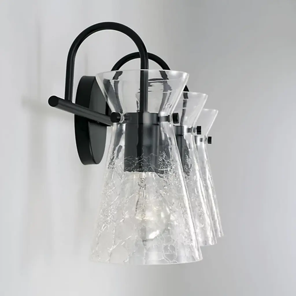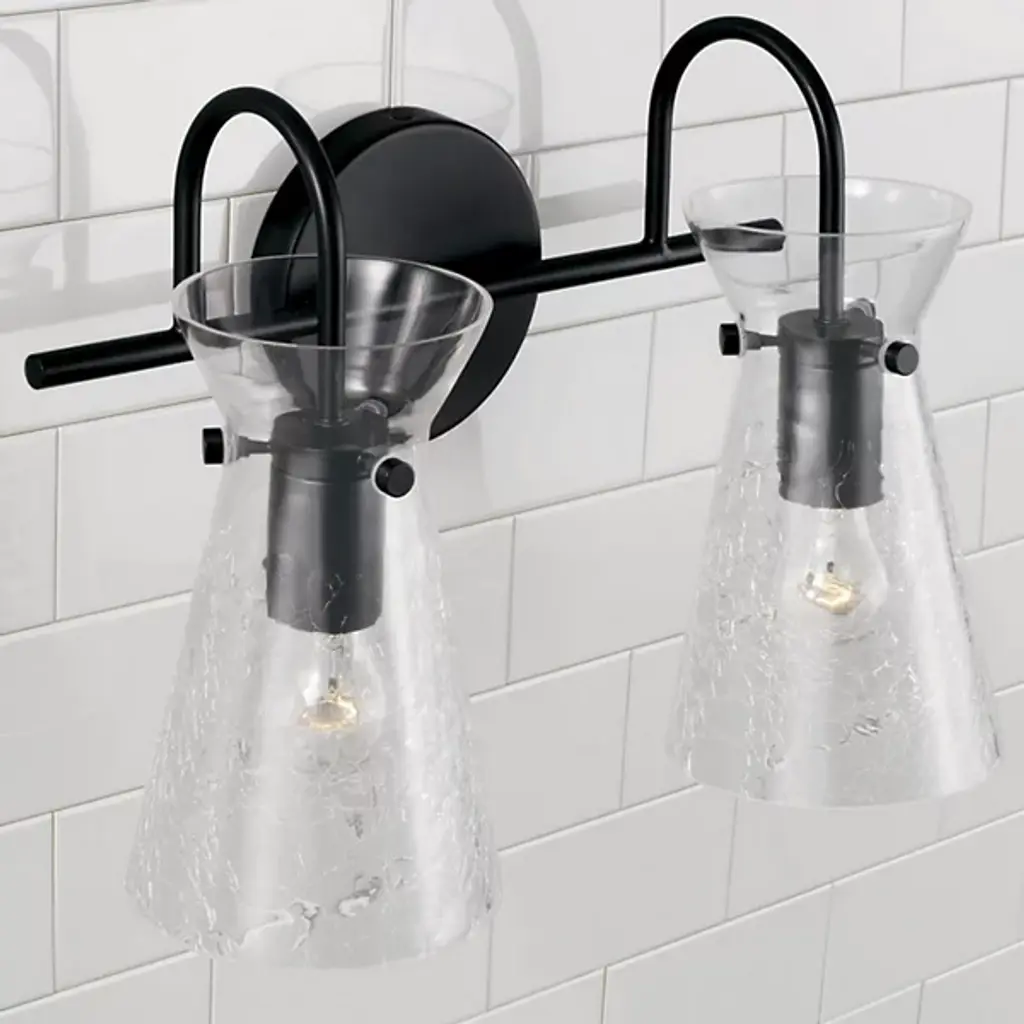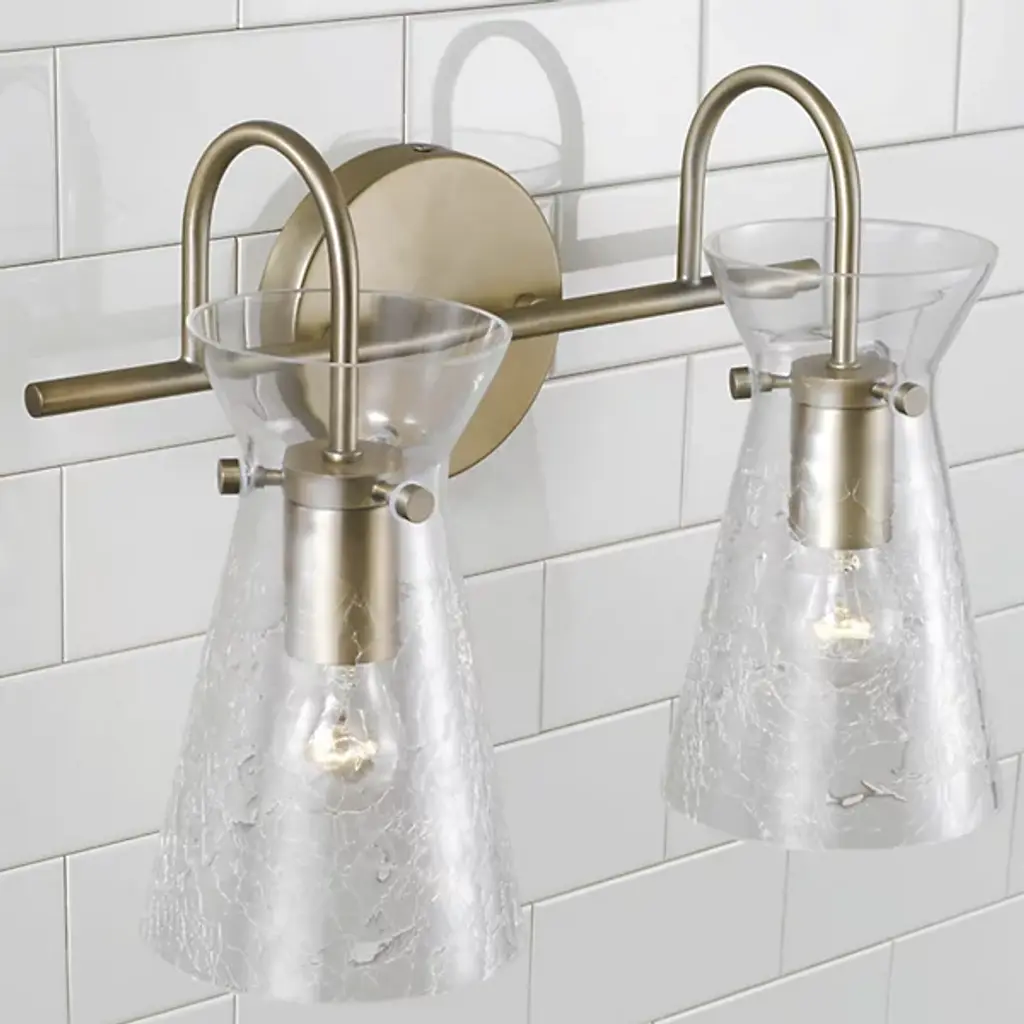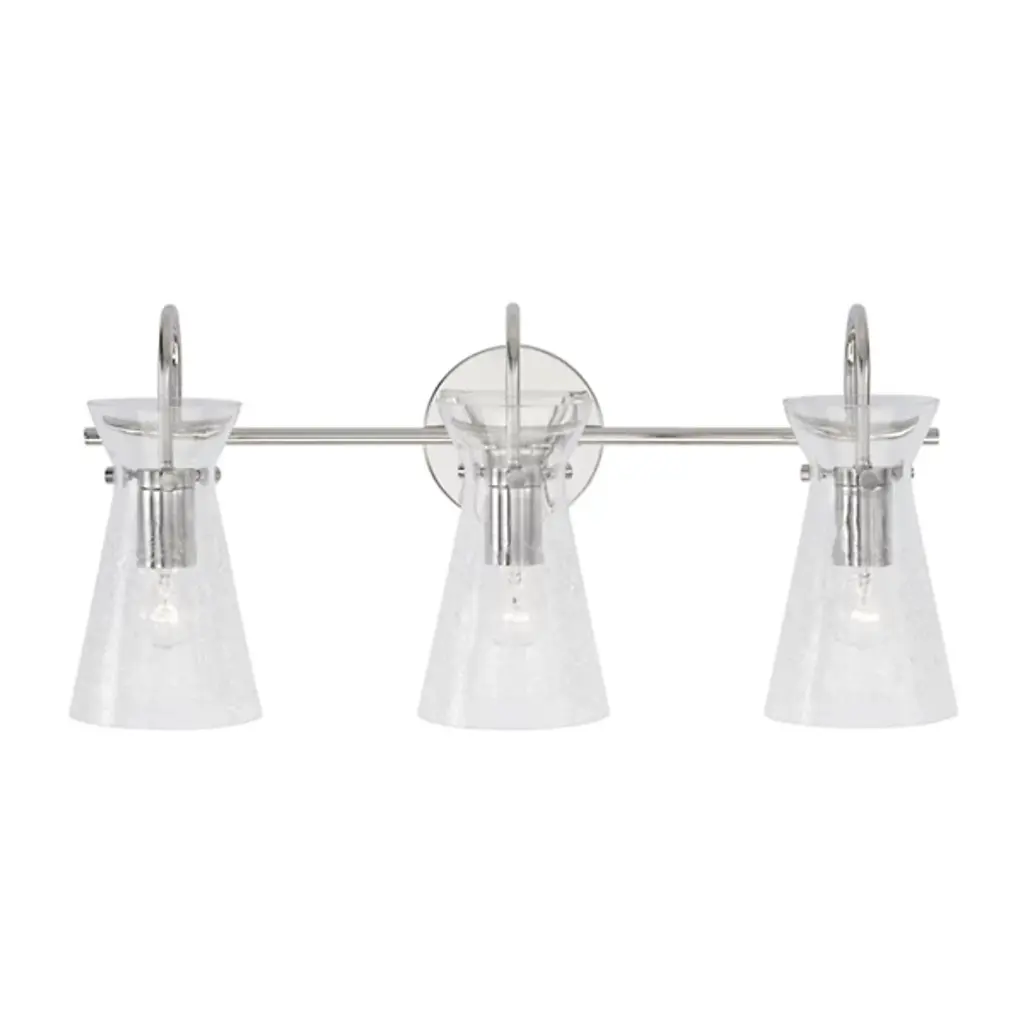 Make a stylish and elegant addition to your bathroom spaces with the Mila Vanity Light from Capital Lighting. Secured to its mounting surface by a steel disc mount, it extends a single crossbar across its horizontal centerline, using a series of U-shaped arms that swoop over and down to suspend a series of damp-listed lamps along its length. Each lamp comes accompanied by a half-crackled glass shade that adds an appealing natural warmth to its surroundings.