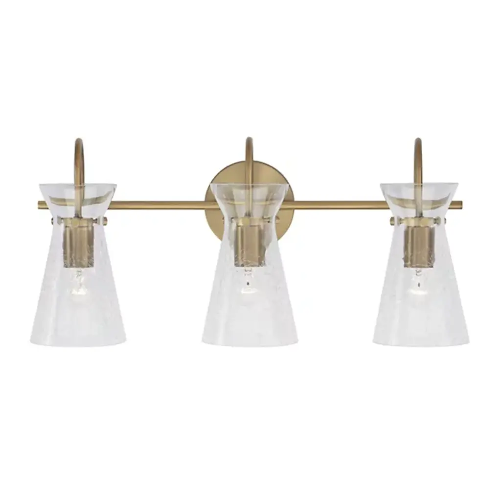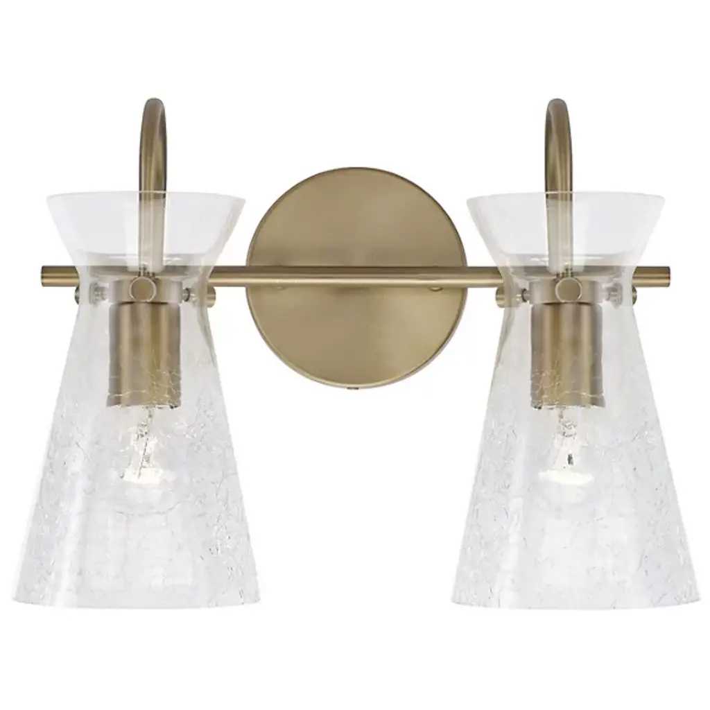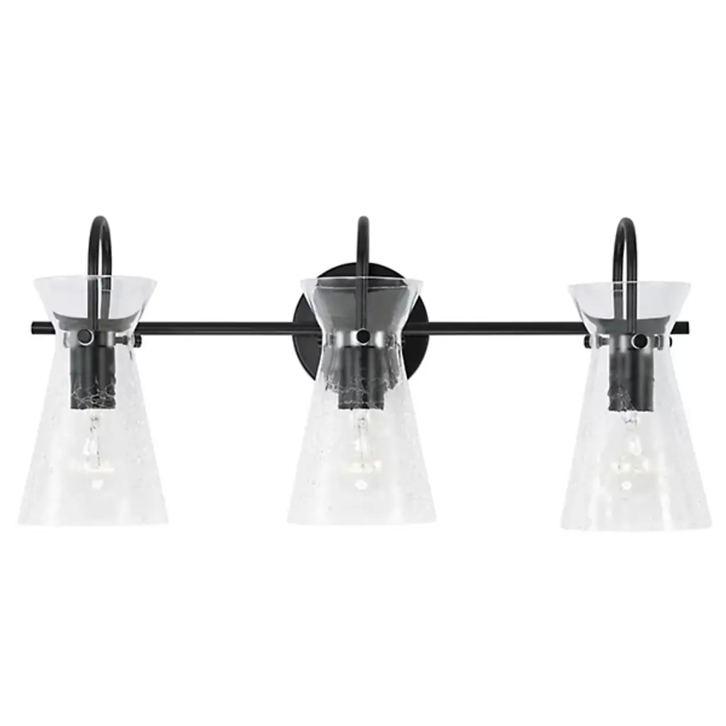 Make a stylish and elegant addition to your bathroom spaces with the Mila Vanity Light from Capital Lighting. Secured to its mounting surface by a steel disc mount, it extends a single crossbar across its horizontal centerline, using a series of U-shaped arms that swoop over and down to suspend a series of damp-listed lamps along its length. Each lamp comes accompanied by a half-crackled glass shade that adds an appealing natural warmth to its surroundings.
