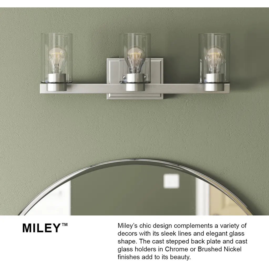 Miley's chic design complements a variety of decors with its sleek lines and elegant glass shape. The cast stepped back plate and cast glass holders in Chrome or Brushed Nickel finishes add to its beauty.