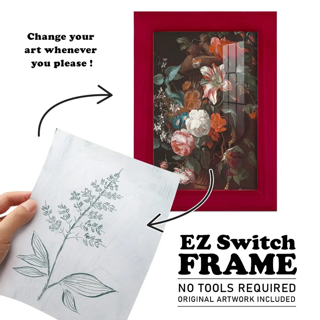 Milkweeds IV -EZ SWITCH Framed Print w/glass-Cherry Red A delightful, framed print. Featuring a solid wood frame with real wood glass. This premium print is giclee quality. In addition, every frame features a removable back and table top stand. This allows you to change your art in the future or to just stand the art on a table for a new look. We are sure you'll enjoy our new series of EZ SWITCH Framed Art. Solid Wood Frame Real Glass Removable / Replaceable Art Built in Tabletop Stand Sizes range from 4x6 up to 12x15 - buy just one or pair them up as sets as you see fit.