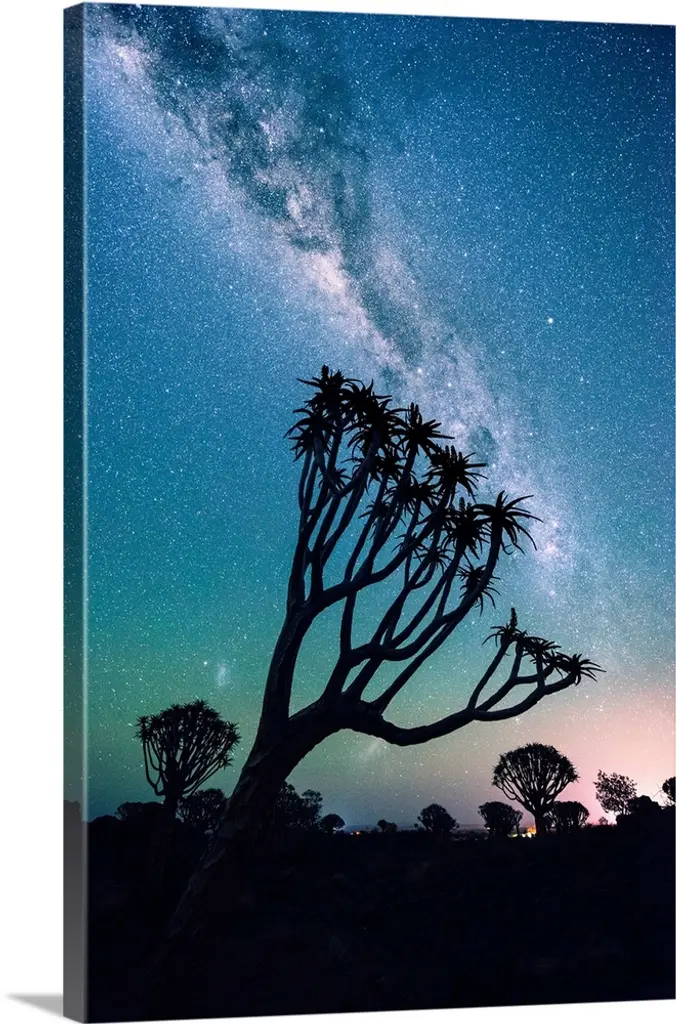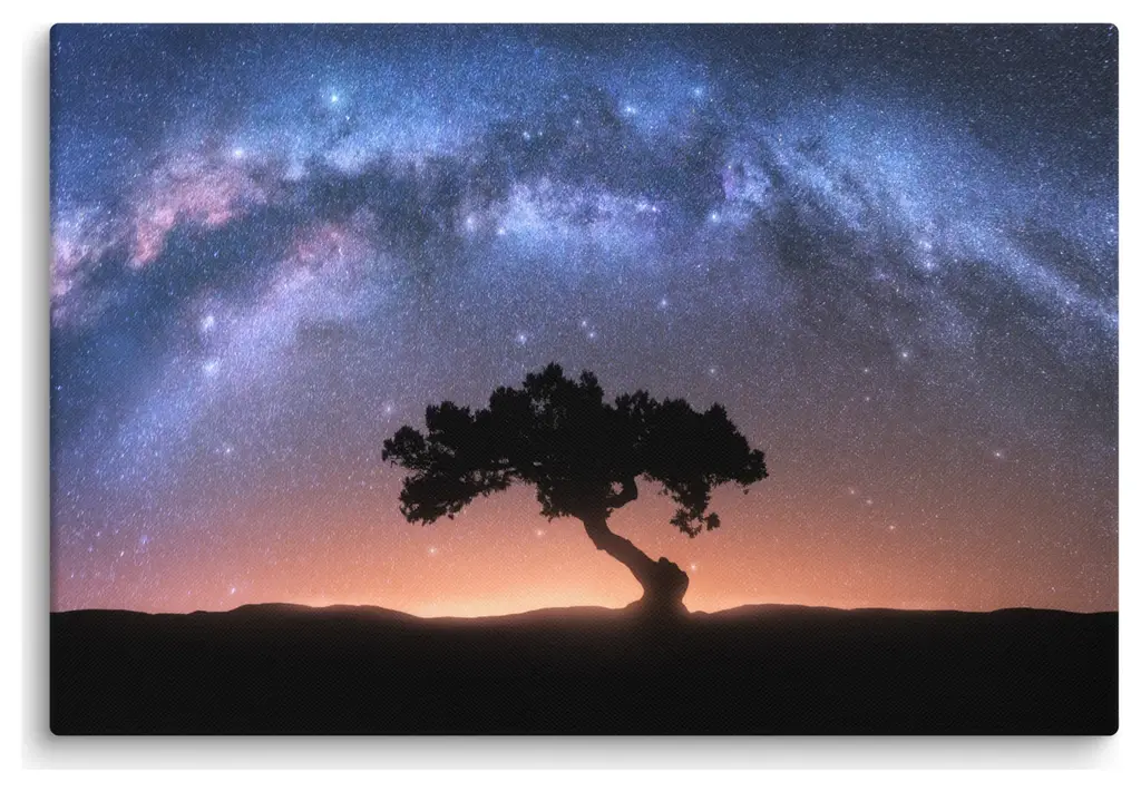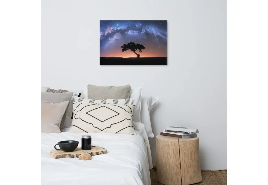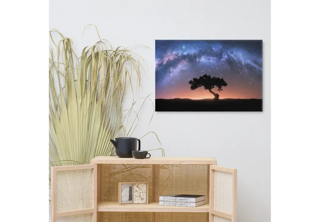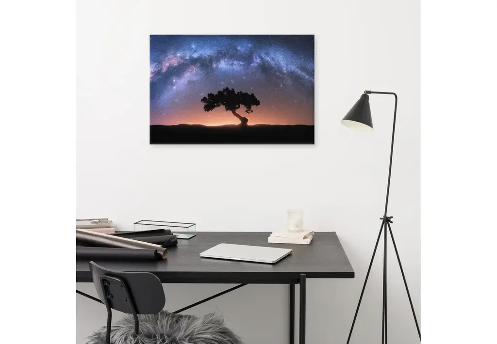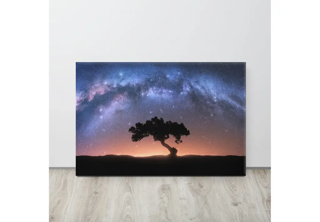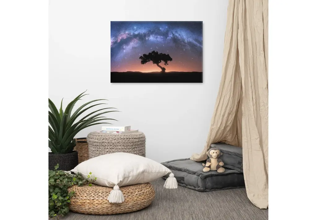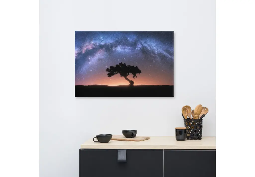 Milky Way Arch and Tree Night Galaxy - Rustic / Rural / Nature / Landscape Photo Canvas Wall Art Print - Artwork - Wall DecorLooking to add a little rustic flair to your wall in your living room, bedroom, dining room or office? Look no further than these classic canvas gallery wrapped wall art prints. Come check out the options of these fade-resistant prints that you're bound to fall in love with at an affordable price.Photo Information:About This Rural Landscape Scene: A single tree and Milky Way arch at night. This landscape scene with an old tree, the bright arched milky way and sky with stars just close to sunrise will connect you to the stunning beauty of the universe. If you enjoy the stars and nature you will marvel at this wall art print forever.Title: Milky Way Arch and TreeSKU: LAND-0239Genre: Landscape PhotographyMain colors of this photograph: Blue, Orange, Purple, Pink, White, Black, YellowAdd a touch of natural beauty to your home or office with our canvas wall art prints. Each photograph is printed on a high-quality poly cotton blended canvas, ensuring vibrant colors and sharp details. The print is then hand stretched over a sturdy wood frame, giving it a sleek and modern look. With its matte sheen finish, this wall art adds a sophisticated touch to any room.Not only is the print visually stunning, but it is also built to last. The materials used are fade-resistant, ensuring that the colors stay vibrant for years to come. The acid-free and PH neutral canvas base guarantees that the print will not yellow or deteriorate over time.Installing this wall art is hassle-free. It comes with all the necessary hardware, including mounting brackets, making it easy to hang on your wall. The 1.25" deep canvas structure adds depth and dimension to the piece. Transform your living space with our canvas wall art print. Its timeless design and durable construction make it a perfect addition to any home decor style.Print Material: Acid-free, PH neutral, poly-cotton base, fade-resistant (OBA-free) / 20.5 mil thick canvas / Canvas Structure: 1.25" deep / Hand assembled solid wood stretcher bar frame / Mounting brackets included.Environmental Impact: Responsibly sourced and manufactured in the USA / Printed on demand (Made-To-Order) and shipped directly to you. Making products on demand instead of in bulk helps reduce overproduction, so thank you for making thoughtful purchasing decisions! Artwork Ships: Normally within 2-3 business days.Recommended for indoor use only unless you (DIY) waterproofing (Please note: This print is not returnable if alterations were made)Suitable rooms for this art print: Offices, nurseries, living rooms, bedrooms, bathrooms, family rooms, man caves, dorms, dining rooms, kitchens, classrooms, apartments, bars, baby nurseries, home offices, spas, meditation rooms, hallways, stairways, guest rooms, healthcare facilities, corporate offices, hotel decor, home staging, interior decorating, lobbies, waiting rooms,Great gift ideas for: women, wife, girlfriend, her, girls, daughter, grand-daughters, men, guys, boys, son, husband, boyfriend, him, kids, teens, best friend, Christmas, Xmas, holiday, Halloween, housewarming, affordable presents, bridal shower, wedding, birthday, anniversaryProcessing And Shipping:This canvas artwork is made especially for you as soon as you place an order, which is why it takes us a bit longer to deliver it to you. Making products on demand instead of in bulk helps reduce overproduction, so thank you for making thoughtful purchasing decisions!Returns: Super simple! No hassle return or exchange policy. You’ll receive 100% money back if you’re not satisfied...simply message us.