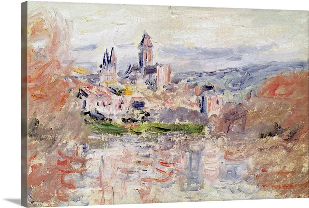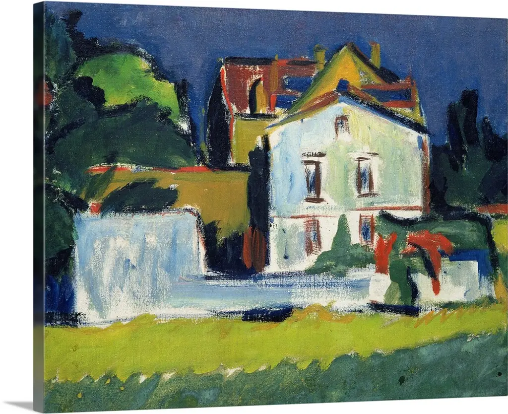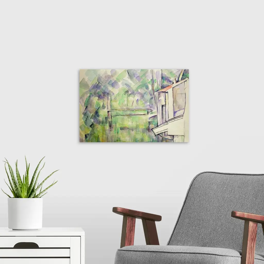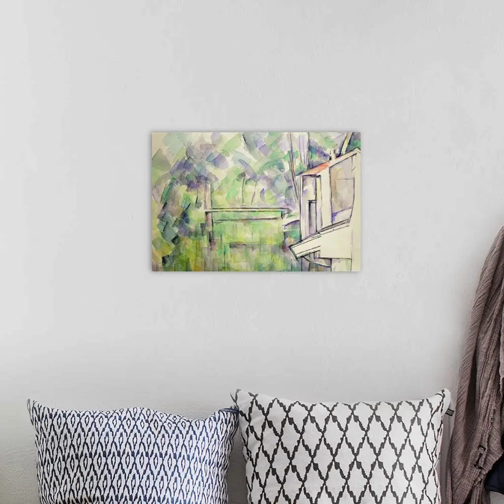A classic art piece that uses water colors to paint a mill that is surrounded by swatches of cool colored paint.