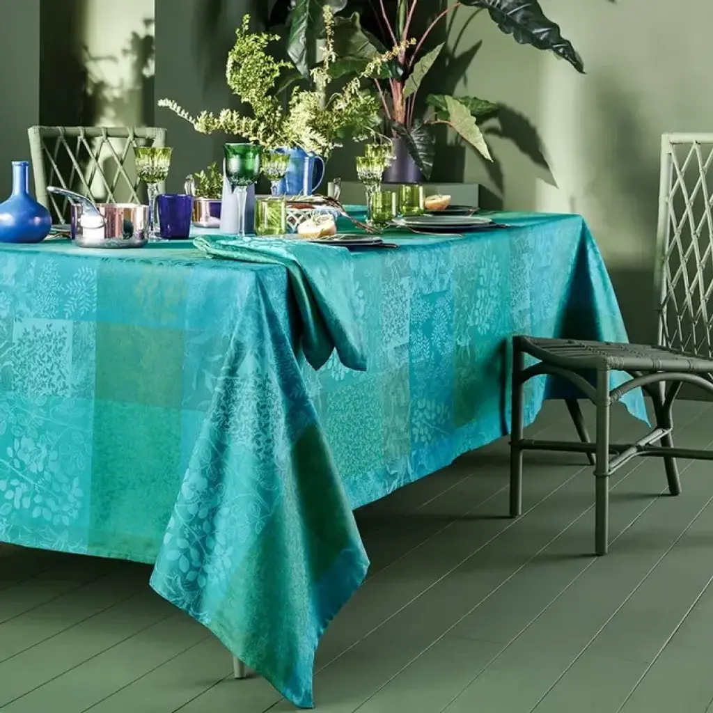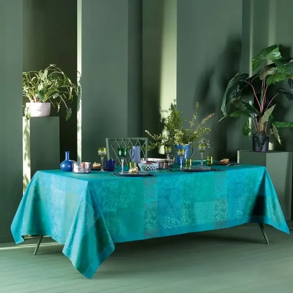 Curate the perfect tablecscape with the lush garden of leaves and flowers thrives in shades of blues, greens and teals atop the 100% cotton Mille Rameaux Emerald Tablecloth. This woven design was crafted from original artwork, hand-drawn by our in-house team of textile artisans & designers in France. Constructed on jacquard looms with extra long staple cotton, Garnier Thiebaut USA's jacquard table linen collections are woven for longevity, and can last for generations with the proper washing maintenance and use. Elevate your dining experience with the Mille Rameaux Emerald Tablecloth, offering an exquisite blend of artistry and durability for any Fall and Winter event or gathering. Since 1870, Garnier-Thiebaut has created classic and jacquard linens in the quintessential French style. Their linens have been used by the Four Seasons George V in Paris, the Mandarin Oriental Hotel in Geneva, The Ritz Carlton, Manama (Bahrain), Le Meridien Bora Bora, the Four Seasons Hotel, New York, and The French Laundry in Yountville.