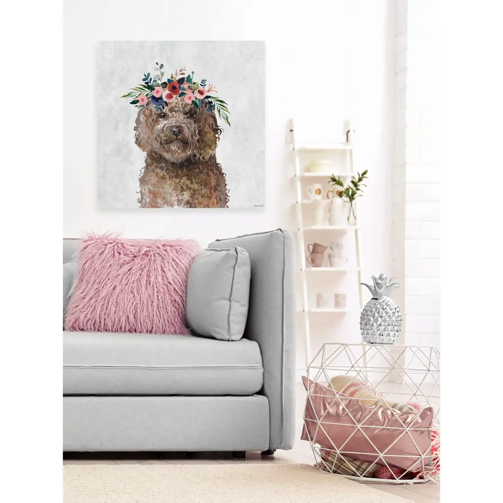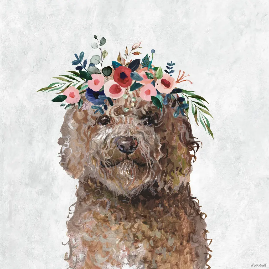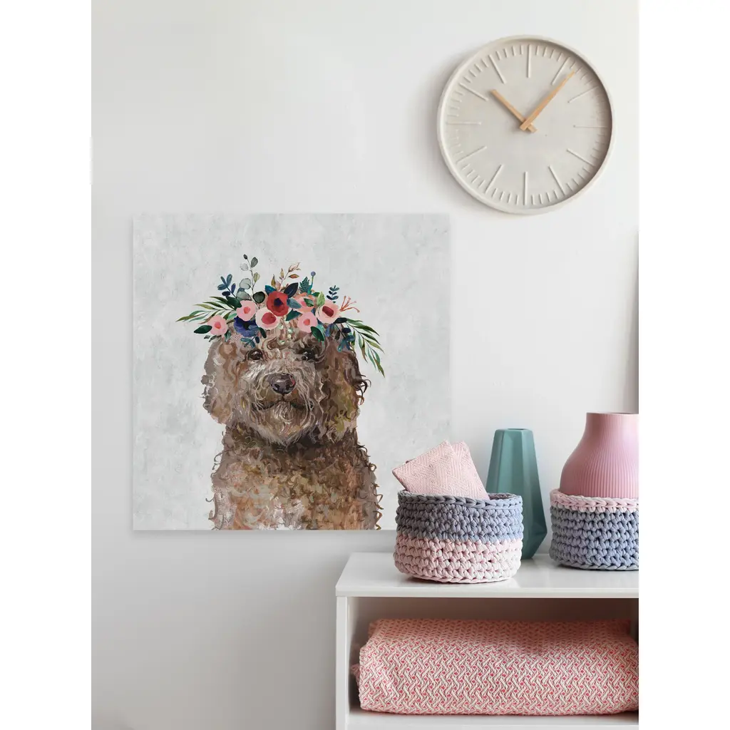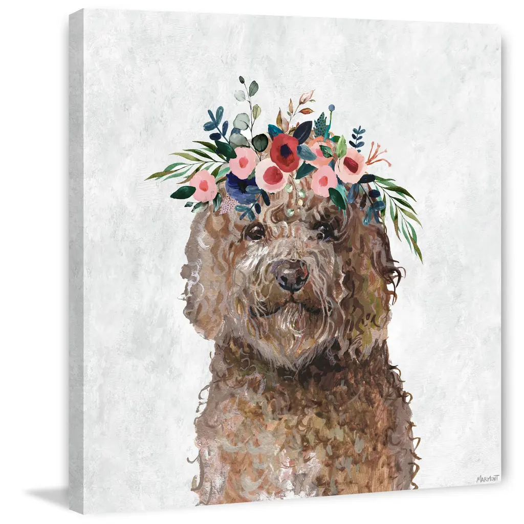 This unique acrylic painting print is perfect for pet owners and animal lovers. This print features a fluffy brown puppy with various colorful flowers on its head. Proudly made in the USA, this piece is printed on canvas before it- s stretched over non-warping wooden bars for a gallery-wrapped look. With wall-mounting hooks included, this artful accent is ready to hang up as soon as it reaches your front door.Fine art canvas print from the Marmont Hill Art CollectiveProfessionally hand stretchedGallery wrapped in sustainable, non-warping woodArrives ready to hangMade in the USAIncludes a certificate of authenticity