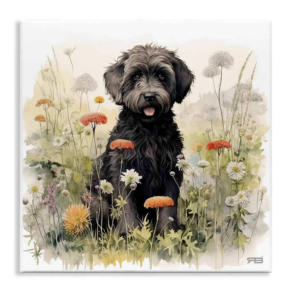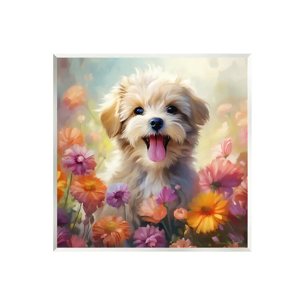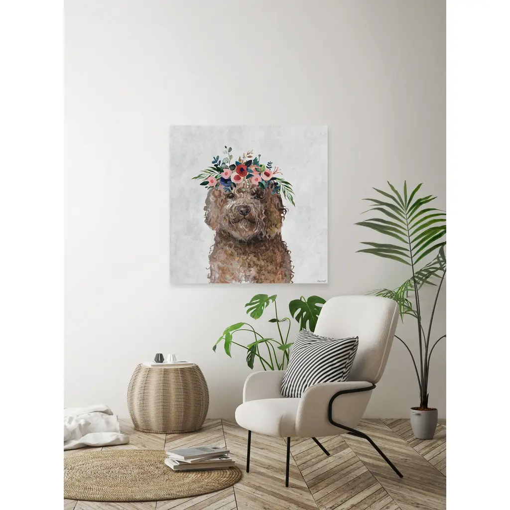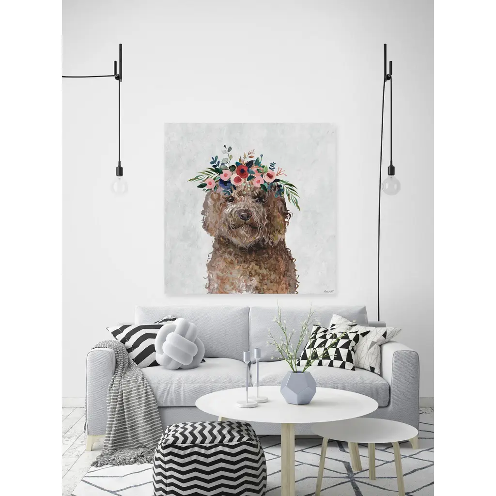 This unique acrylic painting print is perfect for pet owners and animal lovers. This print features a fluffy brown puppy with various colorful flowers on its head. Proudly made in the USA, this piece is printed on canvas before it- s stretched over non-warping wooden bars for a gallery-wrapped look. With wall-mounting hooks included, this artful accent is ready to hang up as soon as it reaches your front door.Fine art canvas print from the Marmont Hill Art CollectiveProfessionally hand stretchedGallery wrapped in sustainable, non-warping woodArrives ready to hangMade in the USAIncludes a certificate of authenticity