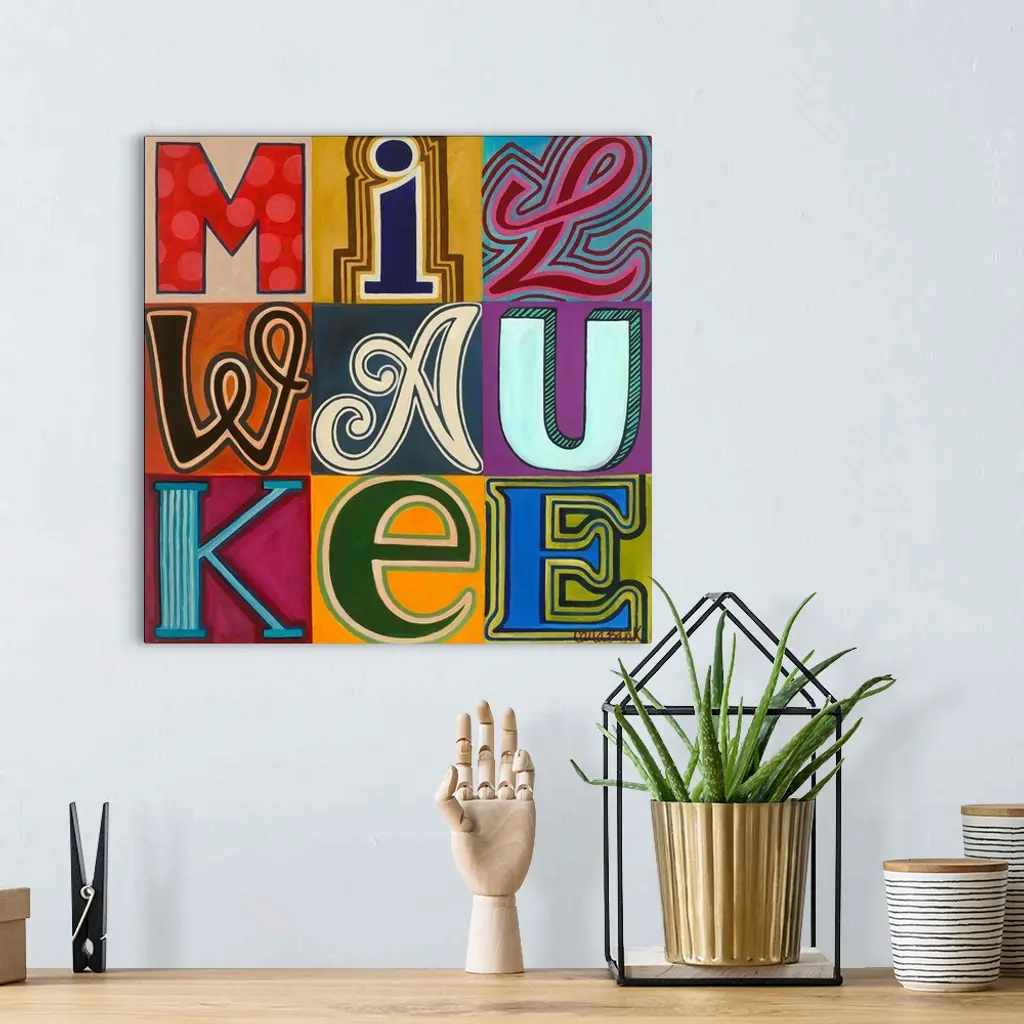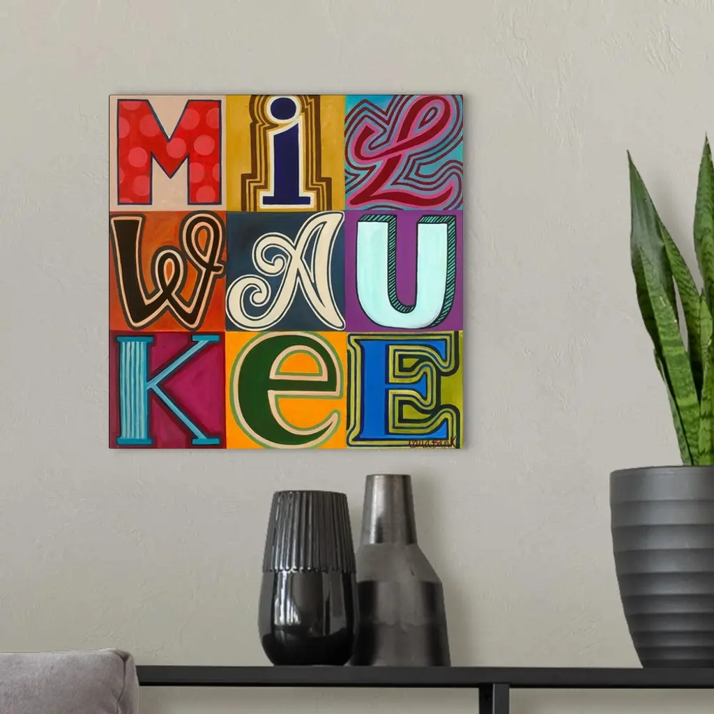 Contemporary typography painting with the word Milwaukee spelled in different fonts.