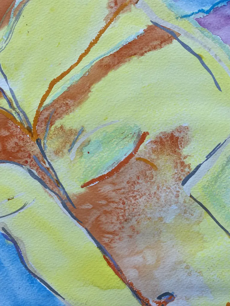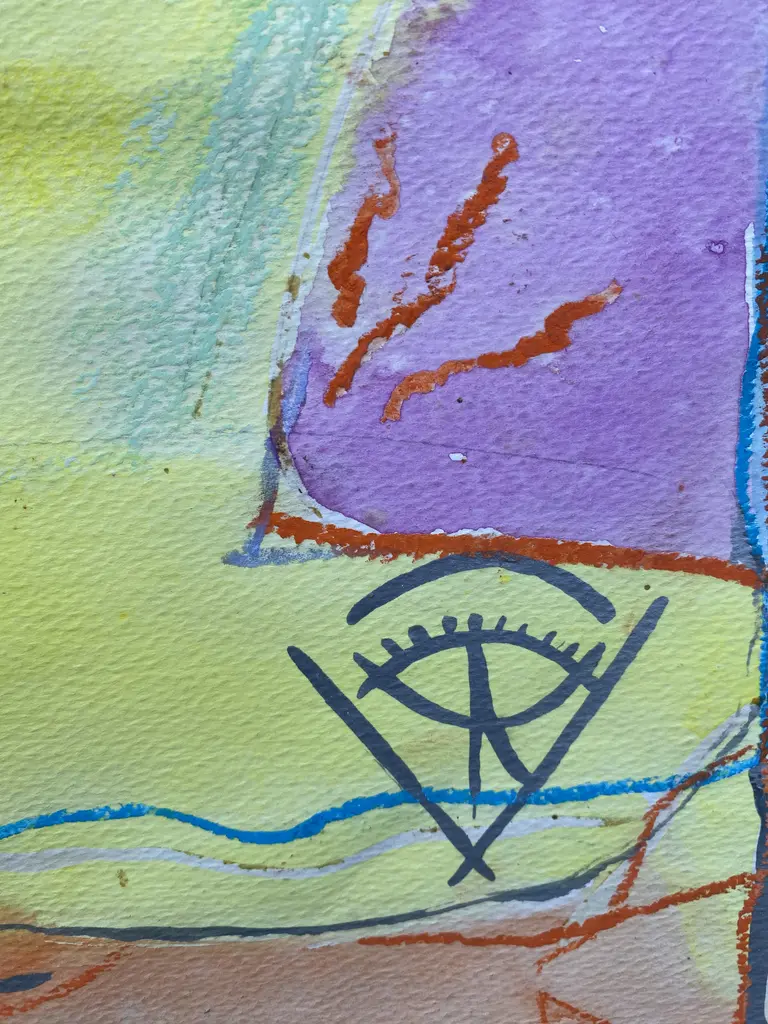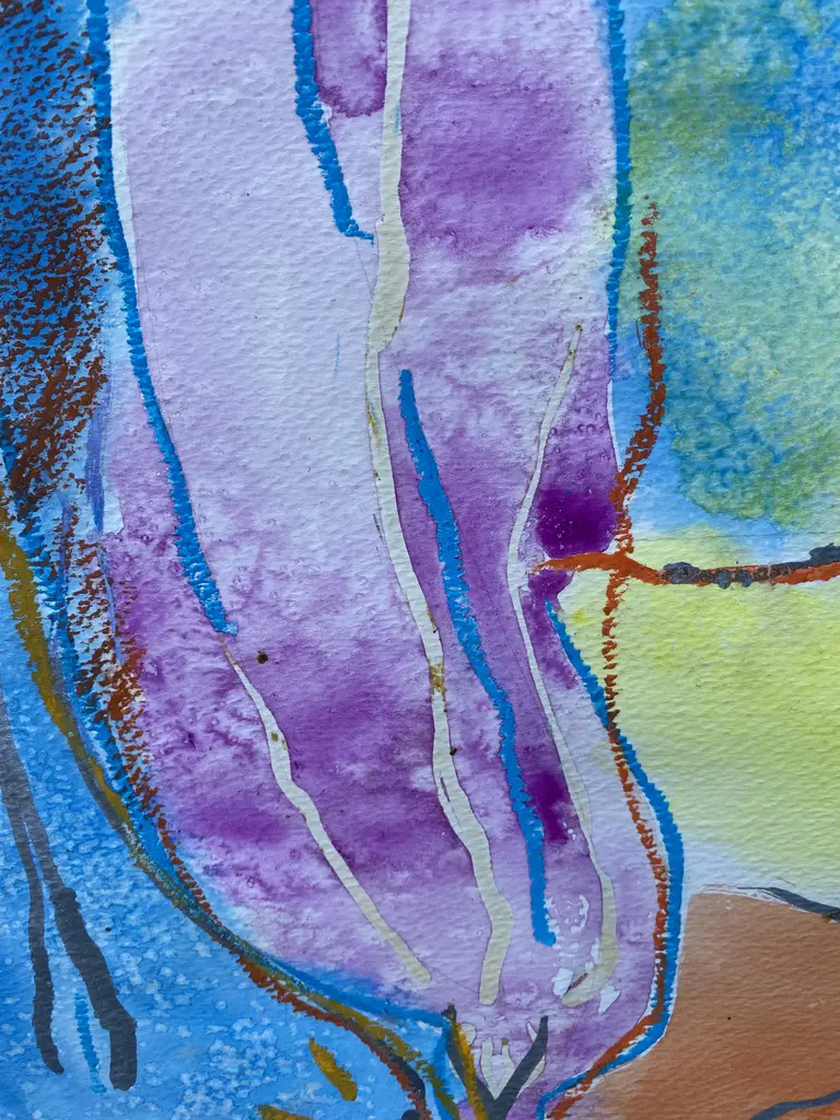 A substantial and period modernist watercolor figural study of a young woman shown relaxing in contemplation. Painted by Dawn O'Malley (American, 20th century), circa 1985 and stamped on verso with Certification of Authenticity.