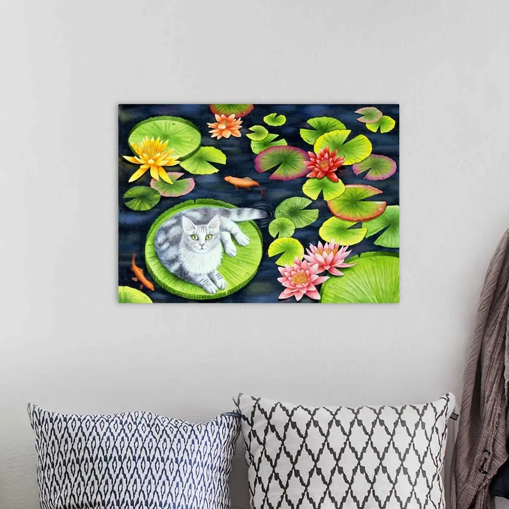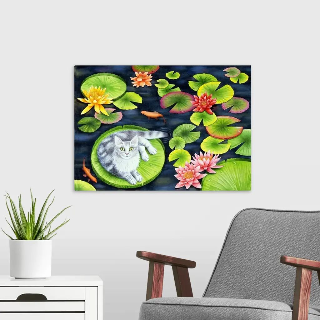 Artwork of a gray cat laying on a big lily pad in a koi pond.