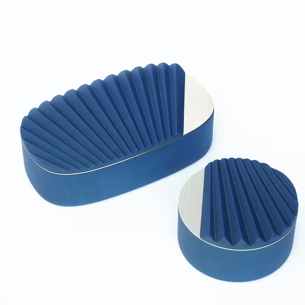 Featuring a lid inspired by the pleating of oriental fans, the box is part of a project including hand mirrors and larger jewelry boxes. Handcrafted in cherry wood in Italy's Veneto region, the box comes with a small mirror and is complete with special magnets to conceal your best pieces. The box measures 10 centimeters in diameter.