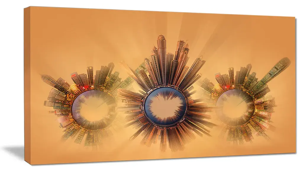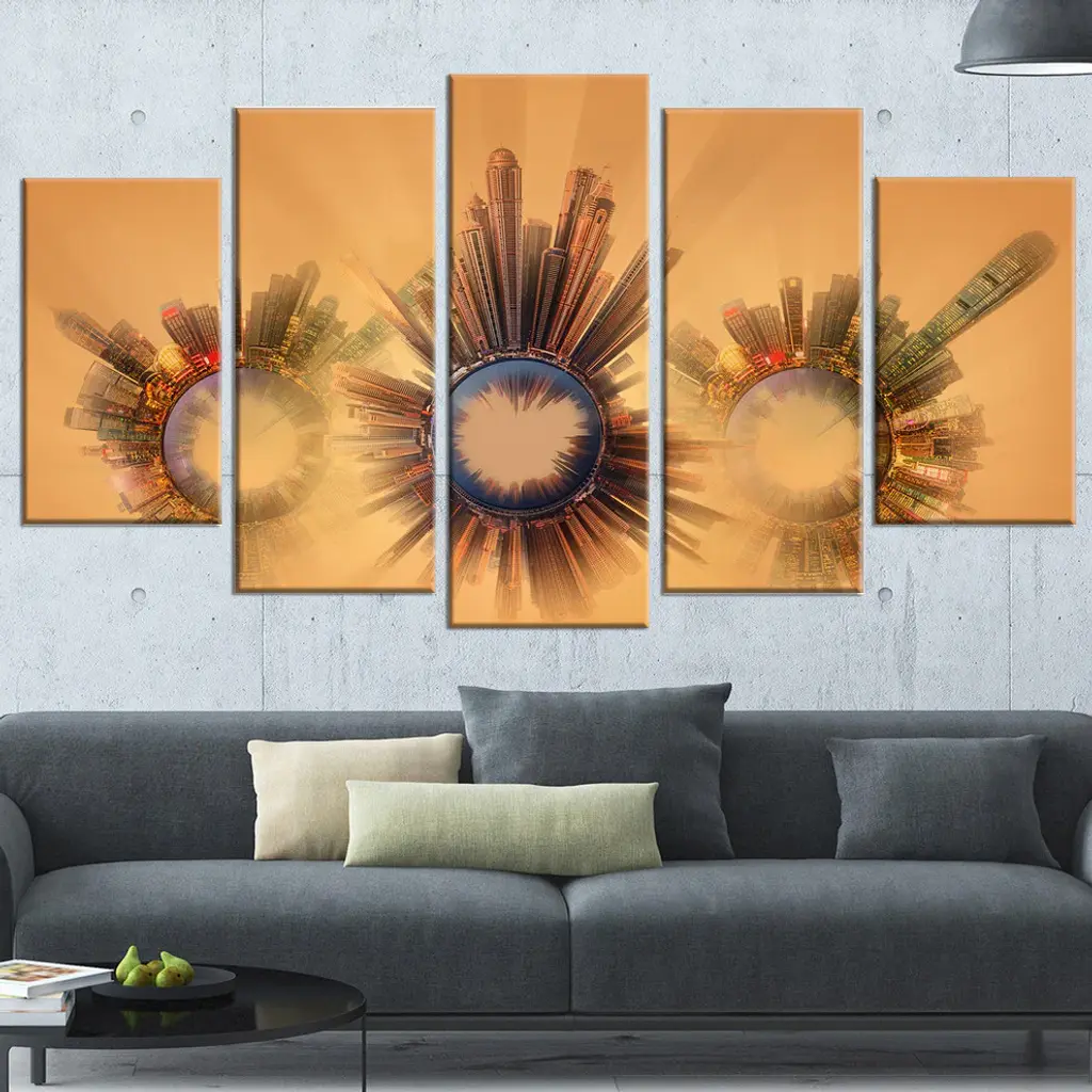 "Miniature Earth Planets With Skyscrapers" Abstract Wall Art, 60"x32", 5-Panels