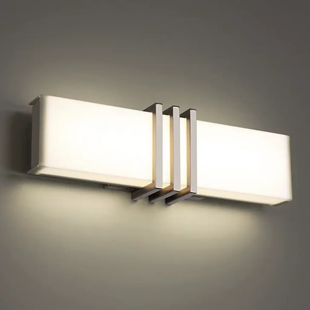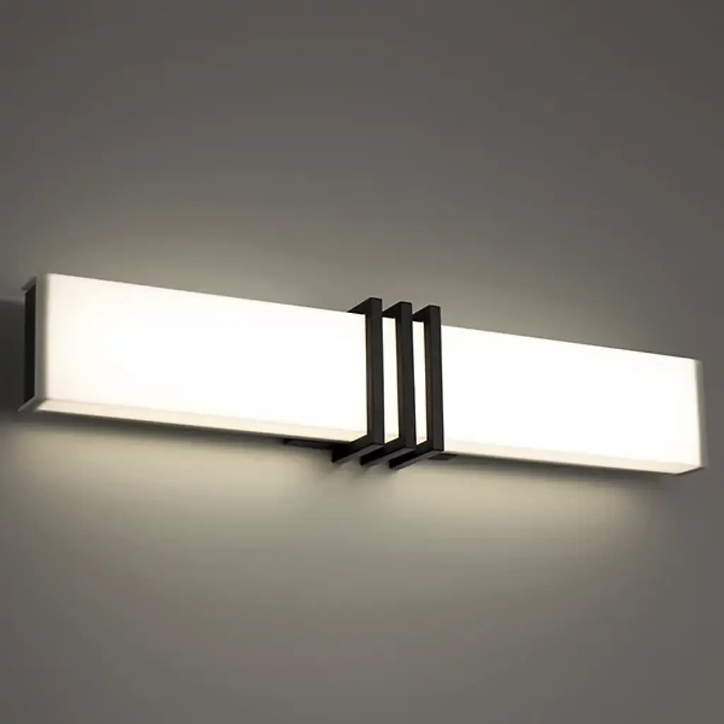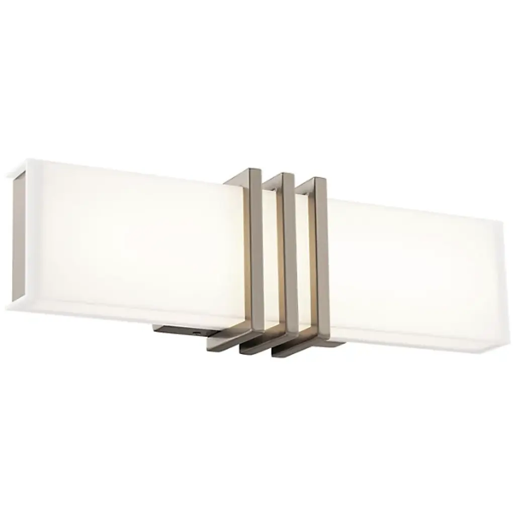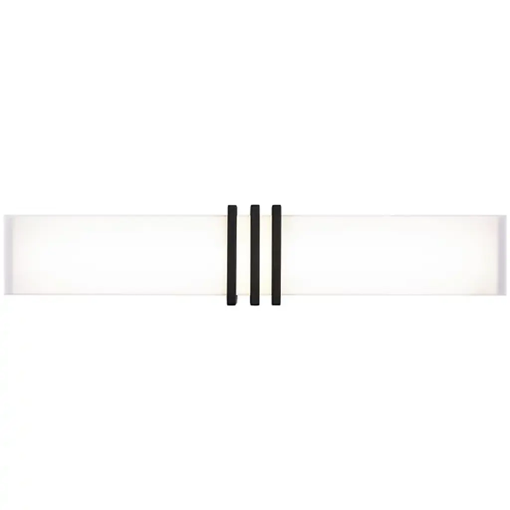 Decadent and daring. The Minibar LED Vanity Light from dweLED sets LED lamping inside a rectangular metal housing; the AC LED means that it doesn’t need a driver or transformer. A translucent bar shade extends over the lamping, accompanied by three vertical metal bands that sweep across its center, adding a shadowy enhancement to the gentle warmth cast by the luminous lamping.