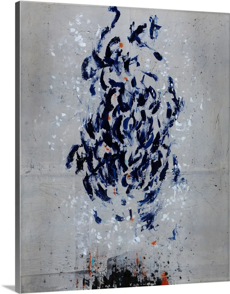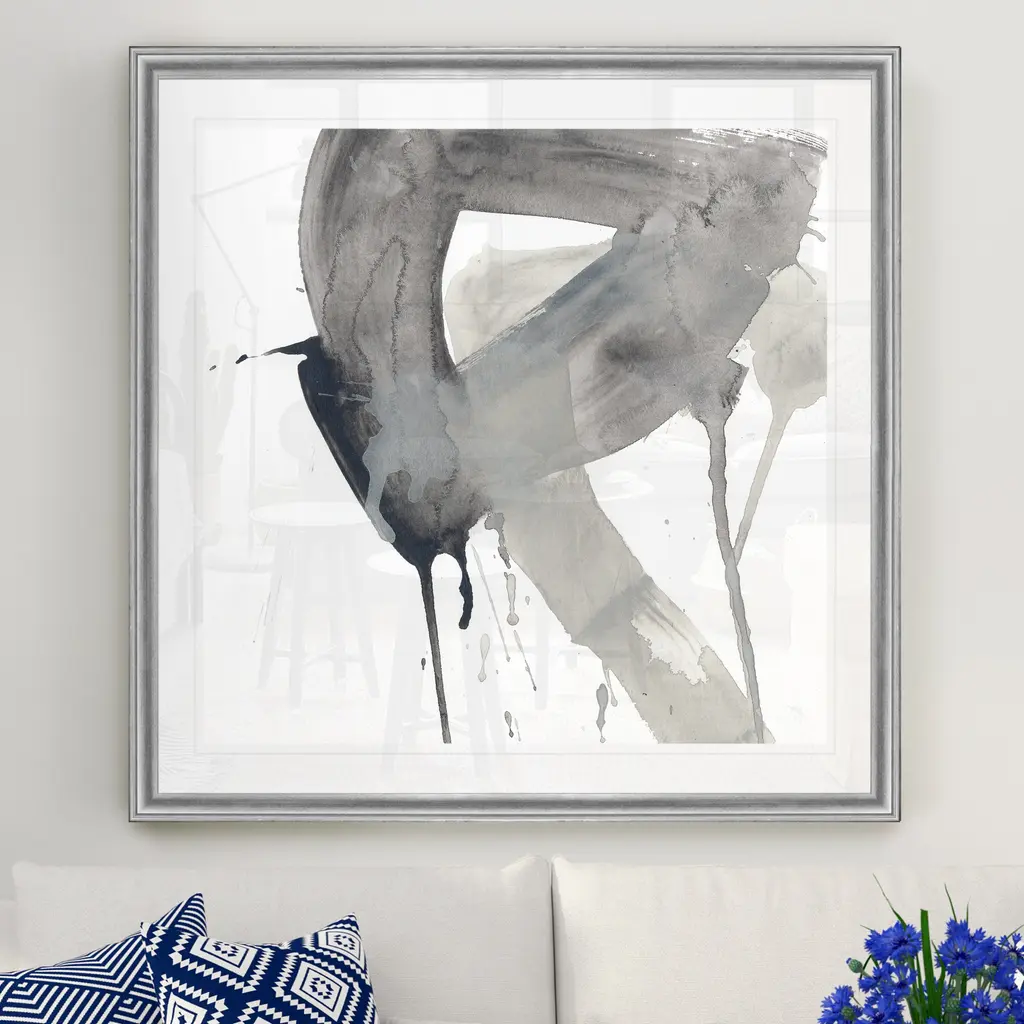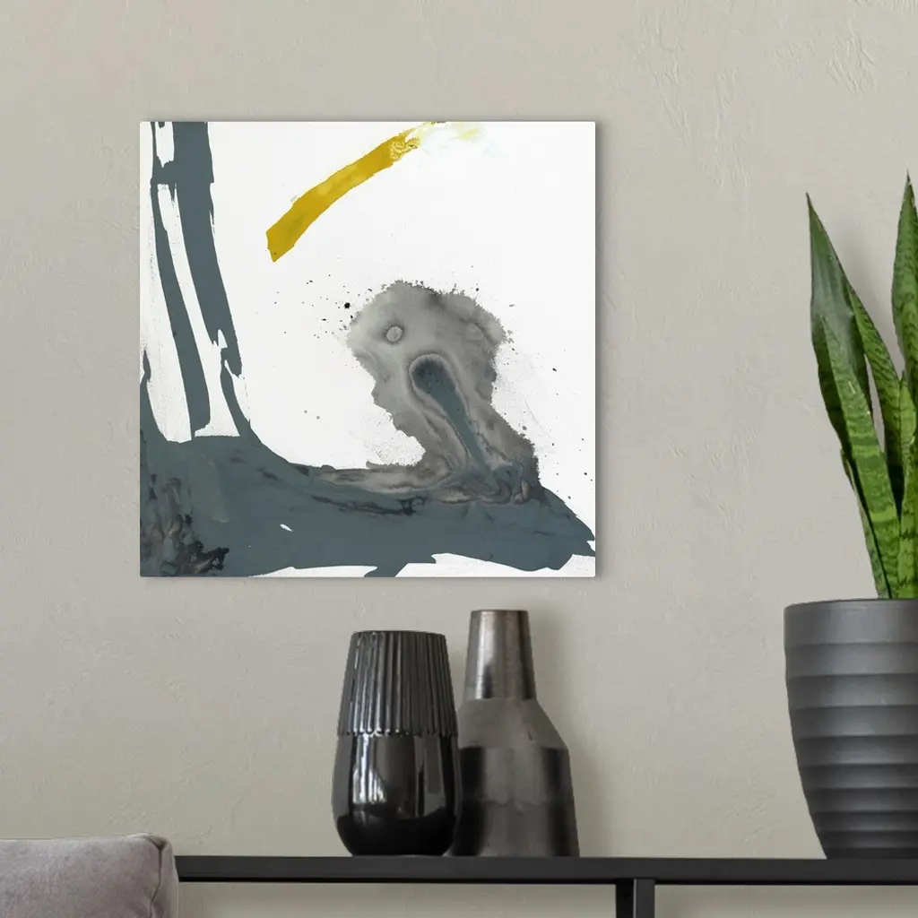 Abstract painting using aggressive strokes of gray with a hint of yellow against a white background.