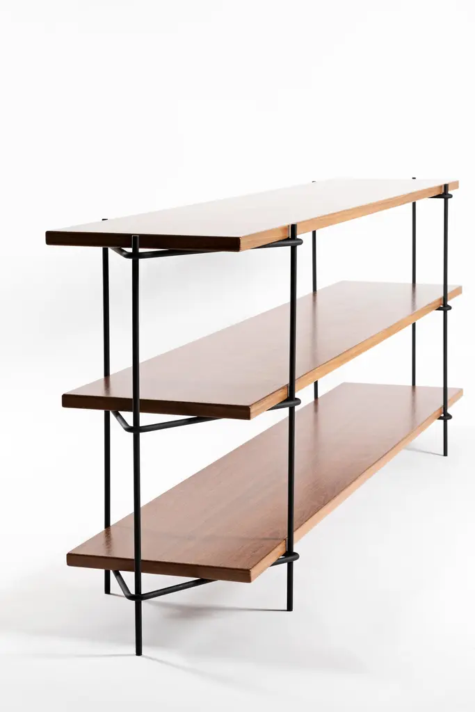Carlos Shelf by Samuel Lamas, 2022The Carlos Shelf by Samuel Lamas is a testament to the architectural finesse and modernist ethos of Brazilian design. This shelf unit, composed of rich wooden planks supported by a black carbon steel frame, is available in Freijó, Cumaru, or Imbuia. The planks can be customized to various lengths ranging from 65 to 108 inches (165 to 275 cm), with pricing varying by size—contact us for details.The open design of the Carlos Shelf makes it perfect for showcasing books, art pieces, and other collectibles, enhancing any space with its clean lines and balanced proportions. Its minimalist yet robust construction is ideal for sophisticated living spaces, providing both storage and style. Each piece is crafted with architectural and geometric precision, ensuring stability while using minimal material, promoting a sustainable and light aesthetic.Key Features:Dimensions: Customizable plank lengths from 65 to 108 inches (165 to 275 cm)Materials: Premium Solid Brazilian Wood (Freijó, Cumaru, or Imbuia) and Black Carbon Steel FrameAesthetic: Light and simple, with clean lines and balanced proportionsDesign: Contemporary minimalist style that blends strength and eleganceCustomization Options:Wood Types: Freijó, Cumaru, or ImbuiaPlank Lengths: Various lengths from 65 to 108 inches (165 to 275 cm)Pricing: Varies by size—contact us for detailsCare Instructions:To maintain the pristine condition of your Carlos Shelf, regularly dust with a soft, dry cloth. For deeper cleaning, use a mild detergent and a damp cloth, ensuring the shelf is completely dry before use. Avoid prolonged exposure to direct sunlight and harsh weather conditions to preserve the color and material integrity.Shipping & Returns:This bespoke item is custom-made and non-returnable, reflecting the personalized attention to detail and craftsmanship invested in each piece. Please contact us for detailed information on shipping and delivery options.Elevate your living space with the Carlos Shelf, a perfect blend of modern Brazilian design and minimalist elegance. Enjoy the timeless beauty and functionality of this exquisite addition to your home. Made to order in São Paulo, Brazil, each piece is crafted with precision and care to meet your unique style preferences.