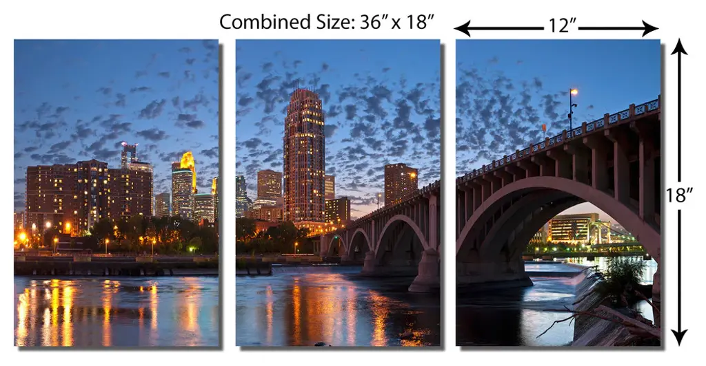 36"œ x 18"œ total size. Ready To Hang! (3 pieces - 12"œ x 18"œ each). 3 Panel Split (Triptych) Metal Print featuring Minneapolis Bridge. Modern metal wall art for home or office wall decor & interior design. Printed on Luxurious, HD aluminum glossy metal panels. Multi panel art.. HD aluminum panels. Metal print wall art. Includes Shadow Wall Mount on the back.• Aluminum Metal Wall Art• Made in USA• Ready to hang - No assembly required• Shadow mount hardware on the back• 0.045"œ thick HD Aluminum Panels• Scratch resistant, glossy finish• Superb color clarity, luxurious prints• Epson printing process• For indoor or moisture rich environment use• Easy to clean. Gently wipe with microfiber cloth.