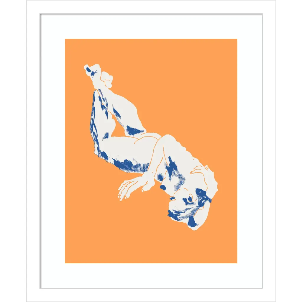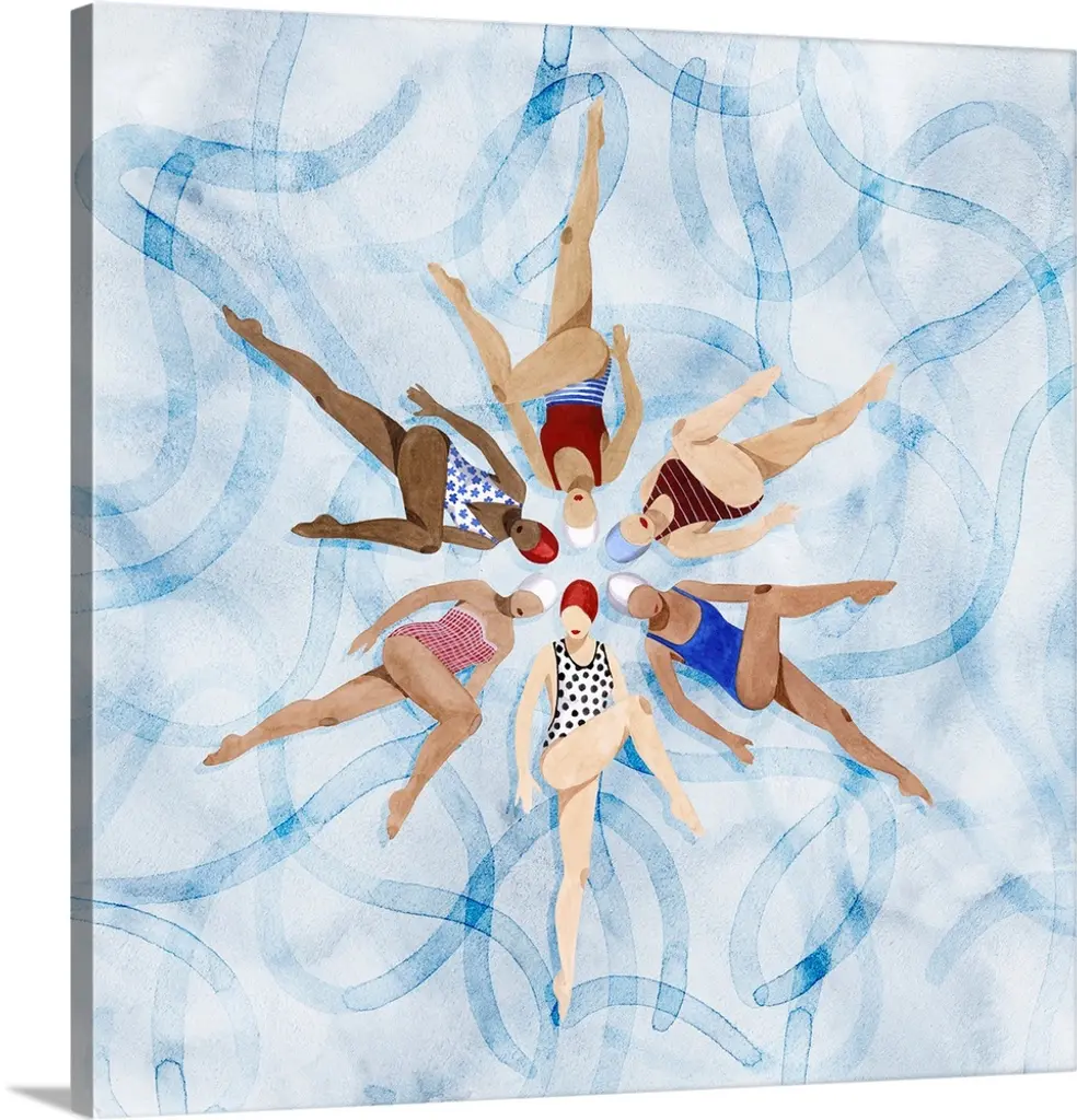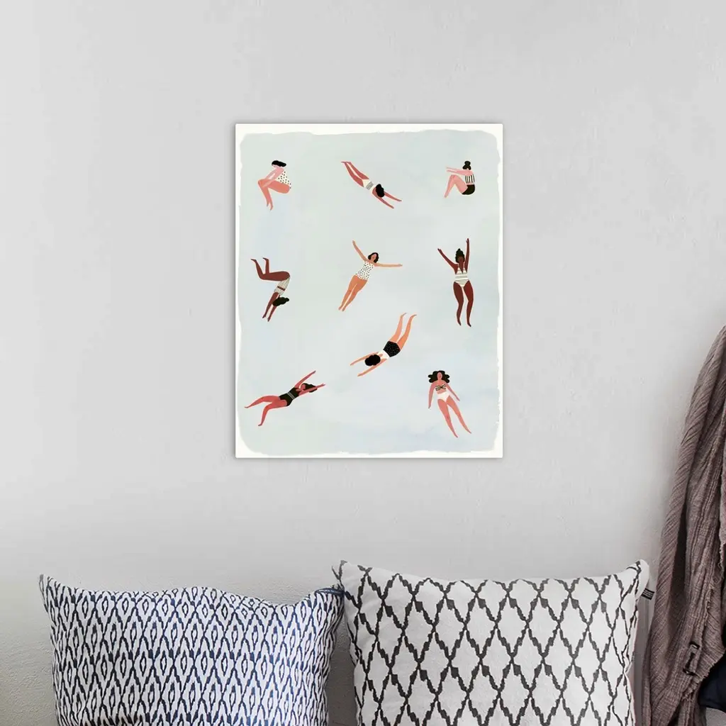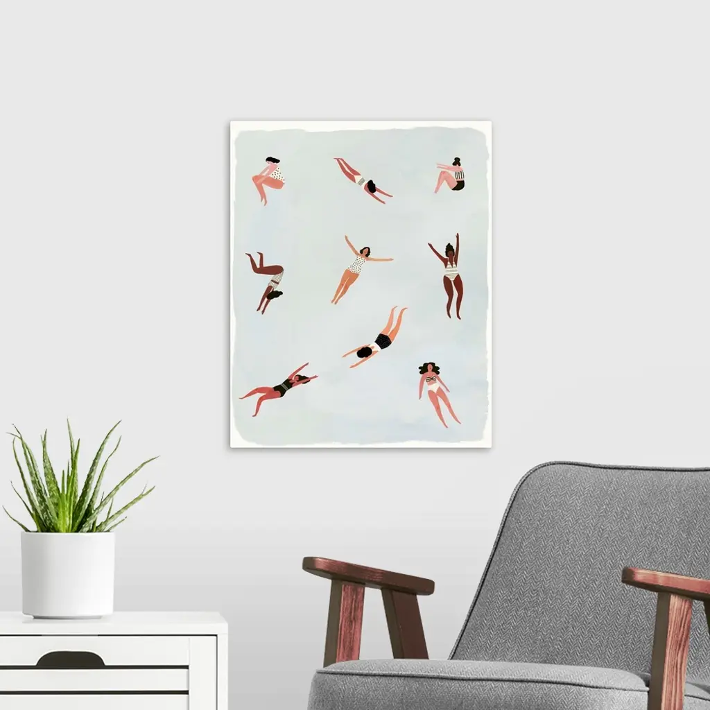 Contemporary figurative painting of various women in swim suits diving and swimming.