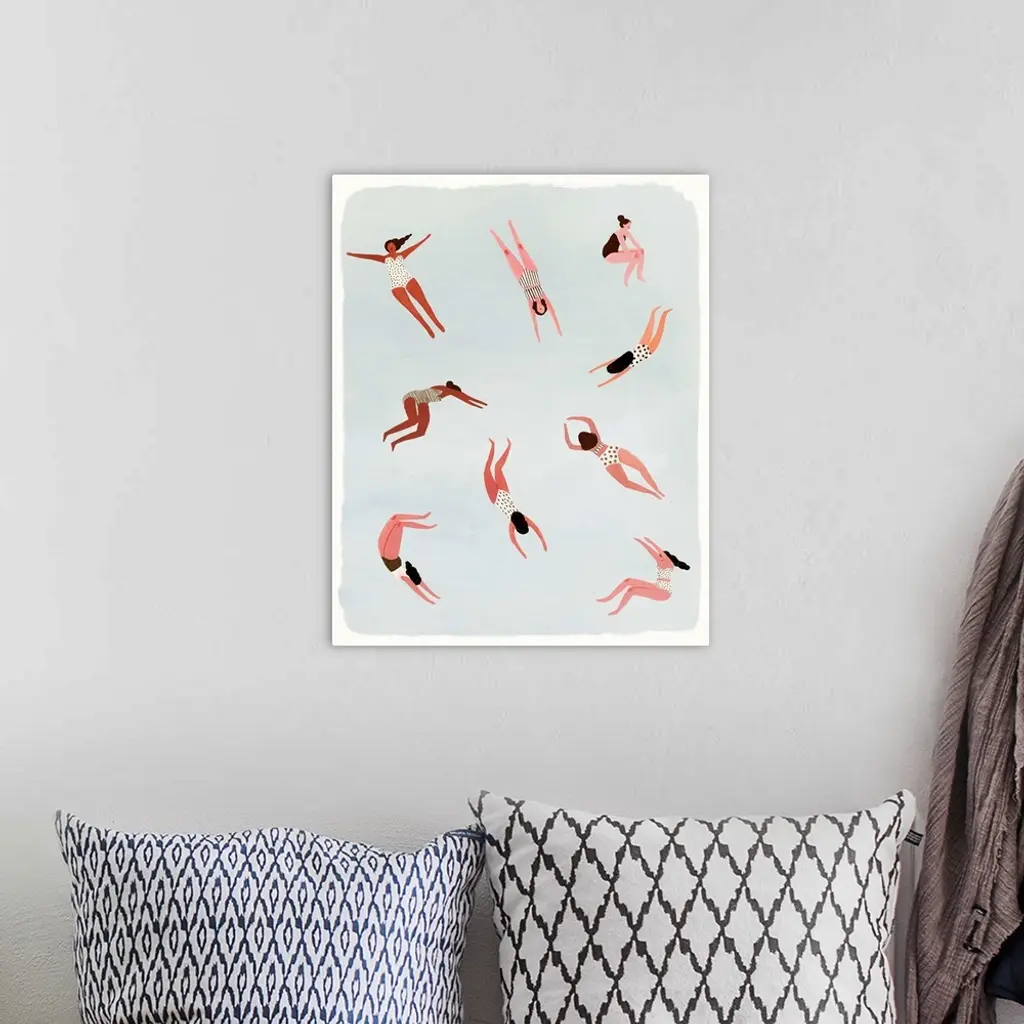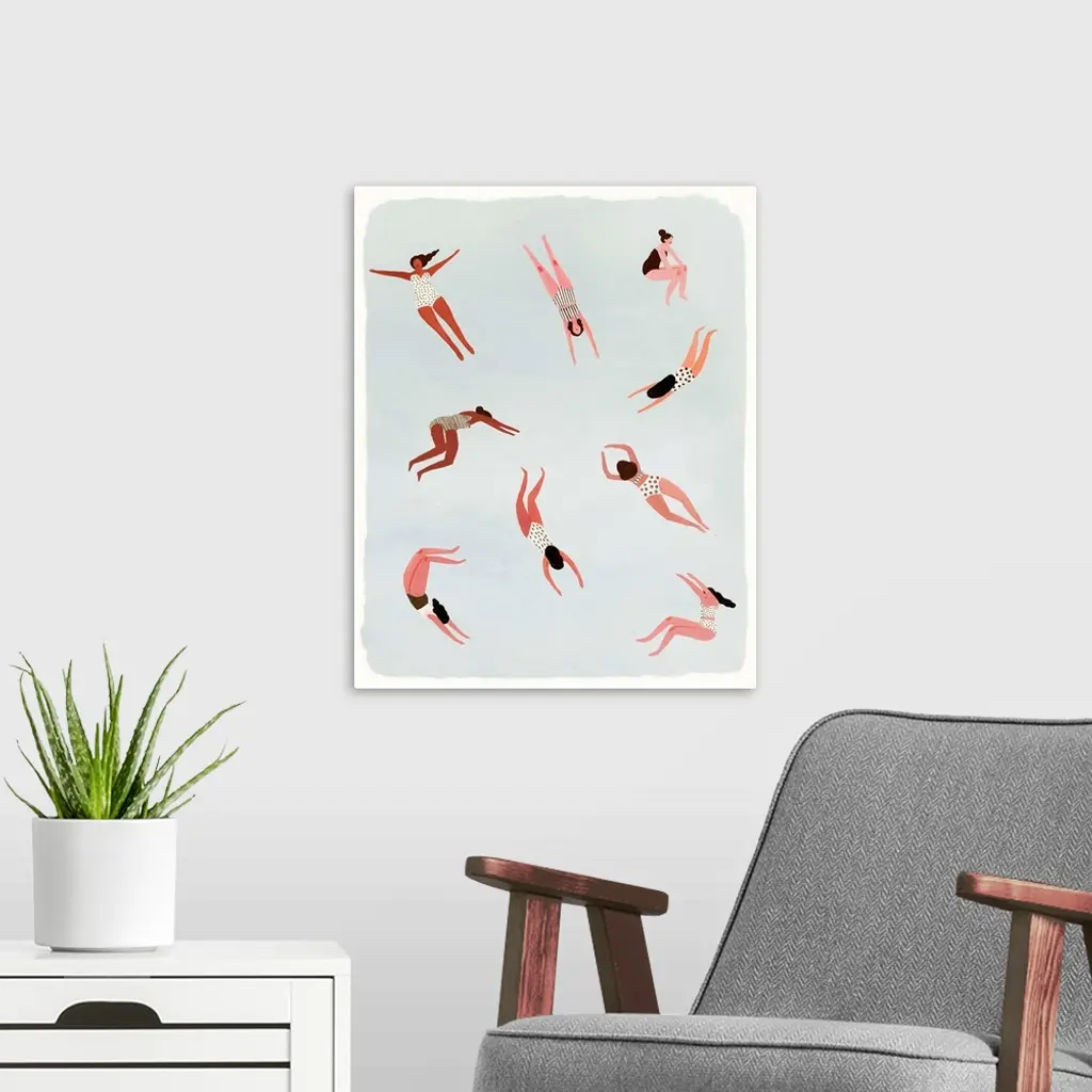 Contemporary figurative painting of various women in swim suits diving and swimming.