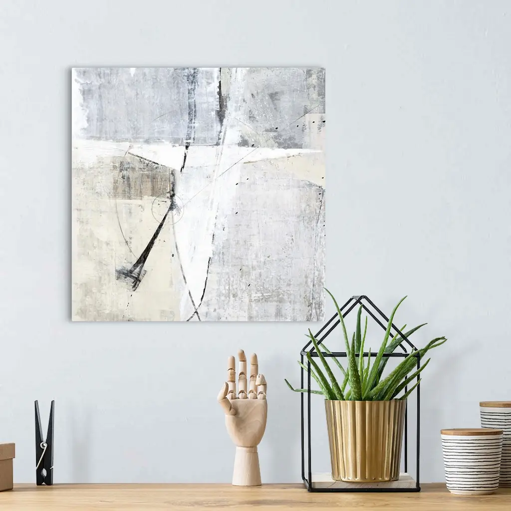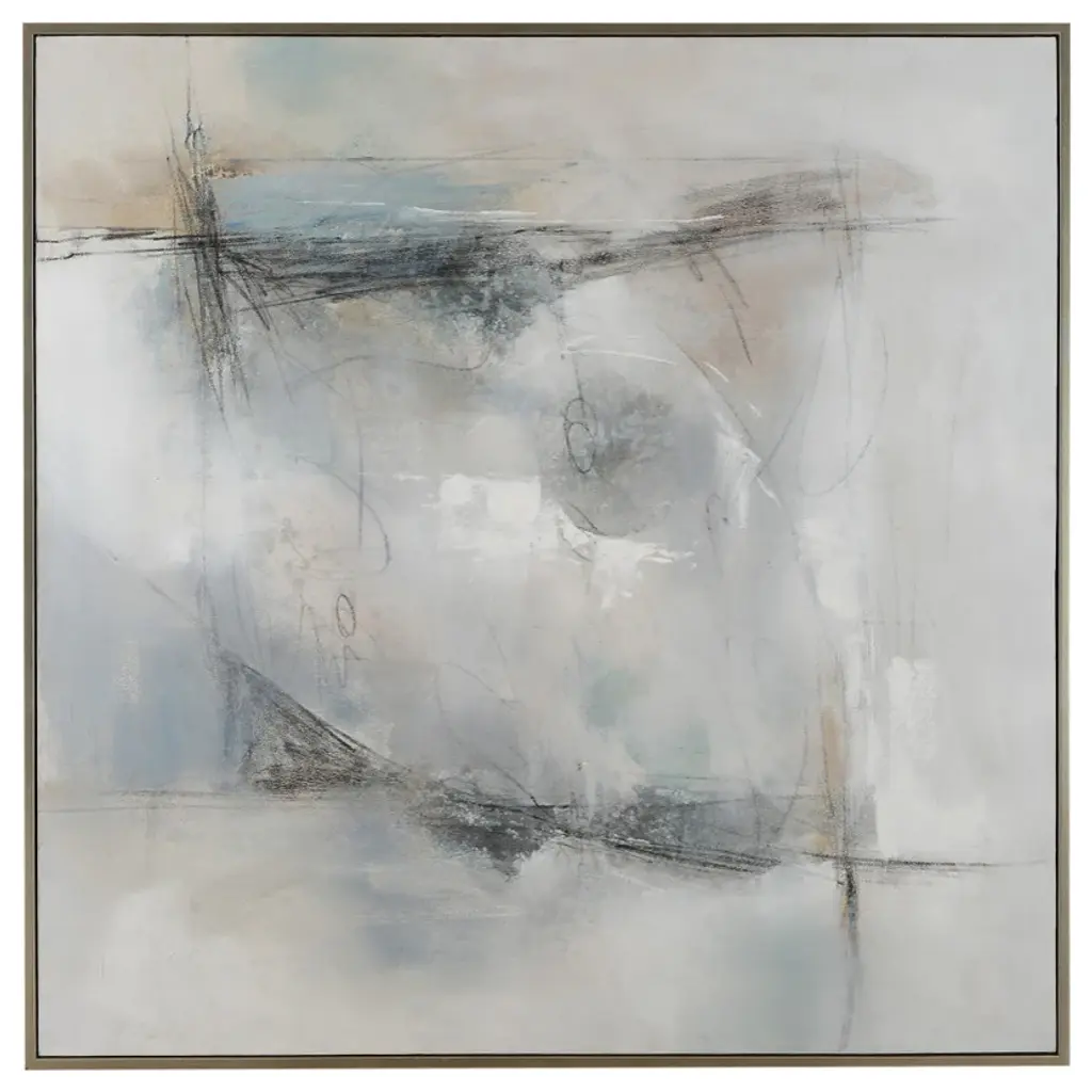 Square contemporary abstract painting with sections of gray, white, and tan hues with thin, black lines a circles throughout.