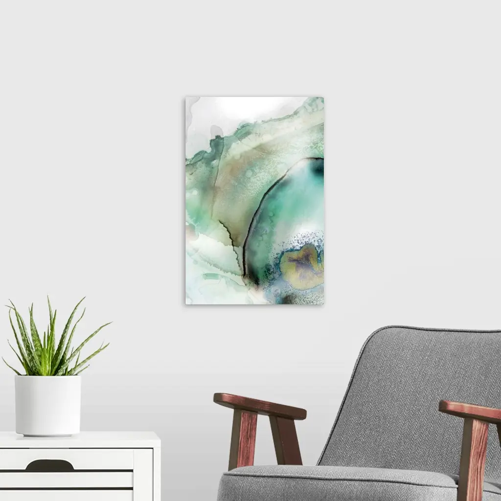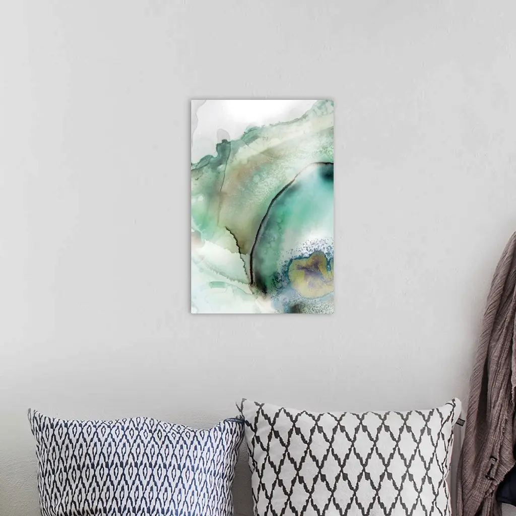 Abstract watercolor artwork of softly blending shades of teal and jade green.