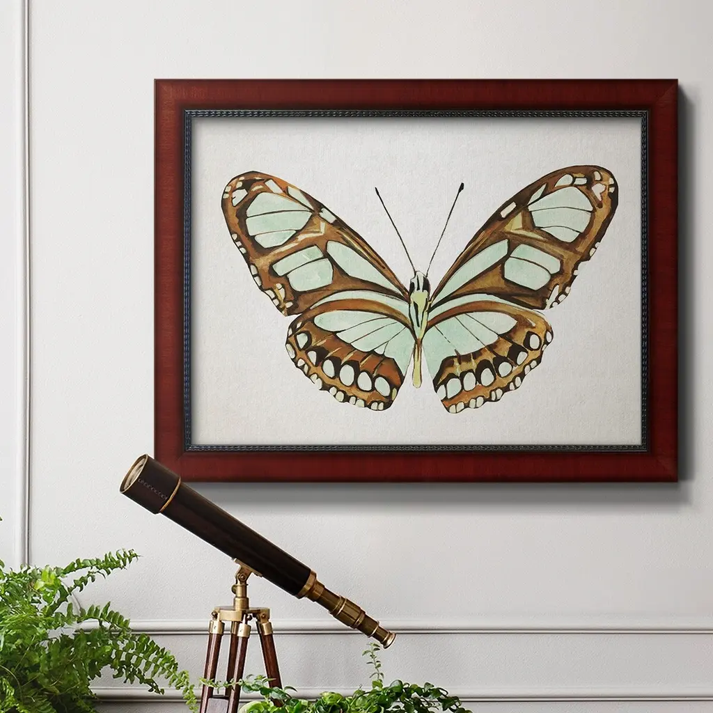 Mint Butterfly I Premium Framed Canvas- Ready to Hang A Premium Framed Canvas created to last. Framed in distressed wood and available in an array of sizes and colors Featuring a beveled a solid wood stretcher bar, each piece comes ready to hand 3 SIZES AVAILABLE 16''X20'' - Overall Size 18'X27'' - Overall Size 24''x36'' - Overall Size Each piece is made to order. Each piece comes with hanging hardware. Made in the USA Ready to Hang Giclee Paper Print Acrylic Glass Beveled Matt Board