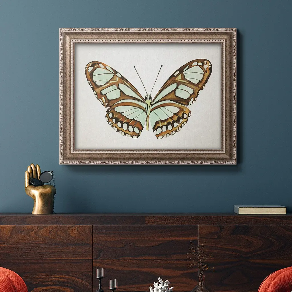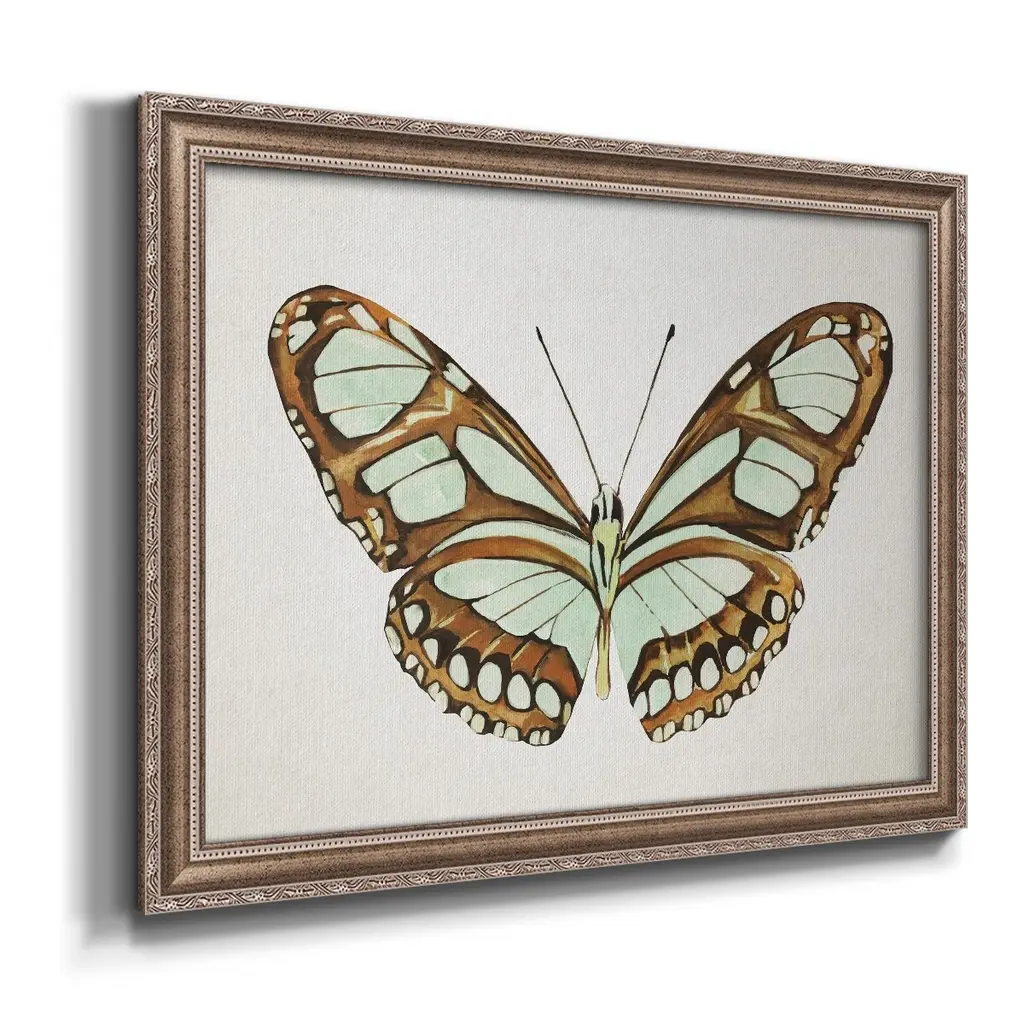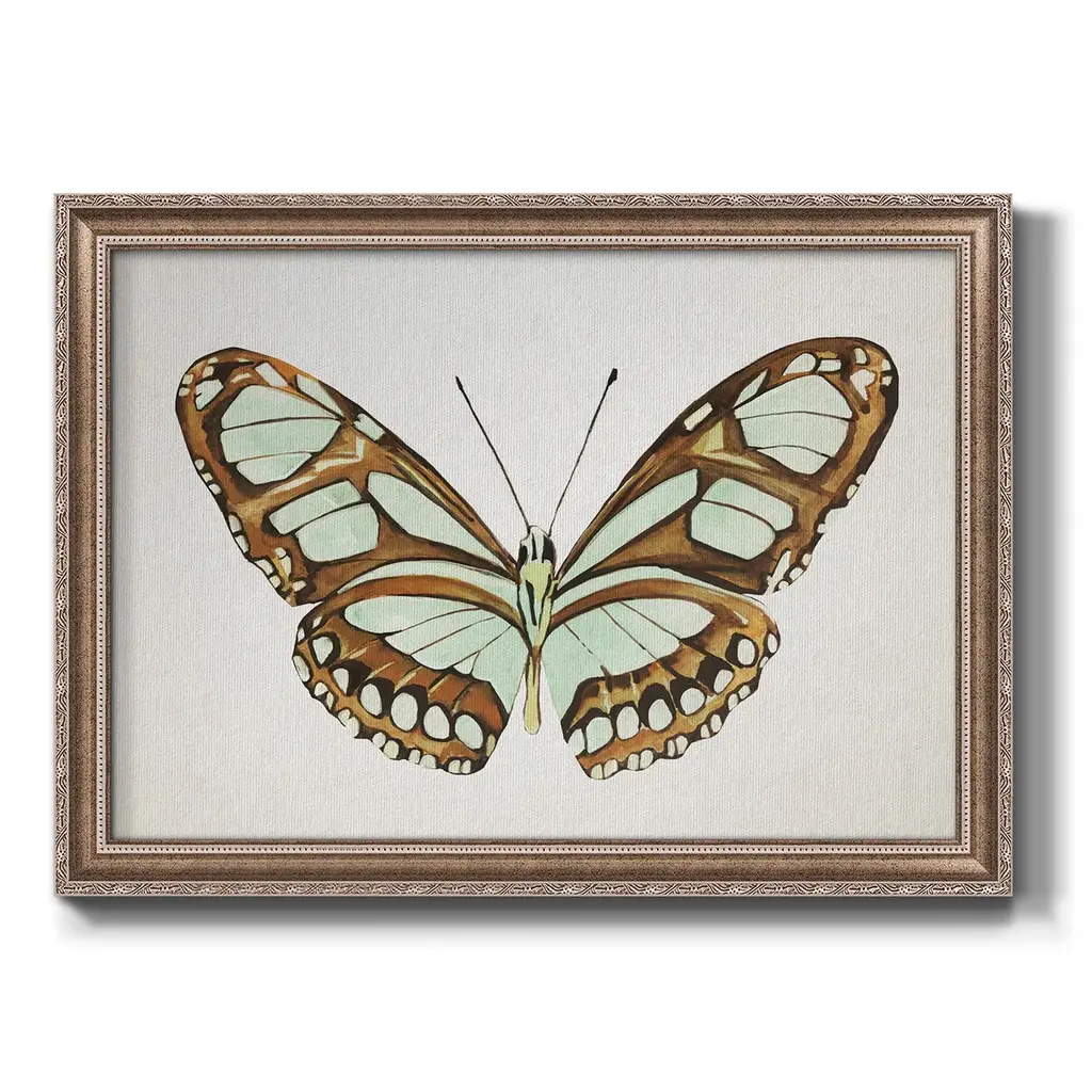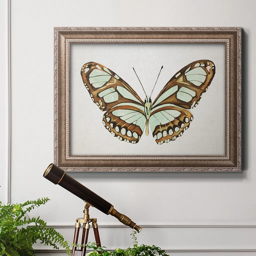 Mint Butterfly I Premium Framed Canvas- Ready to Hang A Premium Framed Canvas created to last. Framed in distressed wood and available in an array of sizes and colors Featuring a beveled a solid wood stretcher bar, each piece comes ready to hand 3 SIZES AVAILABLE 16''X20'' - Overall Size 18'X27'' - Overall Size 24''x36'' - Overall Size Each piece is made to order. Each piece comes with hanging hardware. Made in the USA Ready to Hang Giclee Paper Print Acrylic Glass Beveled Matt Board