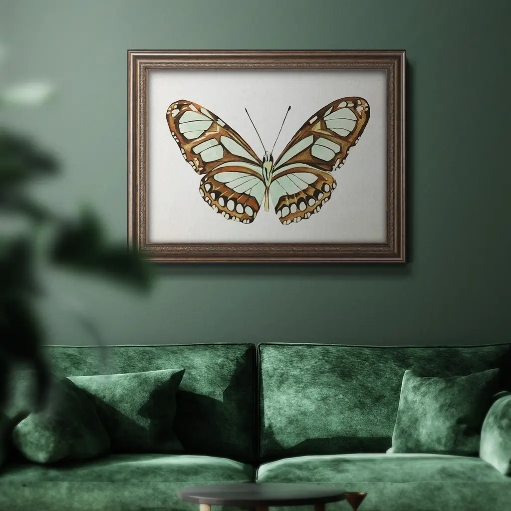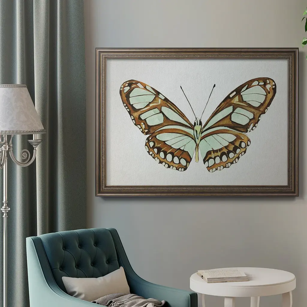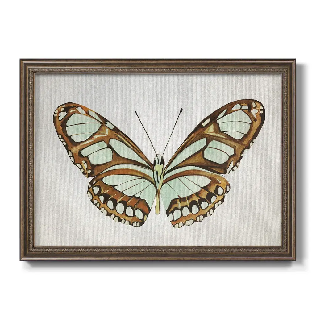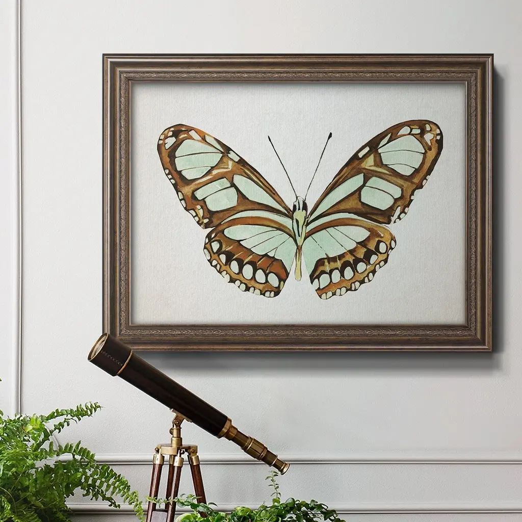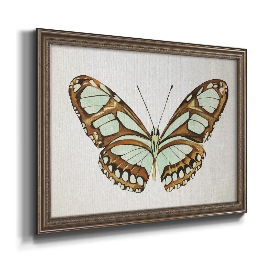 Mint Butterfly I Premium Framed Canvas- Ready to Hang A Premium Framed Canvas created to last. Framed in distressed wood and available in an array of sizes and colors Featuring a beveled a solid wood stretcher bar, each piece comes ready to hand 3 SIZES AVAILABLE 16''X20'' - Overall Size 18'X27'' - Overall Size 24''x36'' - Overall Size Each piece is made to order. Each piece comes with hanging hardware. Made in the USA Ready to Hang Giclee Paper Print Acrylic Glass Beveled Matt Board
