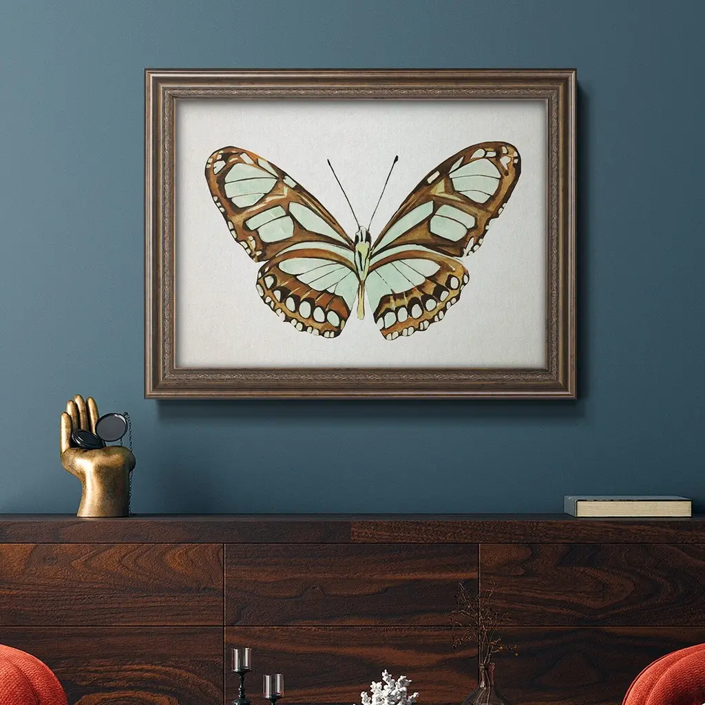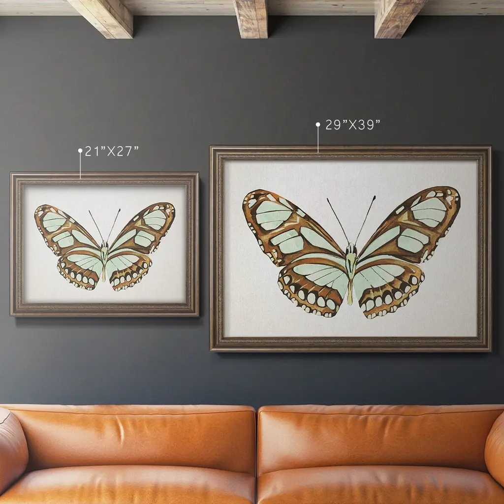 Mint Butterfly I Premium Framed Canvas- Ready to Hang A Premium Framed Canvas created to last. Framed in distressed wood and available in an array of sizes and colors Featuring a beveled a solid wood stretcher bar, each piece comes ready to hand 3 SIZES AVAILABLE 16''X20'' - Overall Size 18'X27'' - Overall Size 24''x36'' - Overall Size Each piece is made to order. Each piece comes with hanging hardware. Made in the USA Ready to Hang Giclee Paper Print Acrylic Glass Beveled Matt Board