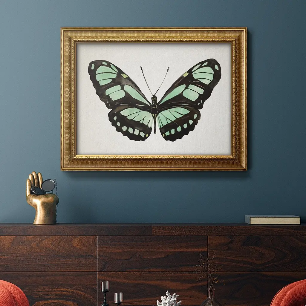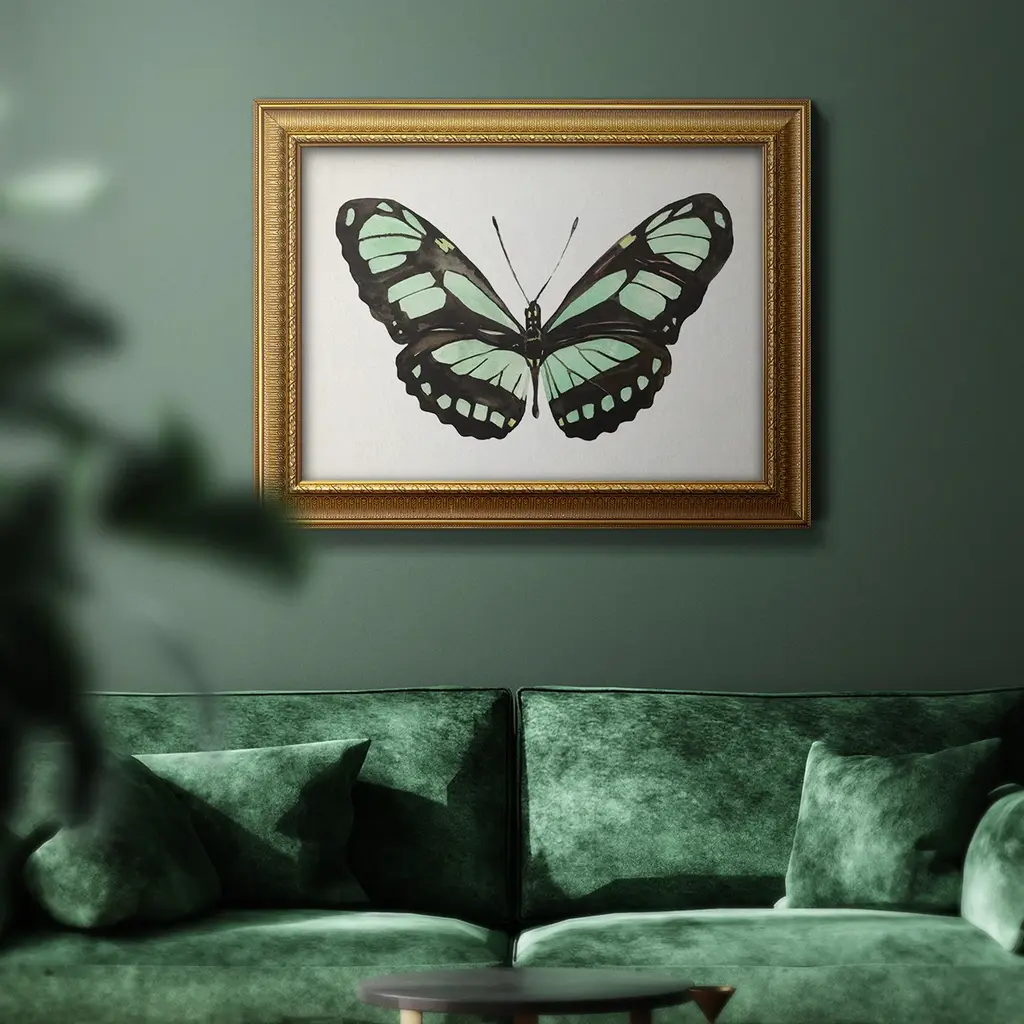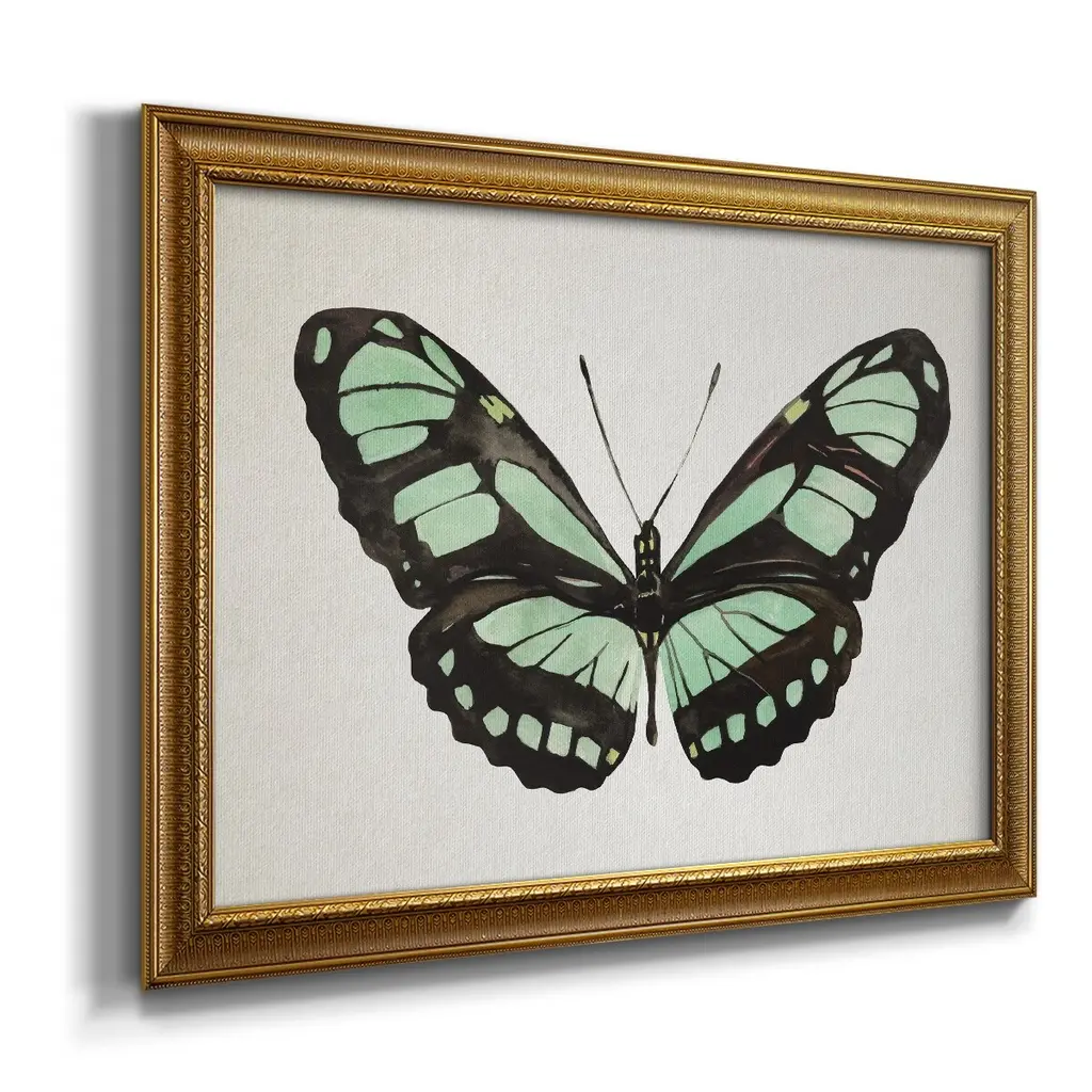 Mint Butterfly II Premium Framed Canvas- Ready to Hang A Premium Framed Canvas created to last. Framed in distressed wood and available in an array of sizes and colors Featuring a beveled a solid wood stretcher bar, each piece comes ready to hand 3 SIZES AVAILABLE 16''X20'' - Overall Size 18'X27'' - Overall Size 24''x36'' - Overall Size Each piece is made to order. Each piece comes with hanging hardware. Made in the USA Ready to Hang Giclee Paper Print Acrylic Glass Beveled Matt Board