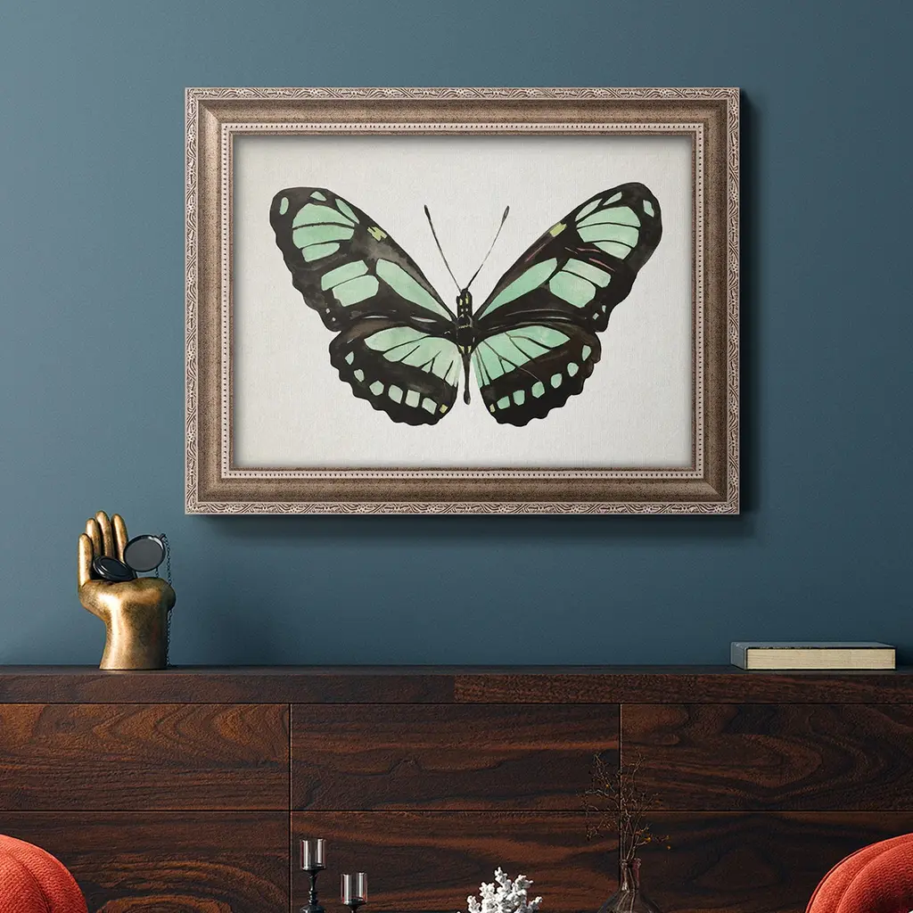Mint Butterfly II Premium Framed Canvas- Ready to Hang A Premium Framed Canvas created to last. Framed in distressed wood and available in an array of sizes and colors Featuring a beveled a solid wood stretcher bar, each piece comes ready to hand 3 SIZES AVAILABLE 16''X20'' - Overall Size 18'X27'' - Overall Size 24''x36'' - Overall Size Each piece is made to order. Each piece comes with hanging hardware. Made in the USA Ready to Hang Giclee Paper Print Acrylic Glass Beveled Matt Board