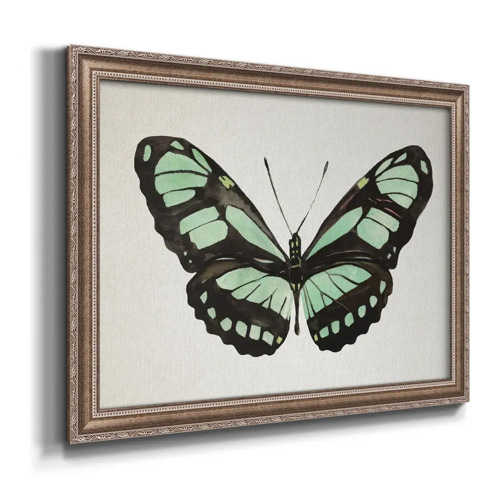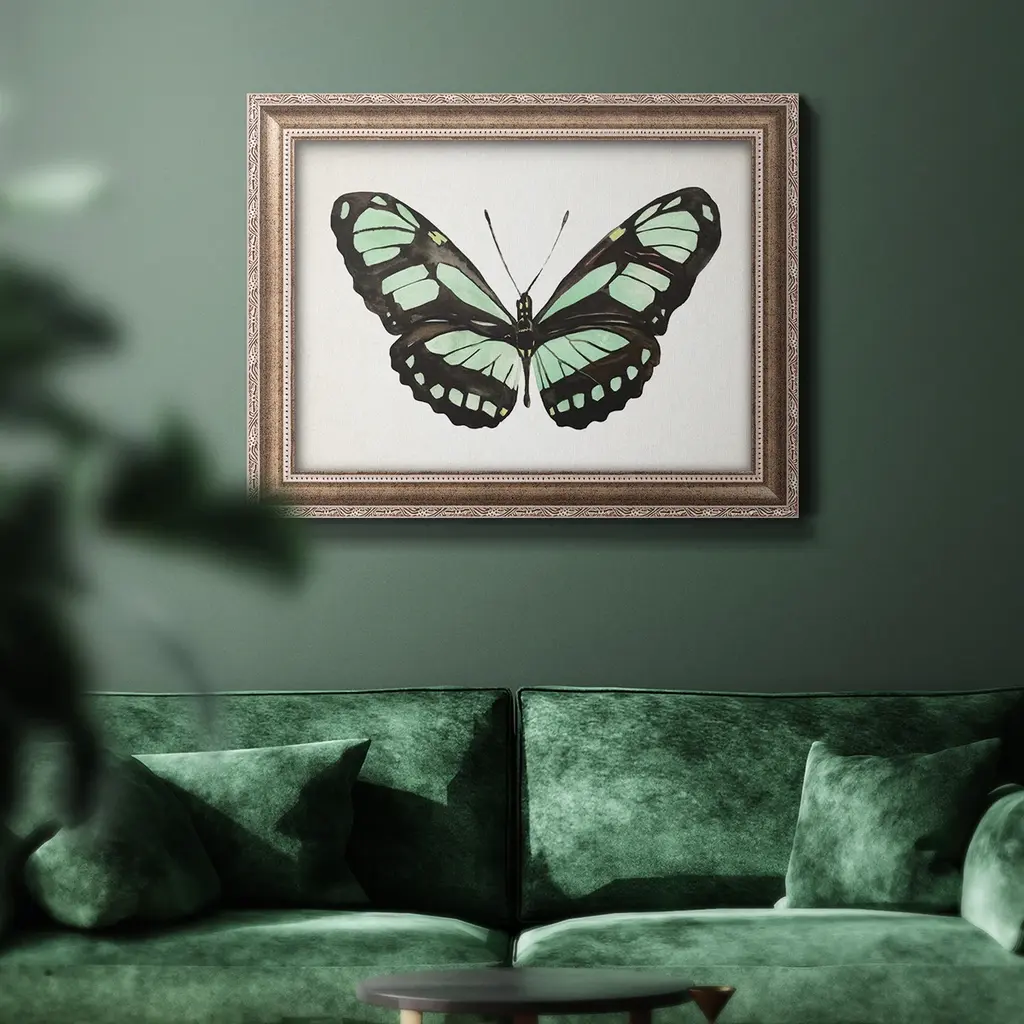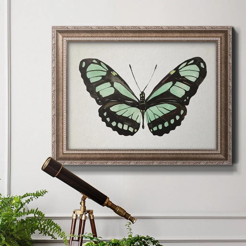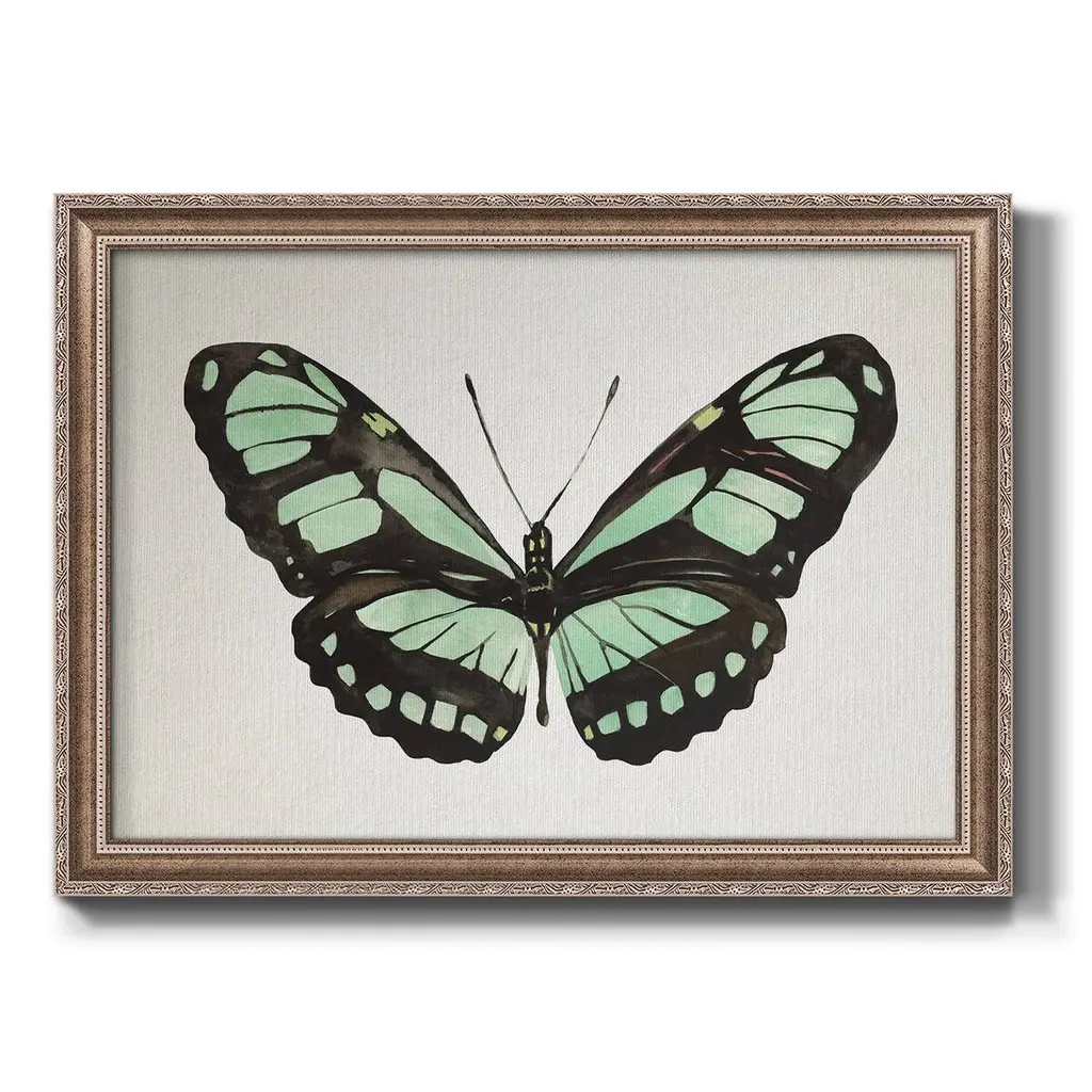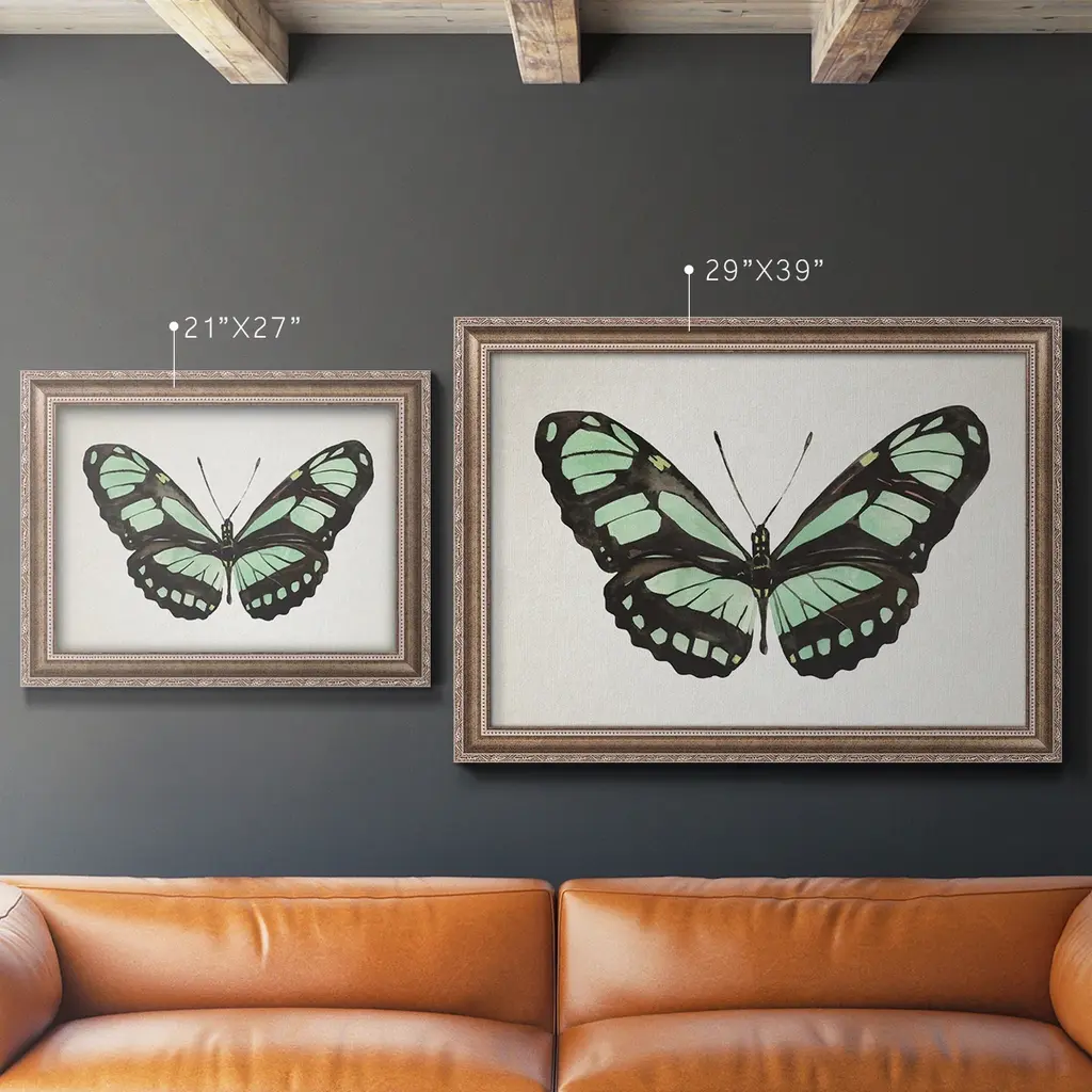 Mint Butterfly II Premium Framed Canvas- Ready to Hang A Premium Framed Canvas created to last. Framed in distressed wood and available in an array of sizes and colors Featuring a beveled a solid wood stretcher bar, each piece comes ready to hand 3 SIZES AVAILABLE 16''X20'' - Overall Size 18'X27'' - Overall Size 24''x36'' - Overall Size Each piece is made to order. Each piece comes with hanging hardware. Made in the USA Ready to Hang Giclee Paper Print Acrylic Glass Beveled Matt Board