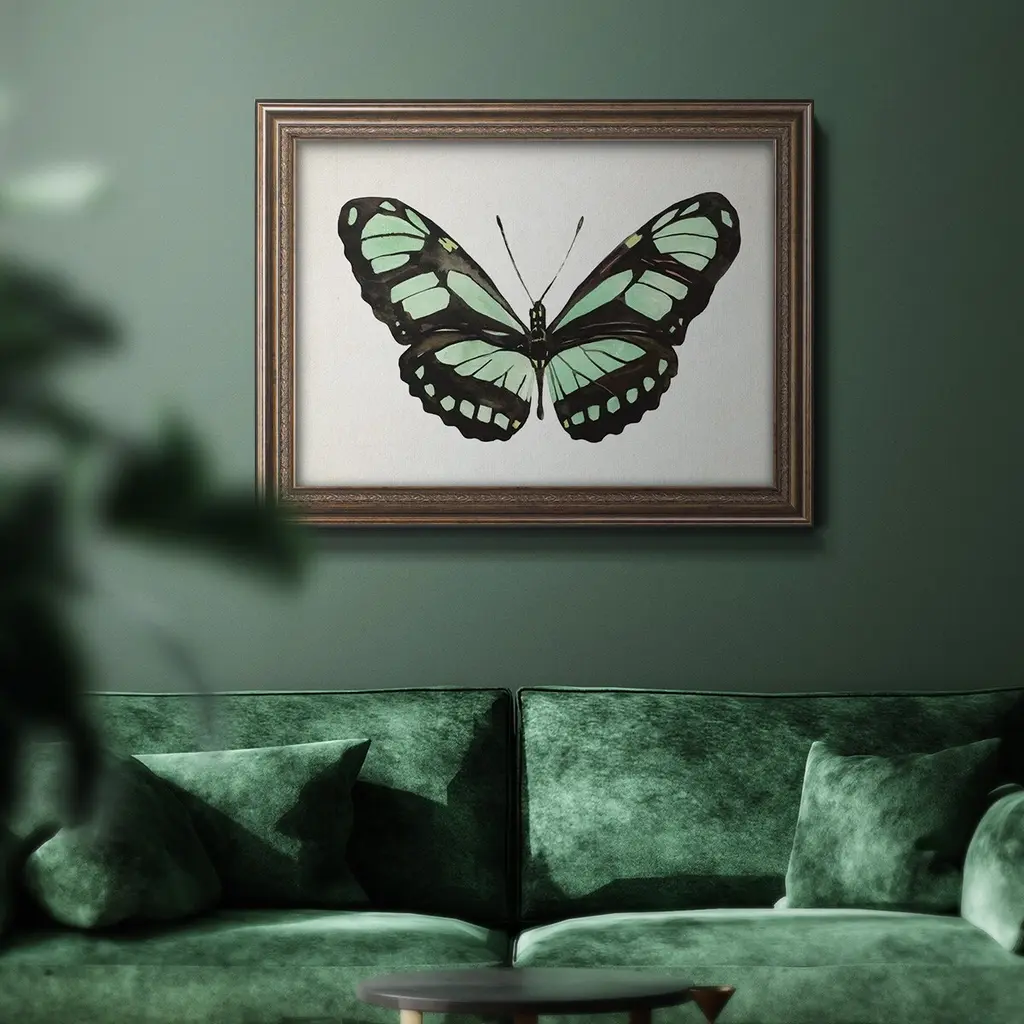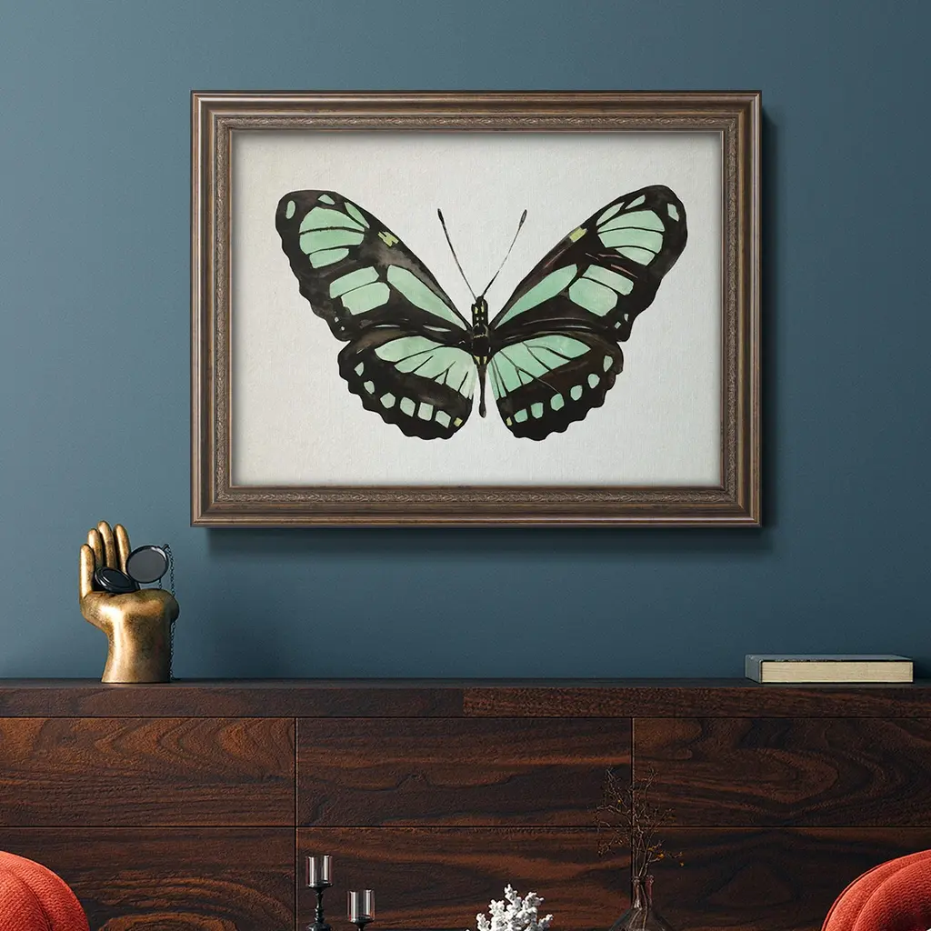 Mint Butterfly II Premium Framed Canvas- Ready to Hang A Premium Framed Canvas created to last. Framed in distressed wood and available in an array of sizes and colors Featuring a beveled a solid wood stretcher bar, each piece comes ready to hand 3 SIZES AVAILABLE 16''X20'' - Overall Size 18'X27'' - Overall Size 24''x36'' - Overall Size Each piece is made to order. Each piece comes with hanging hardware. Made in the USA Ready to Hang Giclee Paper Print Acrylic Glass Beveled Matt Board