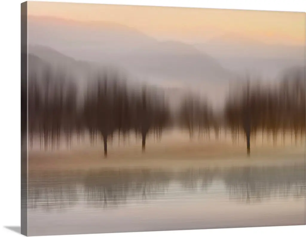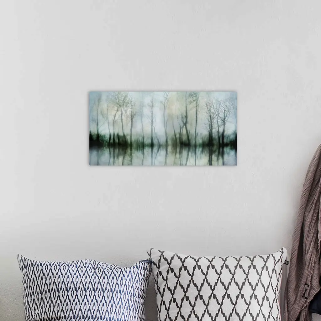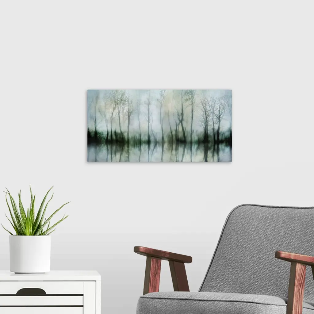 Contemporary artwork of shadowy bare trees at the edge of a pond.