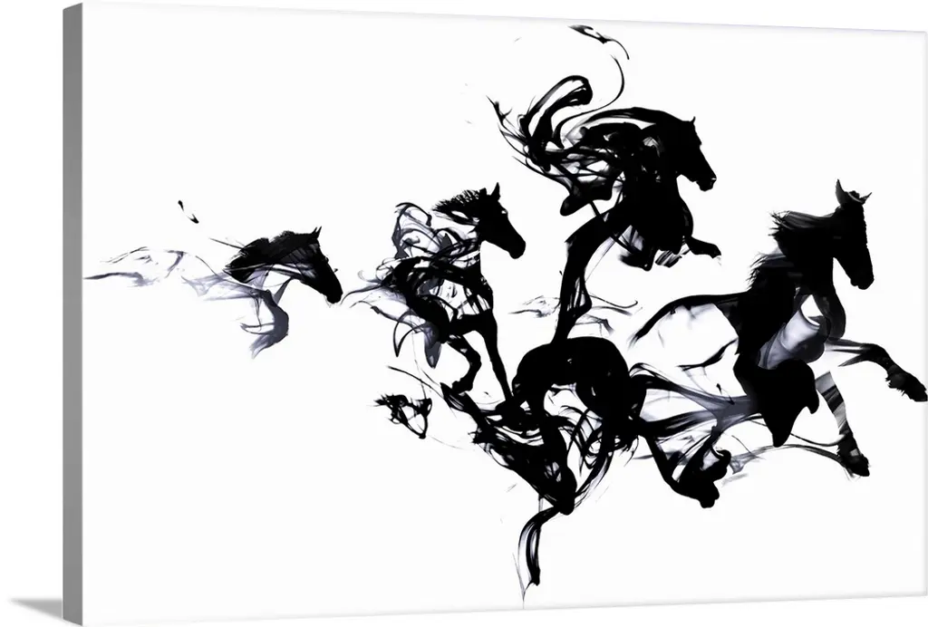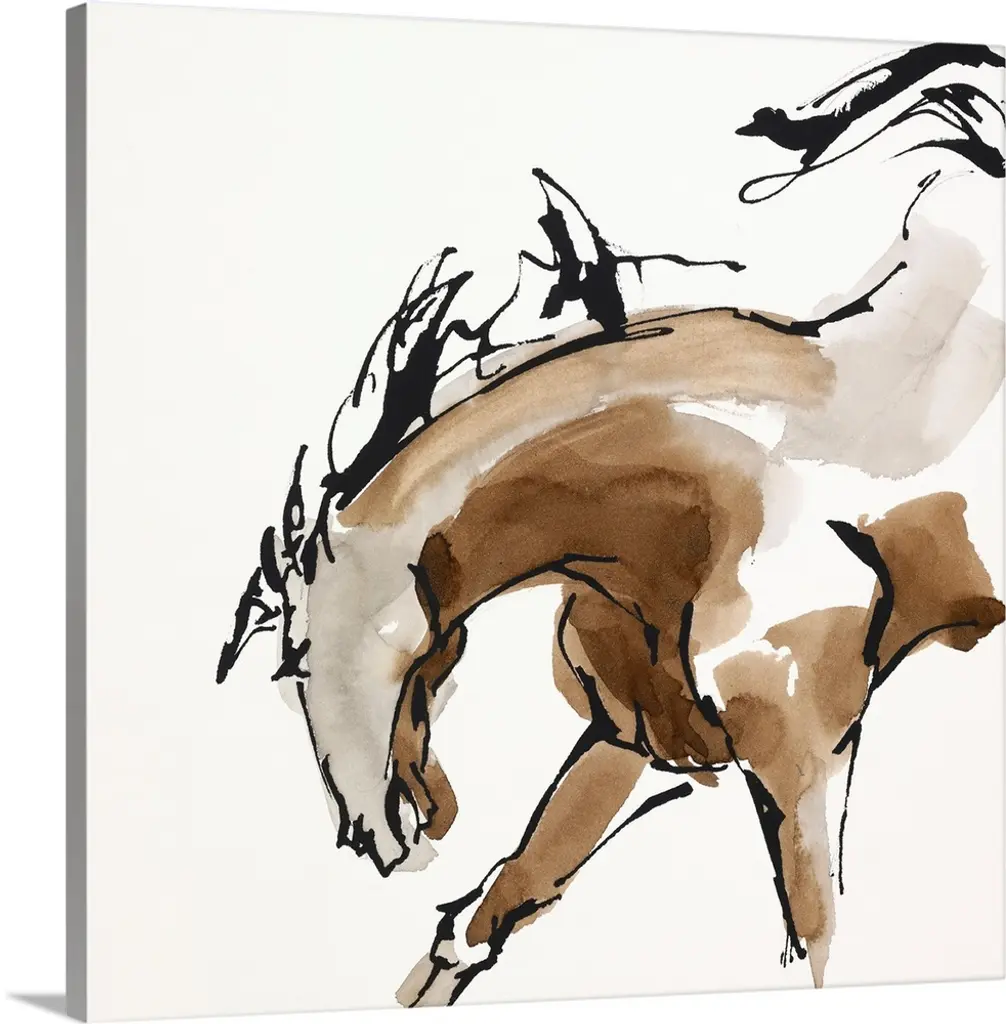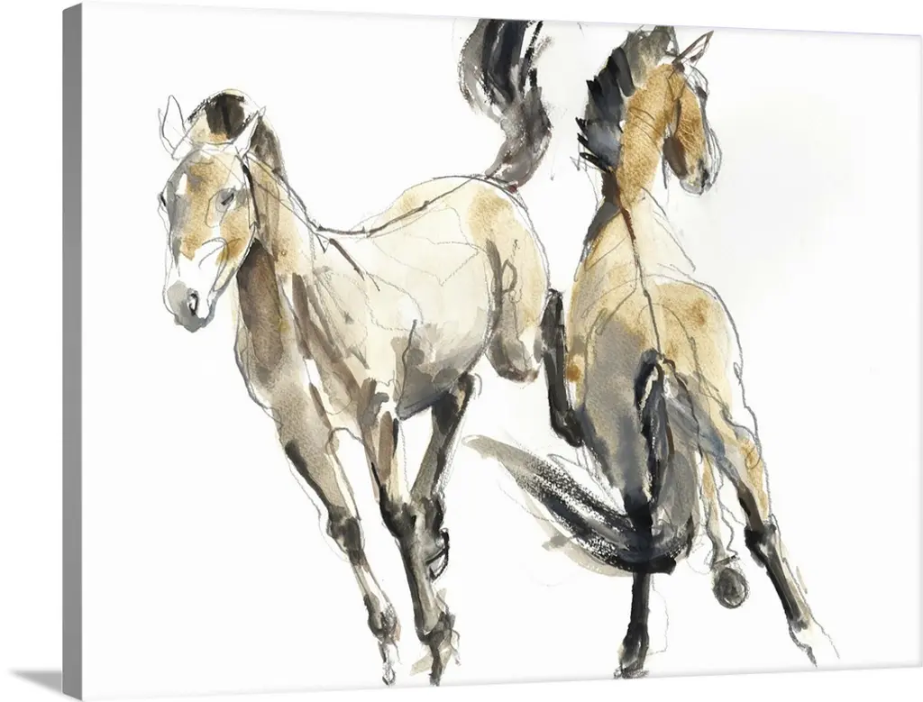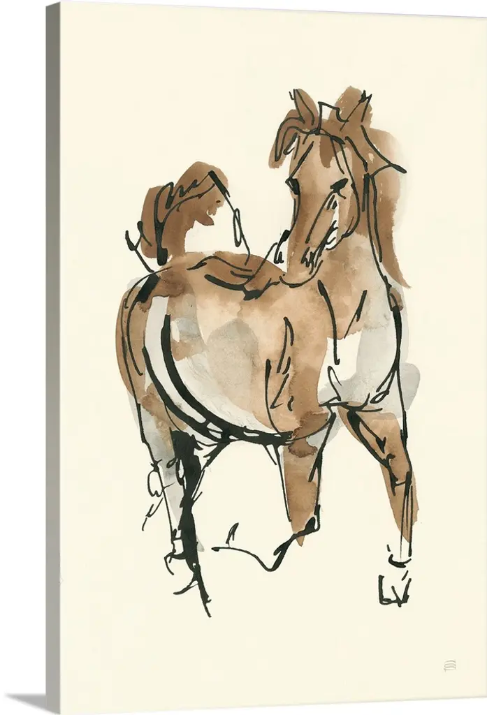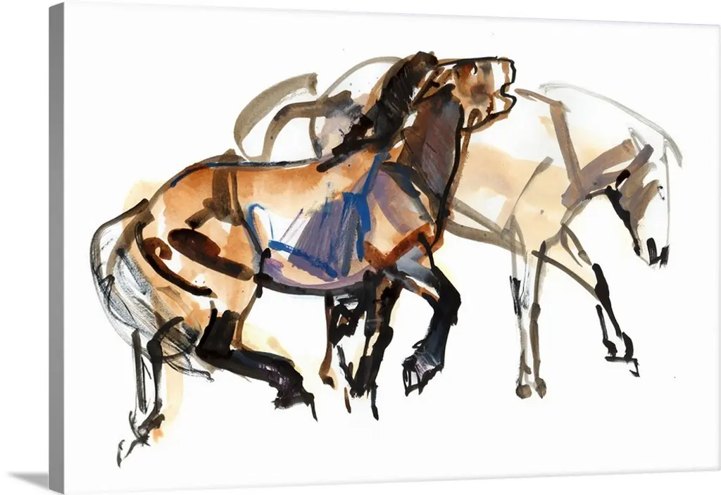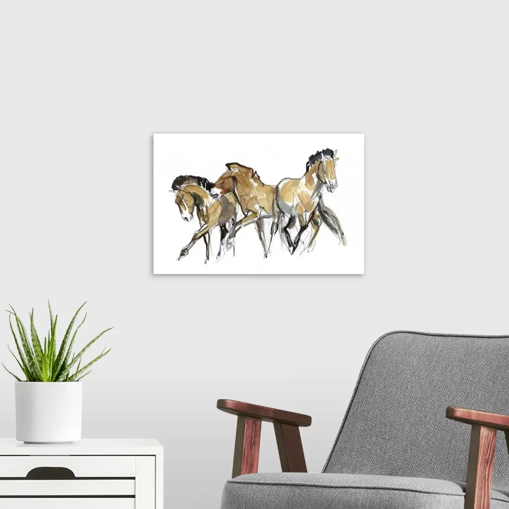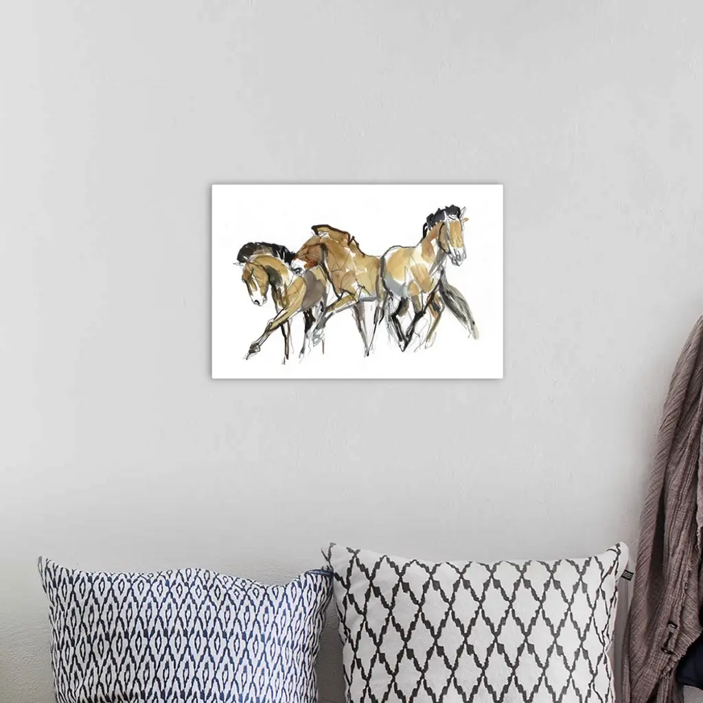 Contemporary artwork of three Mongolian Przewalski horses against a white background.