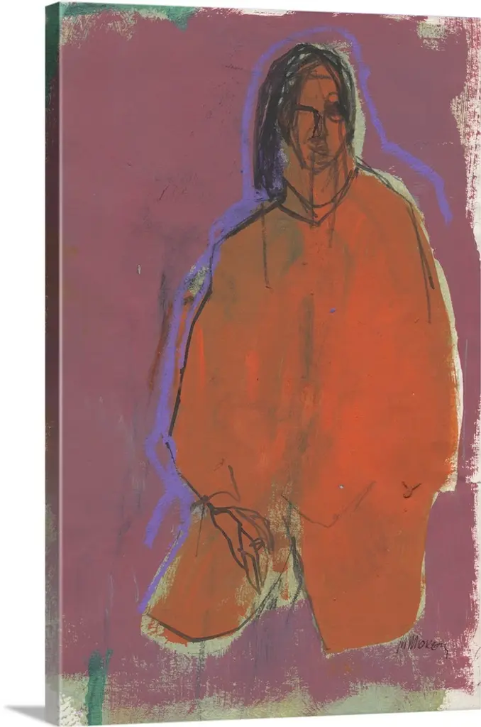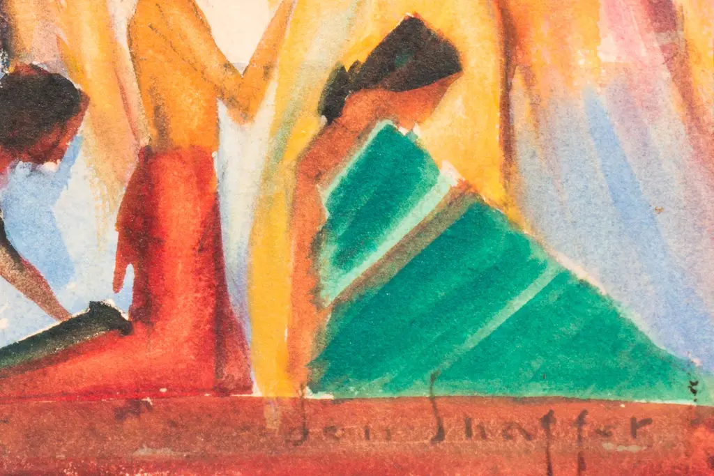 A period cabinet-size figural watercolor painted in a Cubist-derived, Modernist style and showing three women in attitudes of veneration and silhouetted contrasted against a fiery background. Signed lower right, "Jon Schaffer" (American, 20th century) and dated on verso 1962. Unframed.