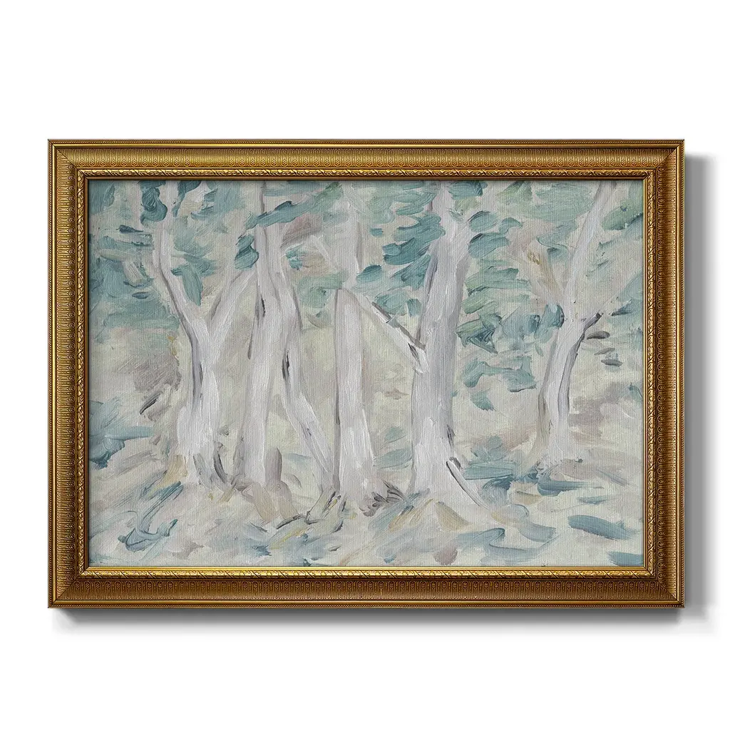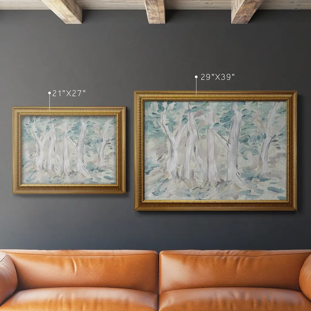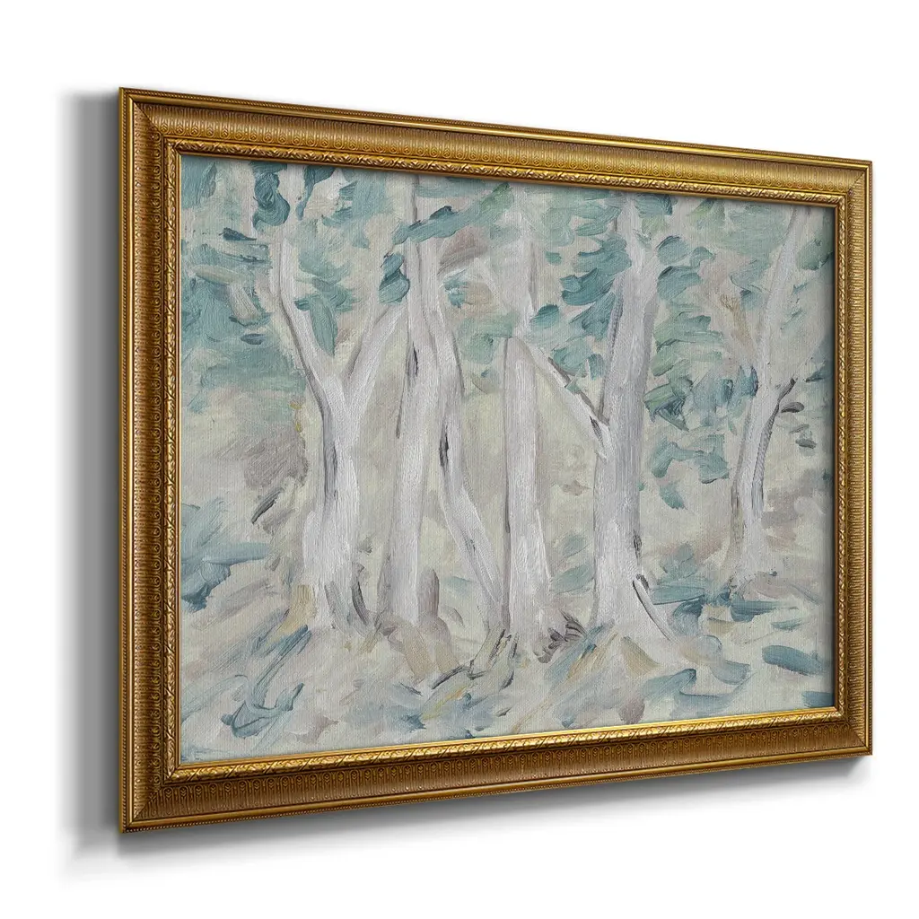 Misty Autumn Forest II Premium Framed Canvas- Ready to Hang A Premium Framed Canvas created to last. Framed in distressed wood and available in an array of sizes and colors Featuring a beveled a solid wood stretcher bar, each piece comes ready to hand 3 SIZES AVAILABLE 16''X20'' - Overall Size 18'X27'' - Overall Size 24''x36'' - Overall Size Each piece is made to order. Each piece comes with hanging hardware. Made in the USA Ready to Hang Giclee Paper Print Acrylic Glass Beveled Matt Board