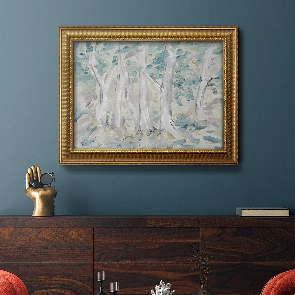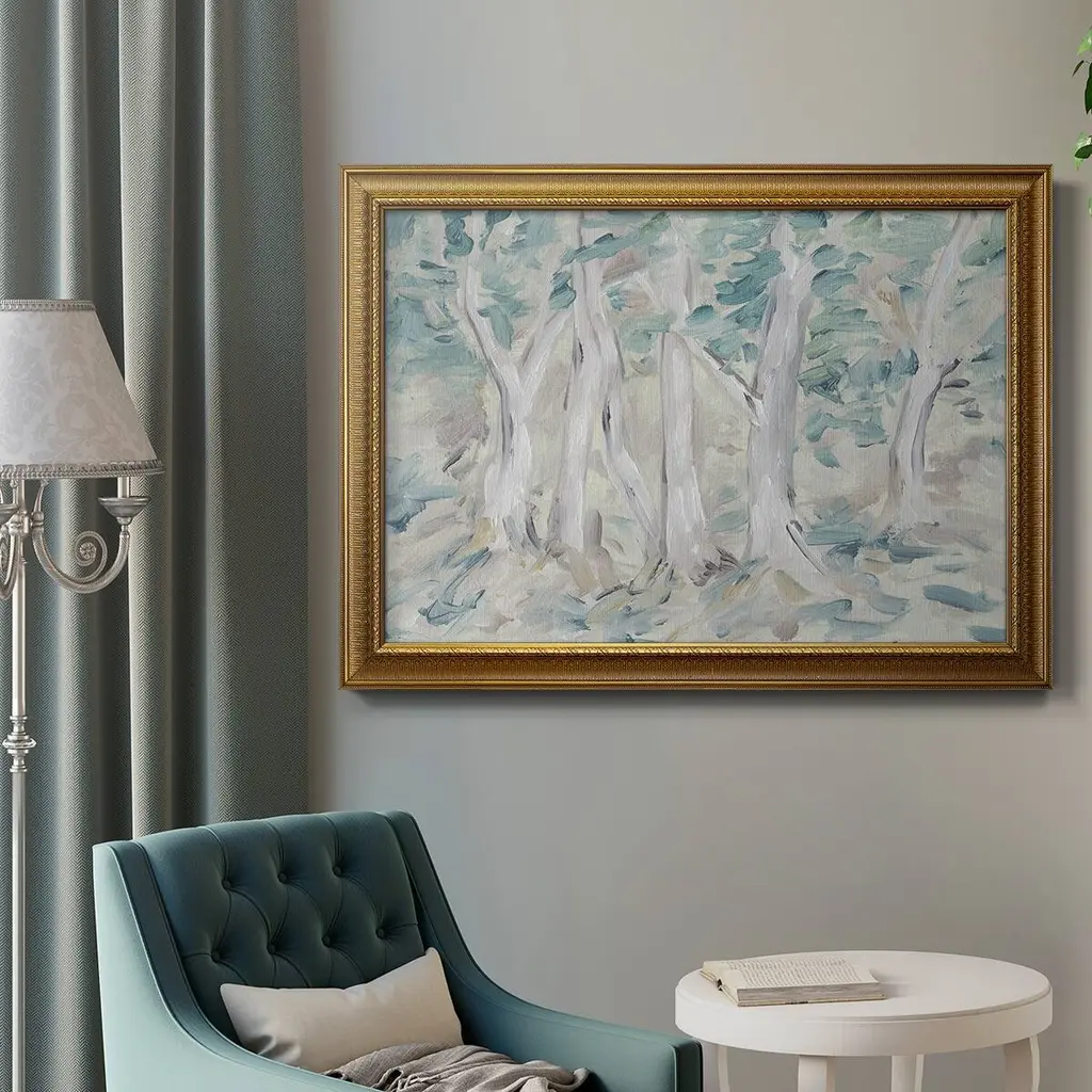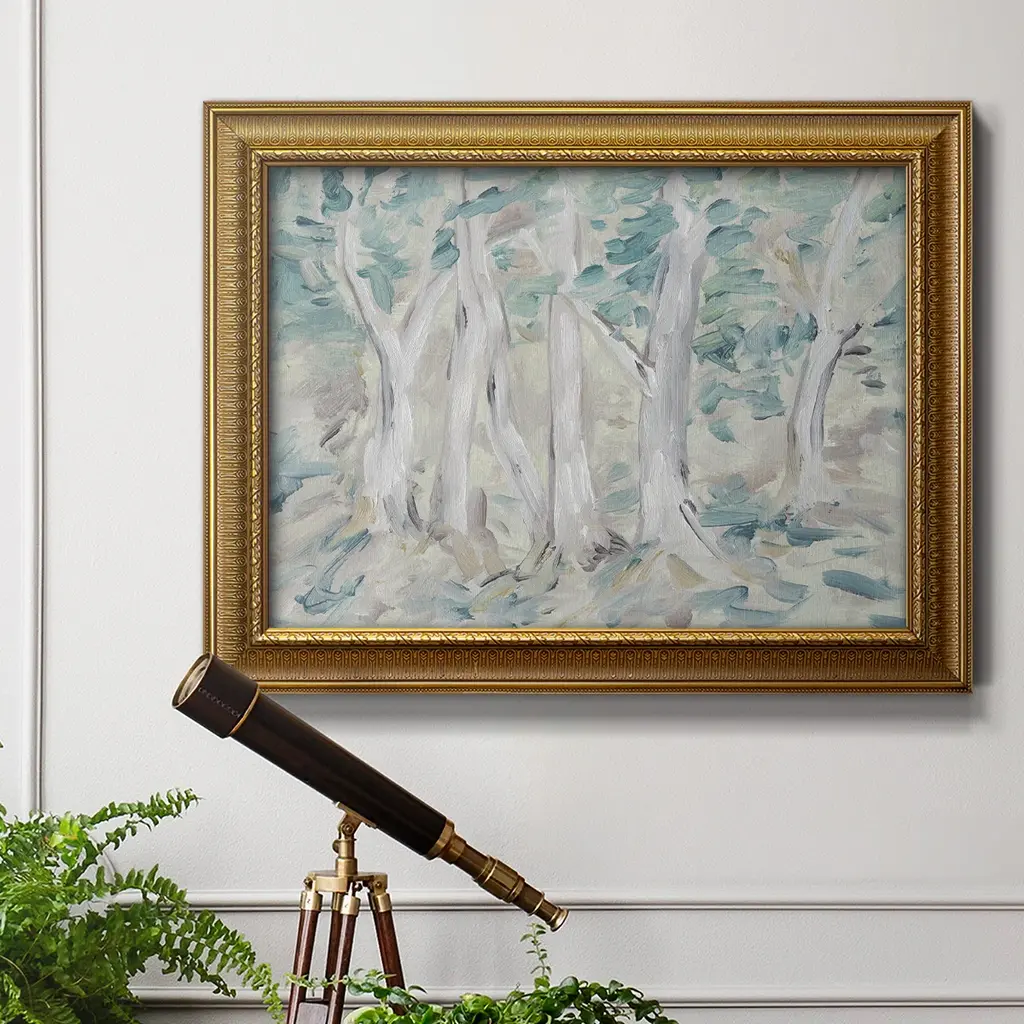 Misty Autumn Forest II Premium Framed Canvas- Ready to Hang A Premium Framed Canvas created to last. Framed in distressed wood and available in an array of sizes and colors Featuring a beveled a solid wood stretcher bar, each piece comes ready to hand 3 SIZES AVAILABLE 16''X20'' - Overall Size 18'X27'' - Overall Size 24''x36'' - Overall Size Each piece is made to order. Each piece comes with hanging hardware. Made in the USA Ready to Hang Giclee Paper Print Acrylic Glass Beveled Matt Board