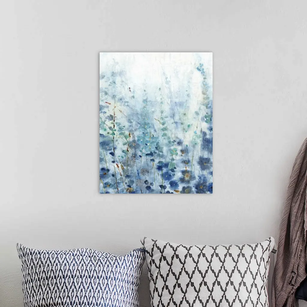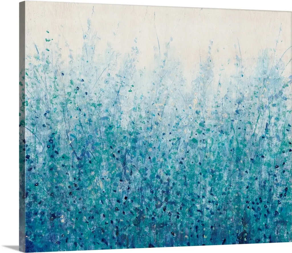 Contemporary painting of a patch of wildflowers made in shades of blue with gold accents.