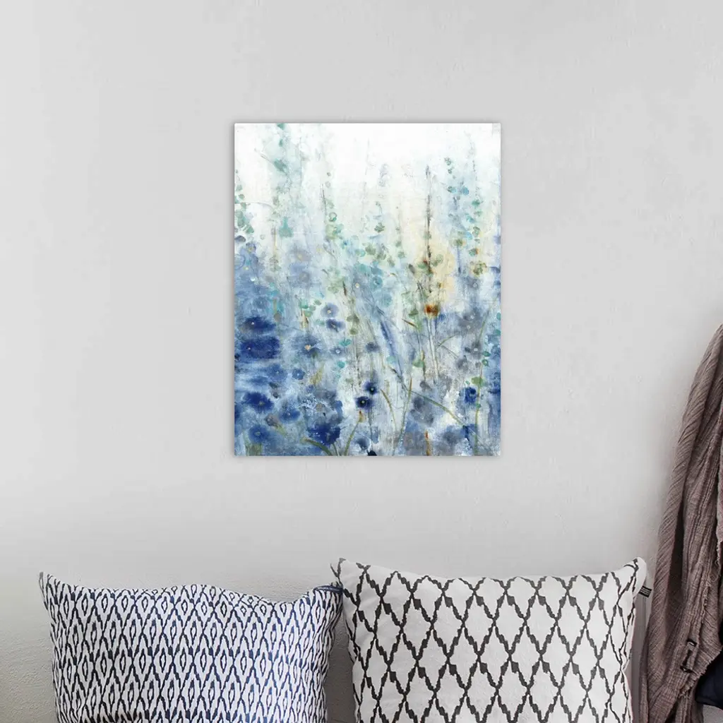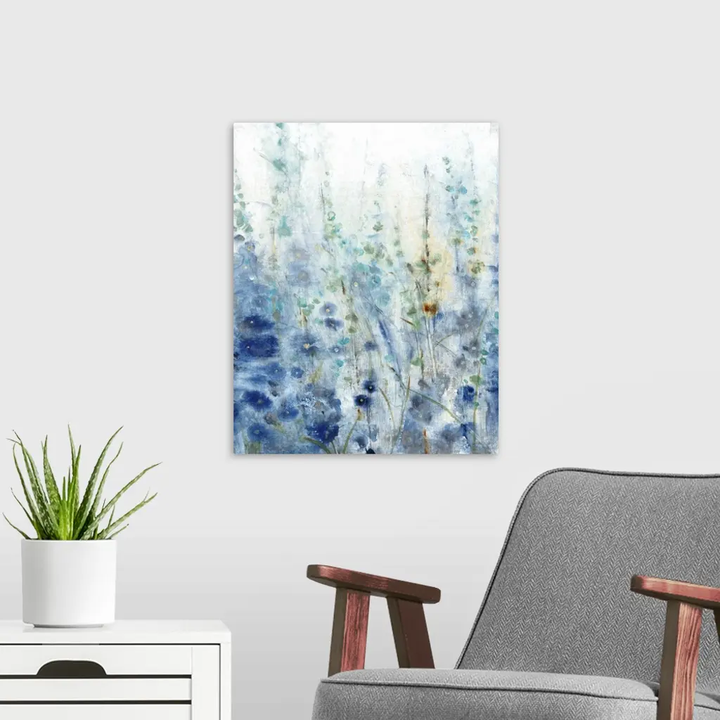 Contemporary painting of a patch of wildflowers made in shades of blue with gold accents.