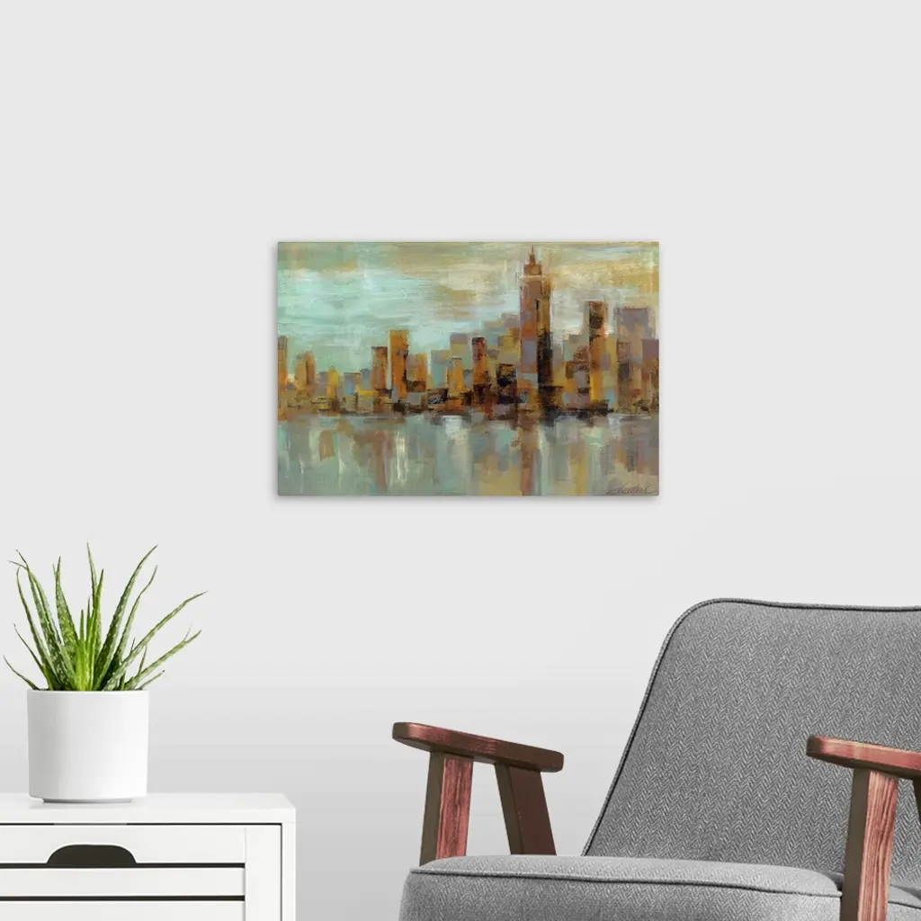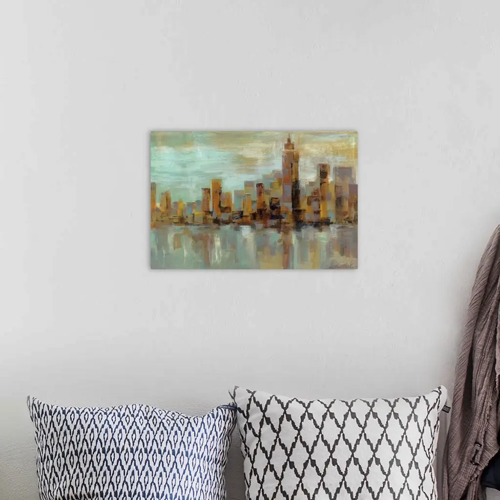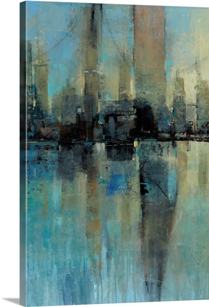 Abstract painting of a misty cityscape with buildings made out of broad strokes.