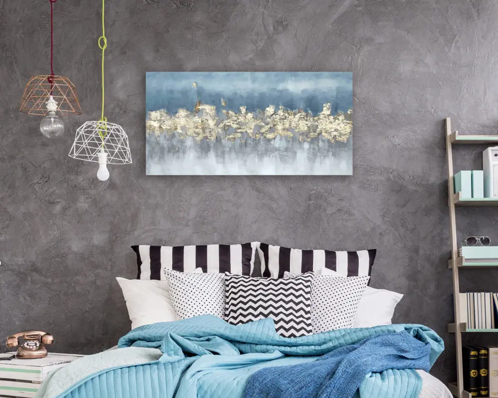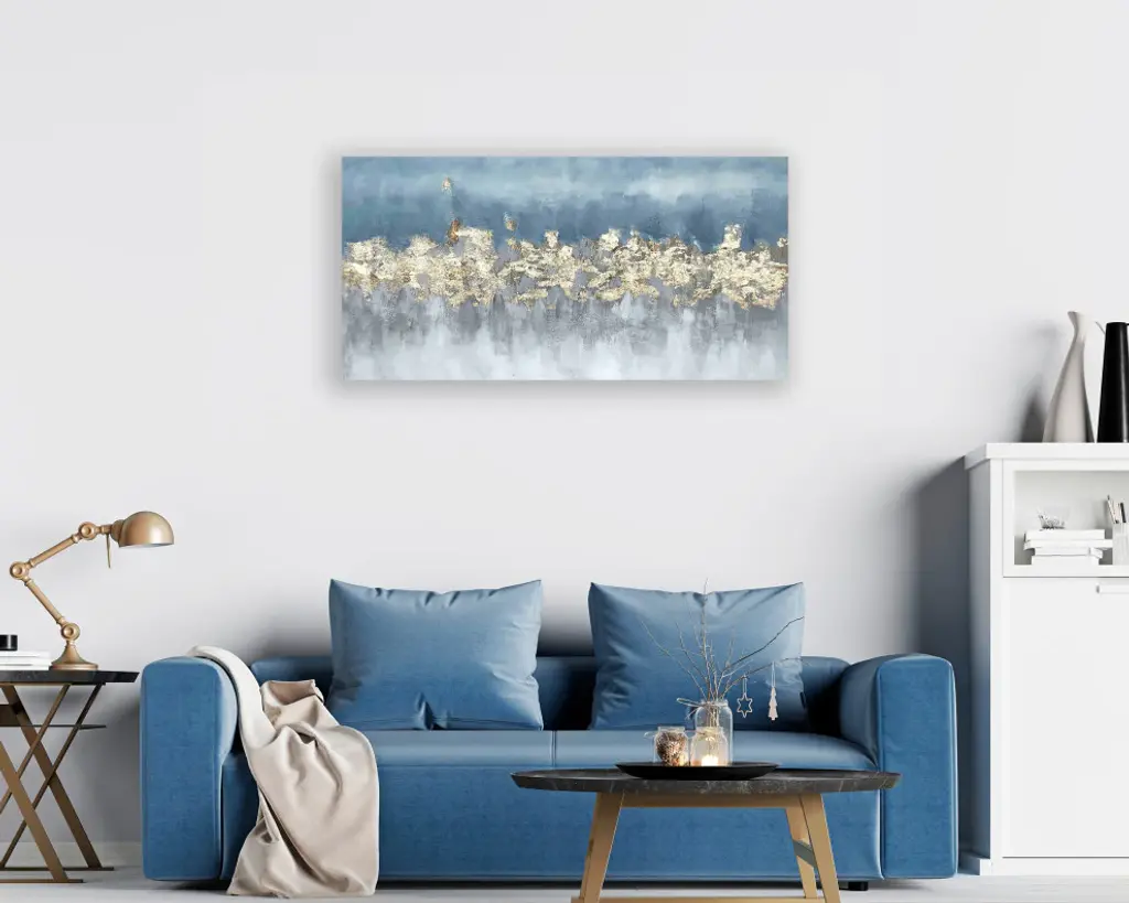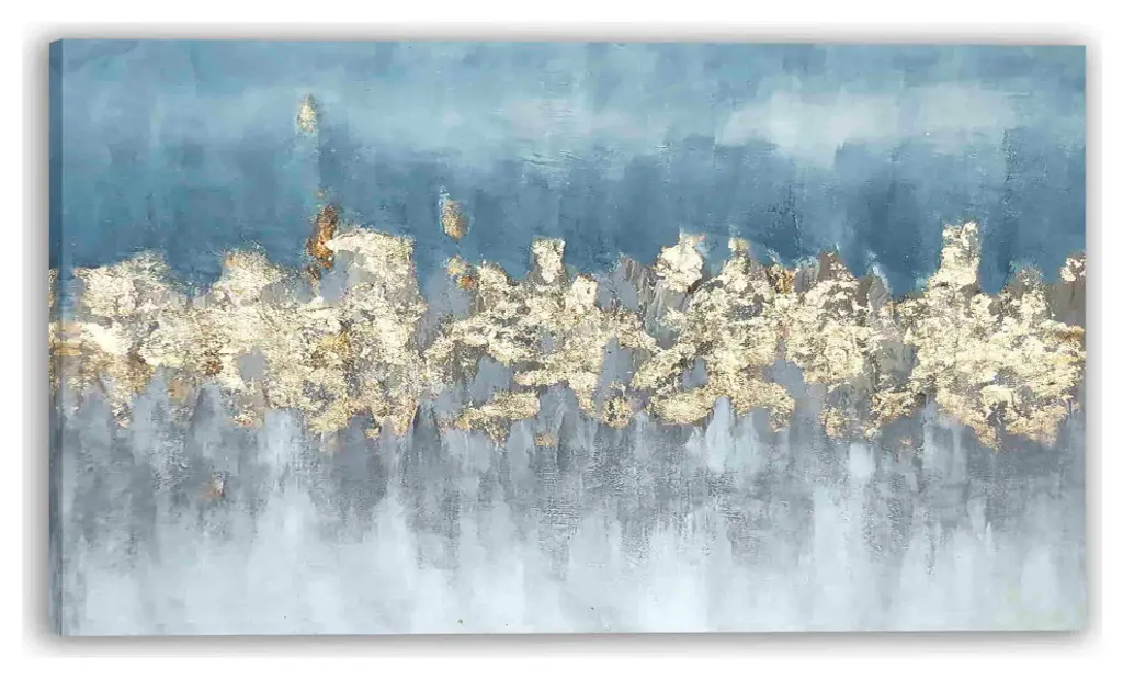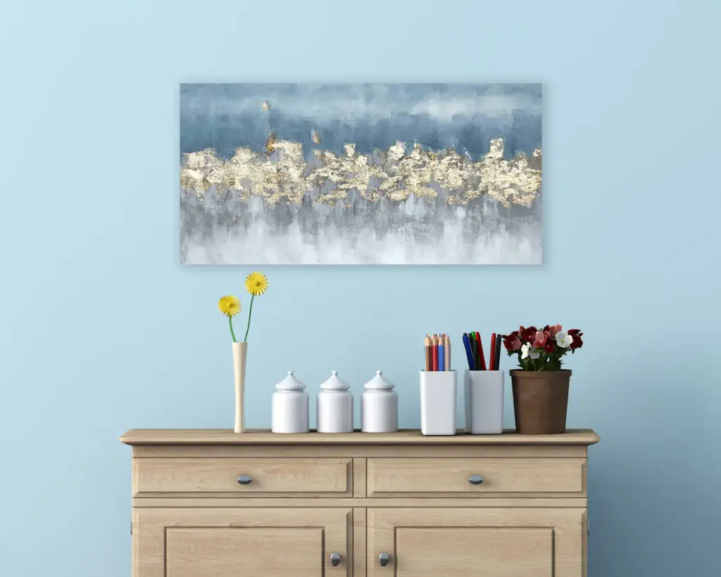 Step into a world of abstract elegance with ''Misty Gold Leaf Horizon'', a stunning hand-painted canvas that captures the ethereal interplay between nature and art. This original painting features a harmonious blend of cool blues and grays, contrasted with the rich texture of gold leaf detailing that adds a luxurious depth and shimmer to the piece.Crafted with high-grade acrylic paints and gold leaf on a quality stretched canvas, this artwork promises durability and a lasting impression. The gold leaf is meticulously applied, ensuring that each flicker of light reveals a new facet of its beauty, making your space feel alive and dynamic.The canvas measures an impressive size, perfect for creating an impactful visual statement in any room. It arrives ready to hang, with all the necessary hardware included, allowing for an effortless installation.''Misty Gold Leaf Horizon'' is not just a painting; it''s an investment in the ambiance of your home or office"”a statement piece that will captivate and inspire for years to come.